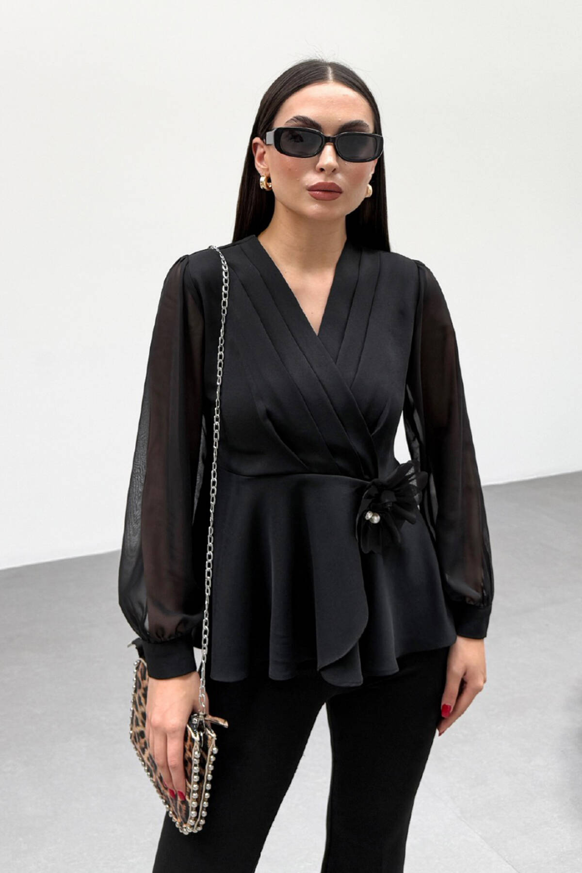 Siyah Kruvaze Yaka Taş Boncuk Detaylı Bluz 4202781.01
