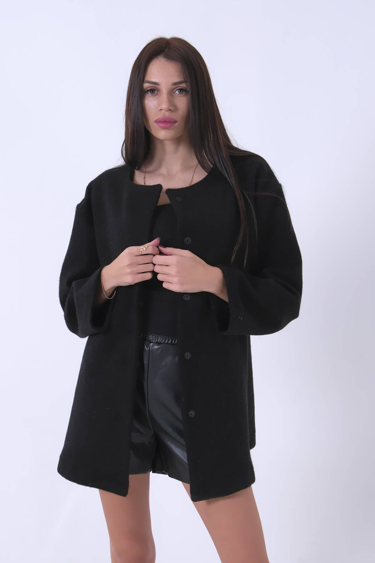 Siyah Gömlek Yakalı 4 Düğme Deri Bukle Detaylı Kaşe Yün Ceket 5307122.01