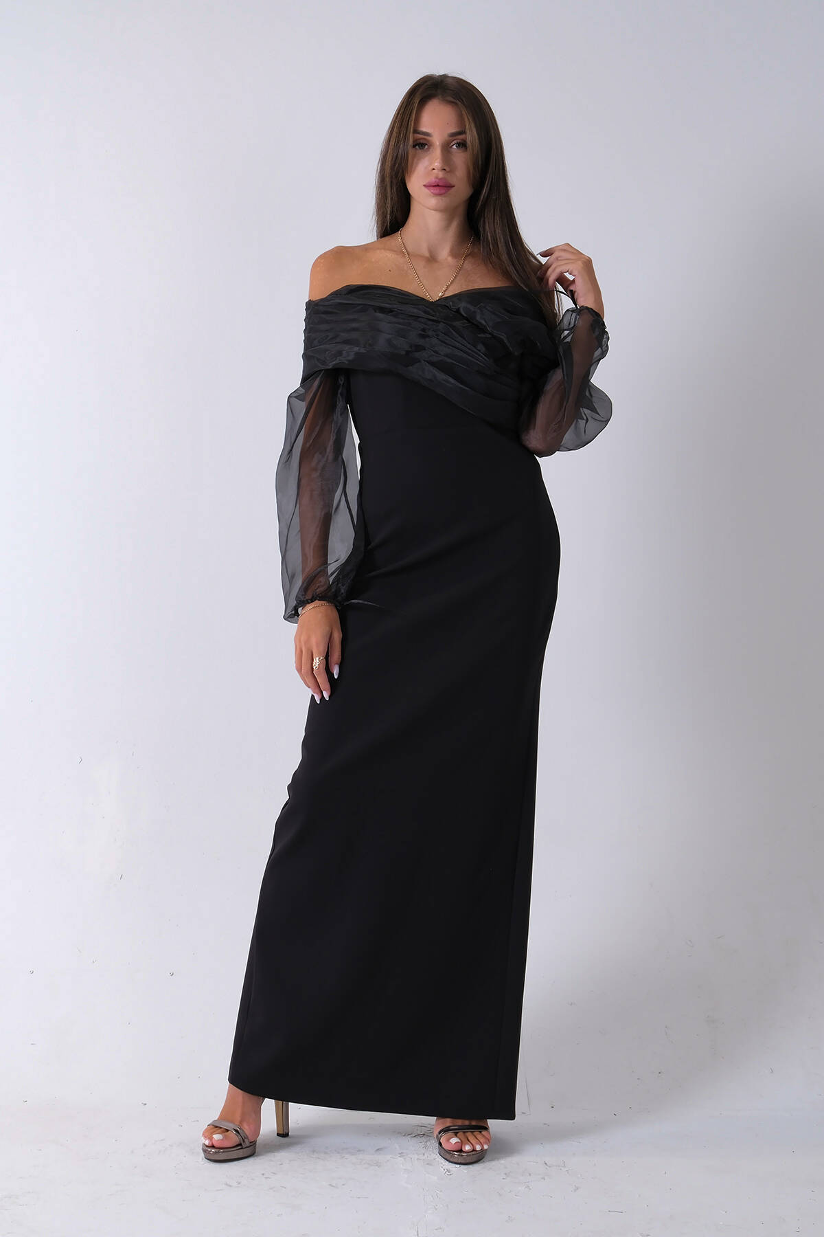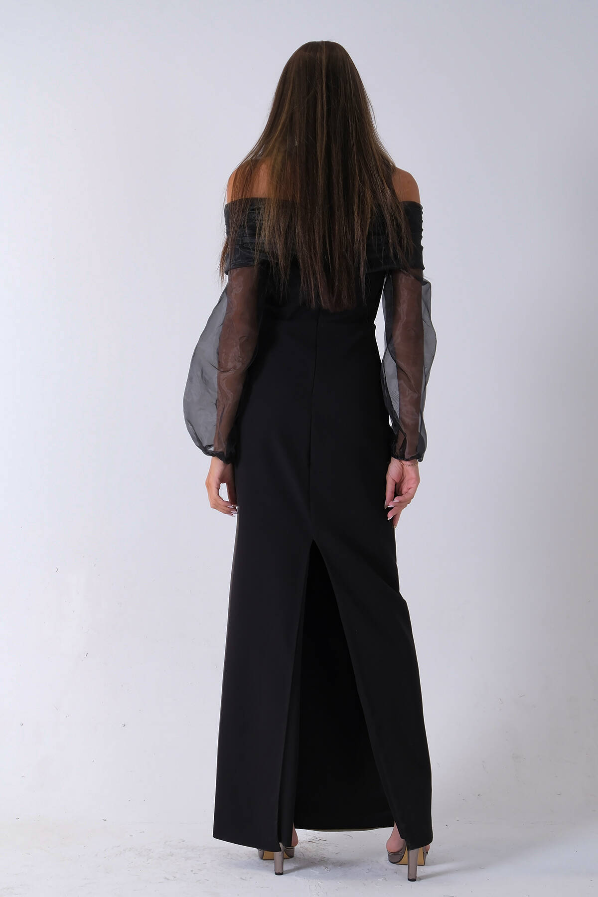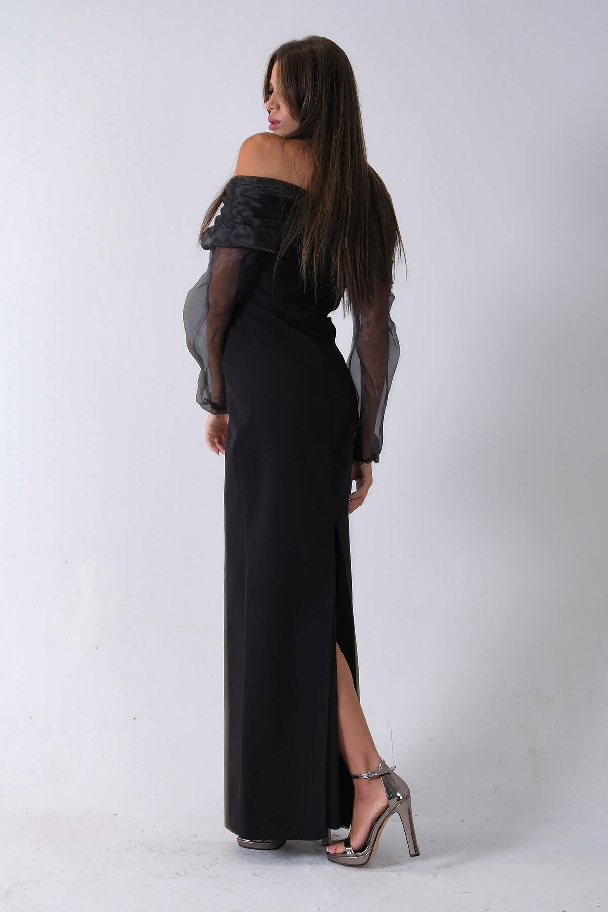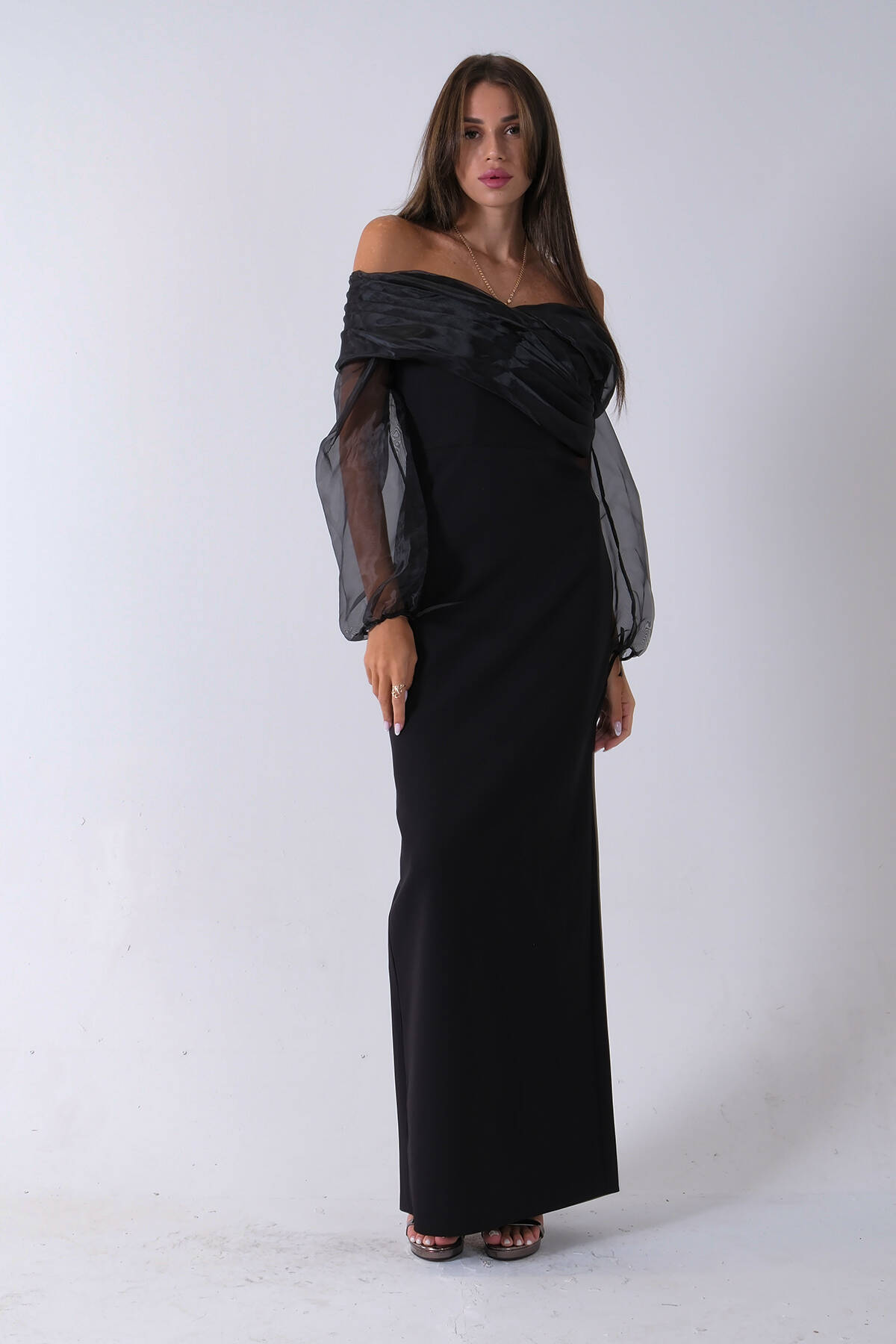 Siyah Organze Kol Detaylı Kayık Yaka Abiye 0801086.01
