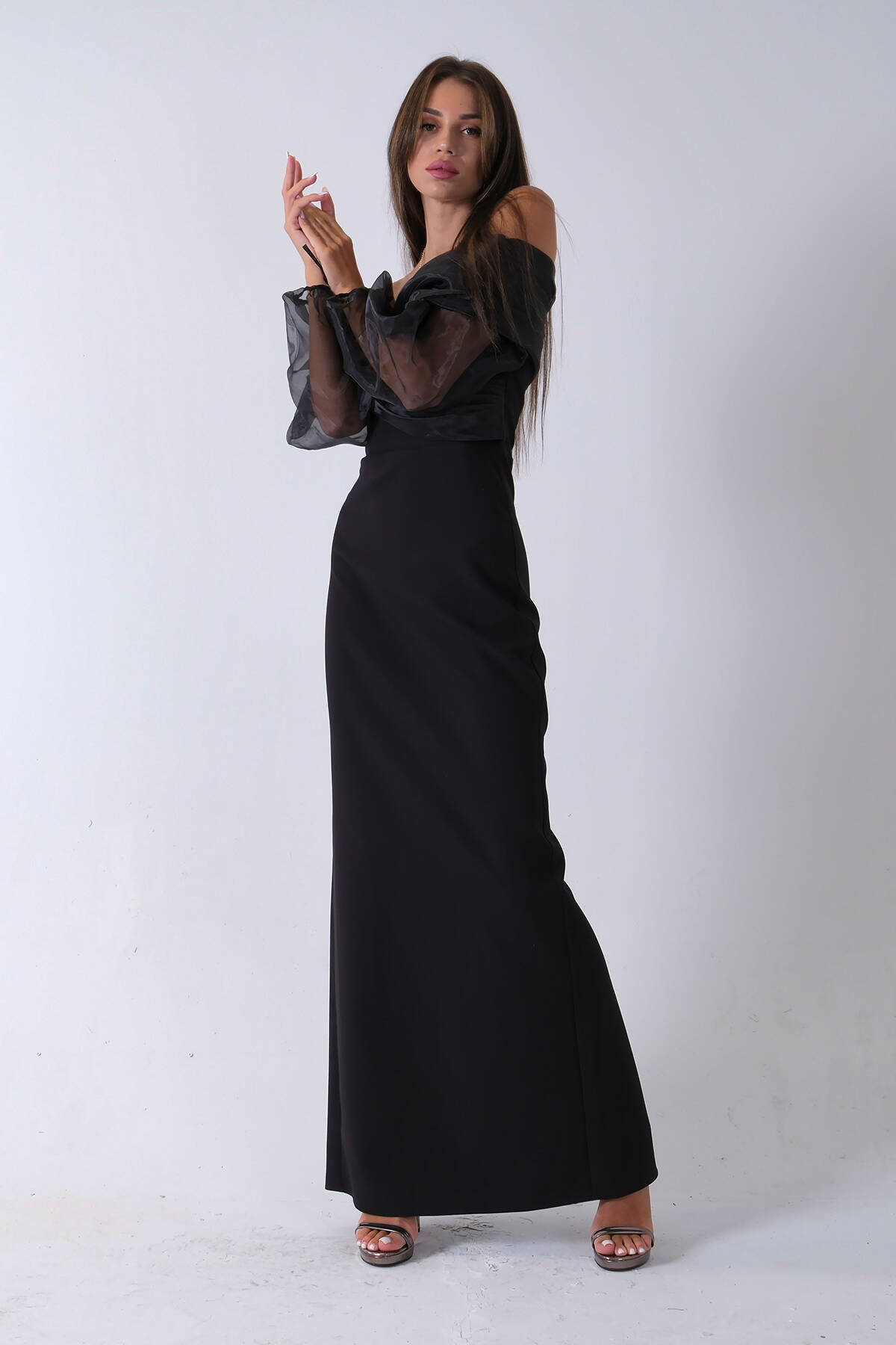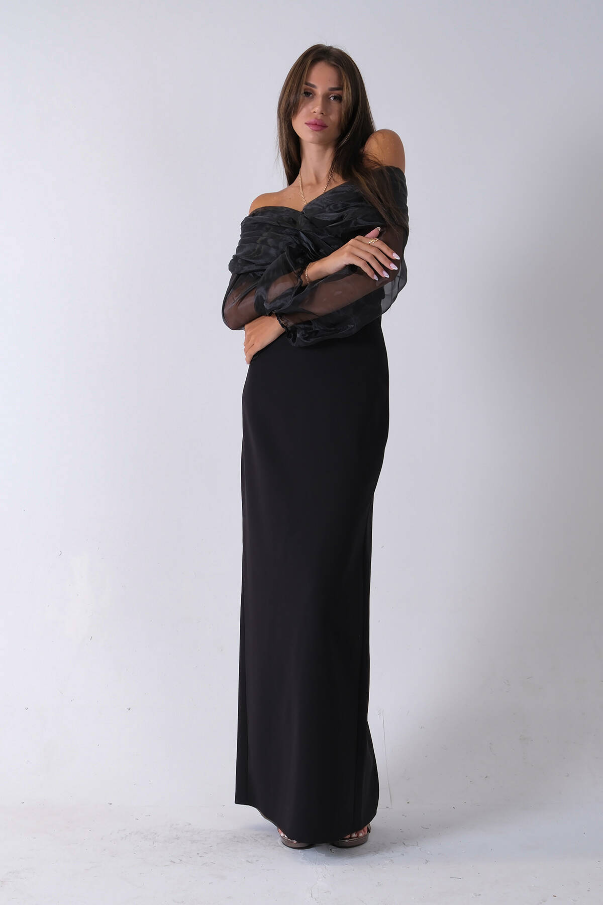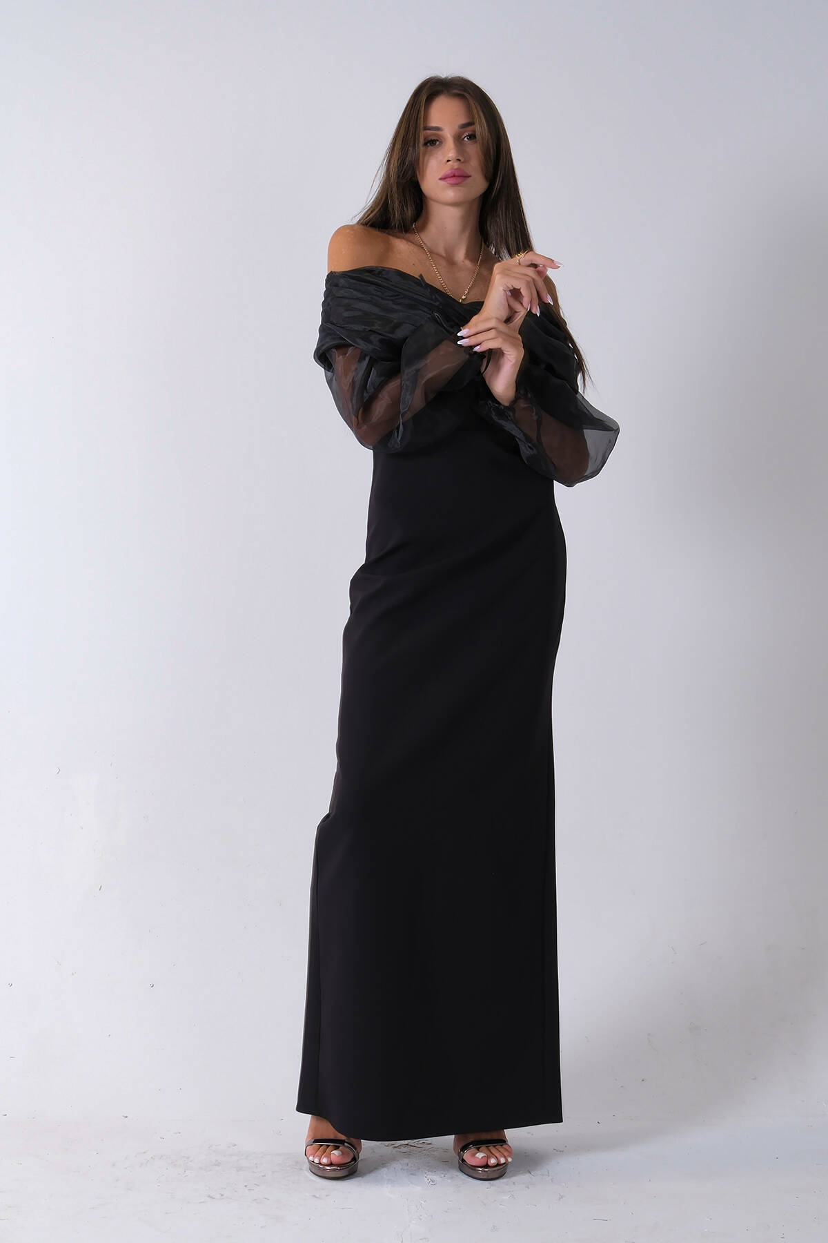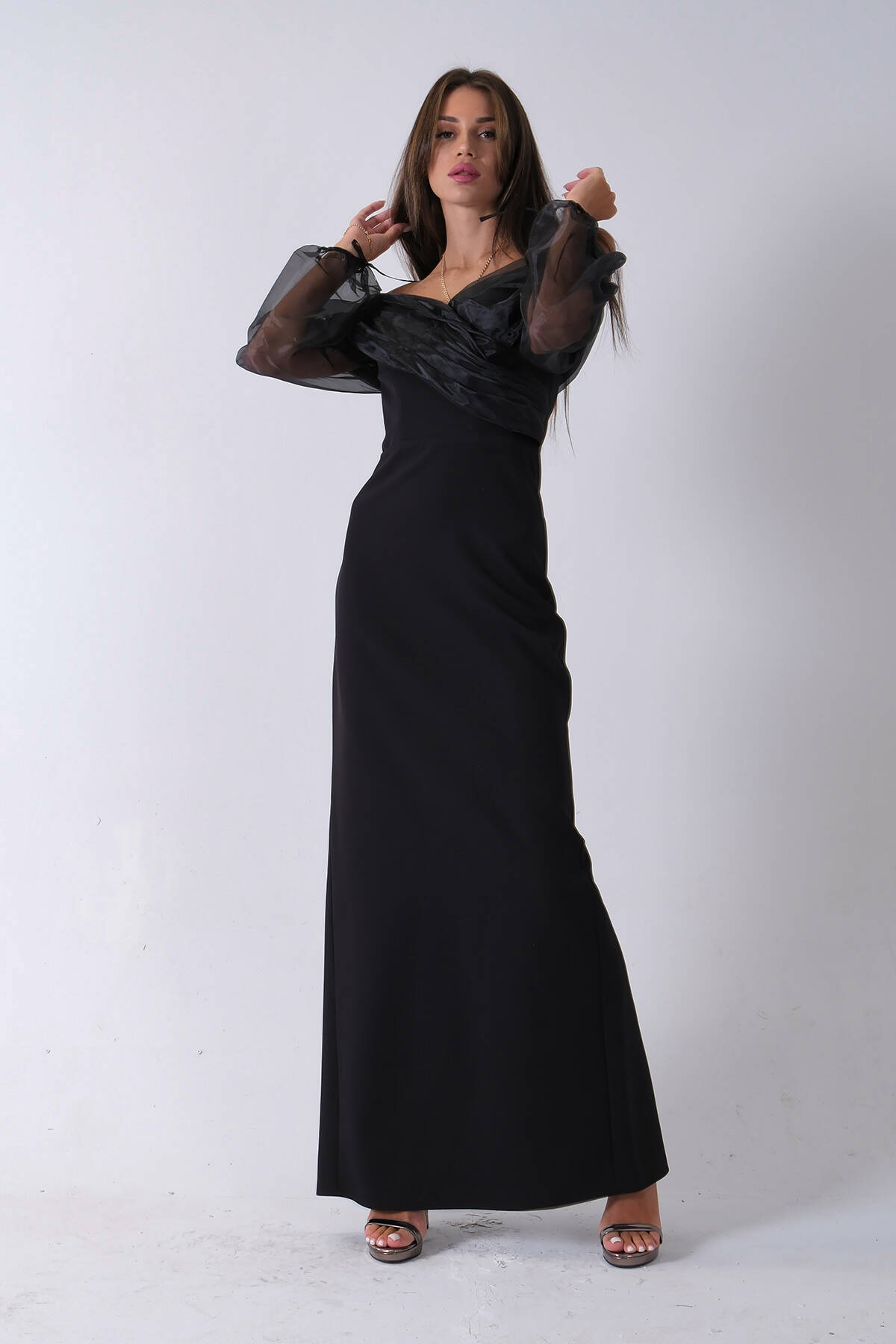 Siyah Organze Kol Detaylı Kayık Yaka Abiye 0801086.01
