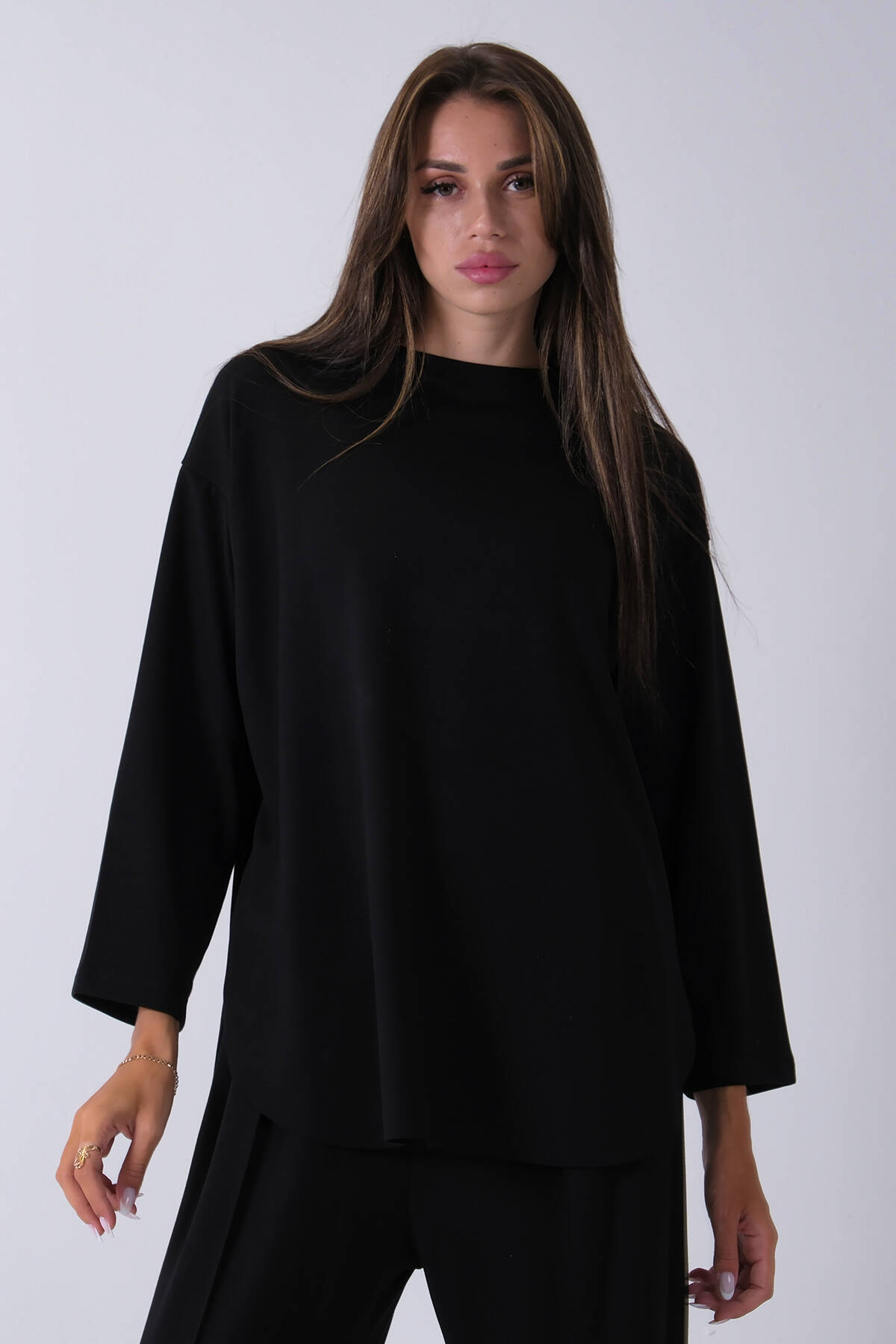 Siyah Tunik Yaka Fermuar Kapamalı File Detaylı Pantolonlu Takım 4577283.01
