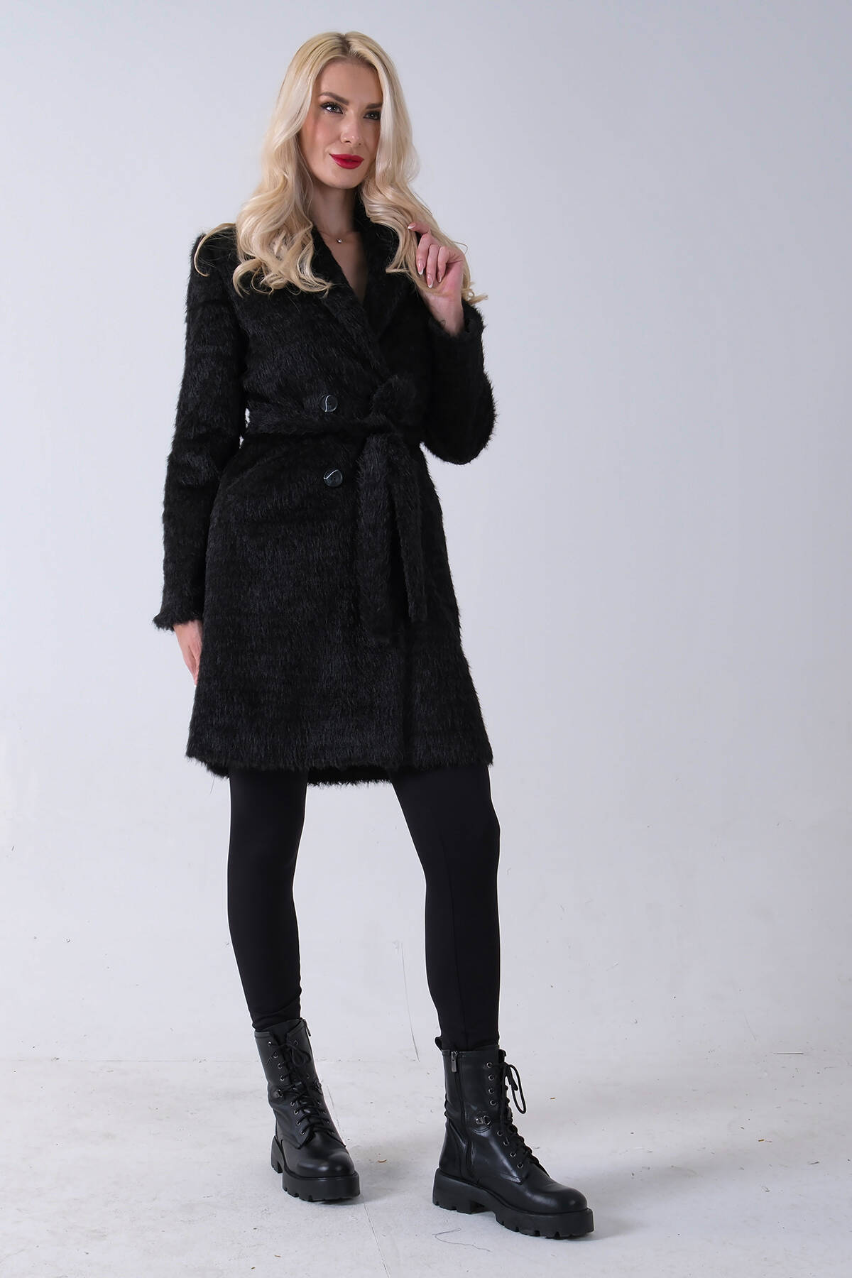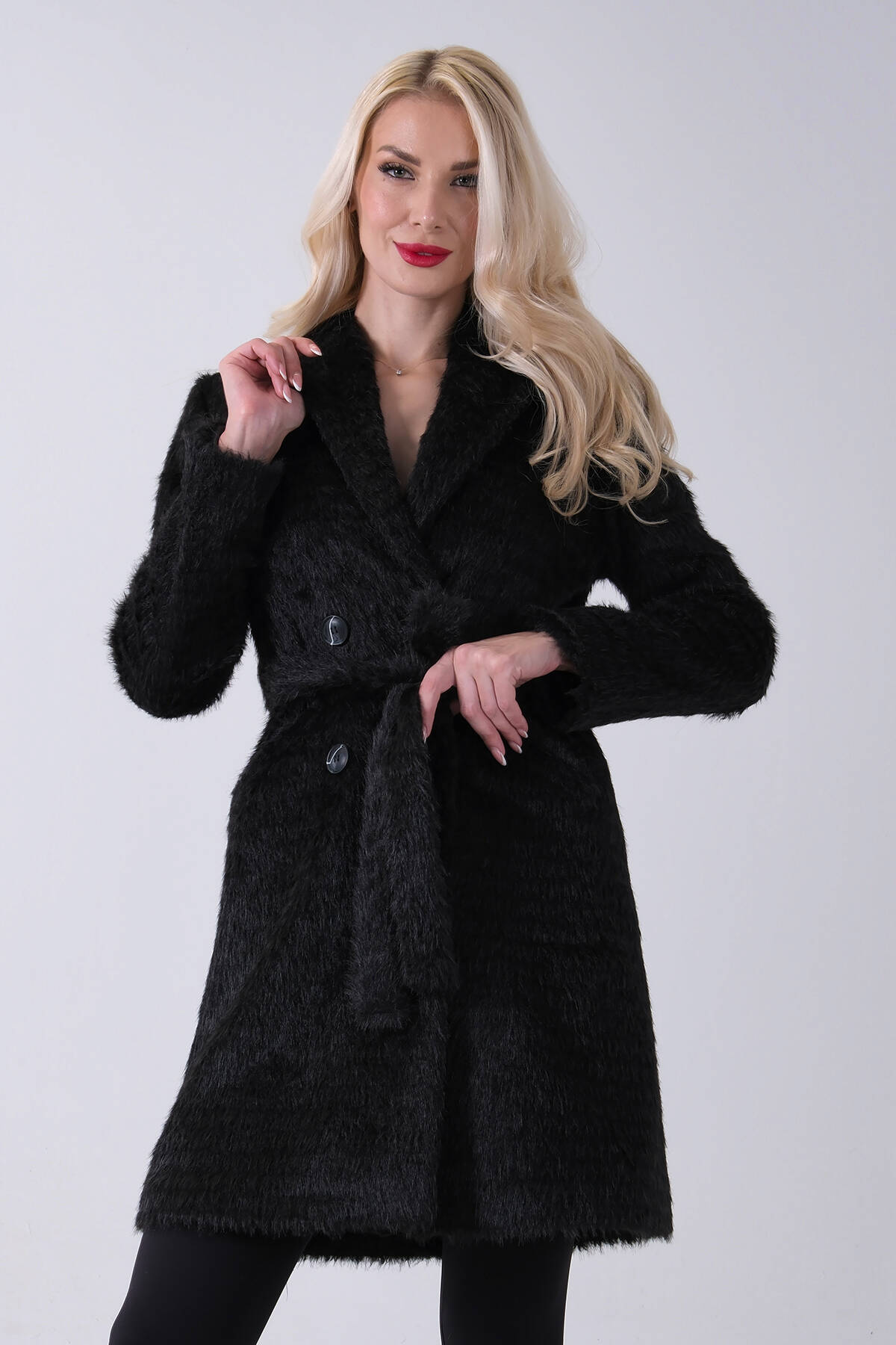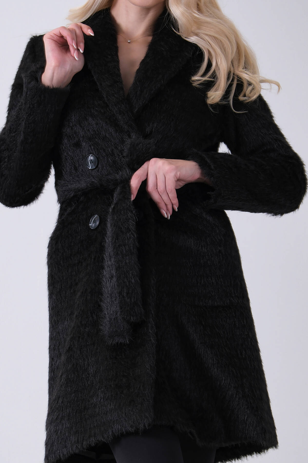 Siyah Yandan Cepli Broş Detaylı Yaka Kürklü Peluş Kaban 44510847.01
