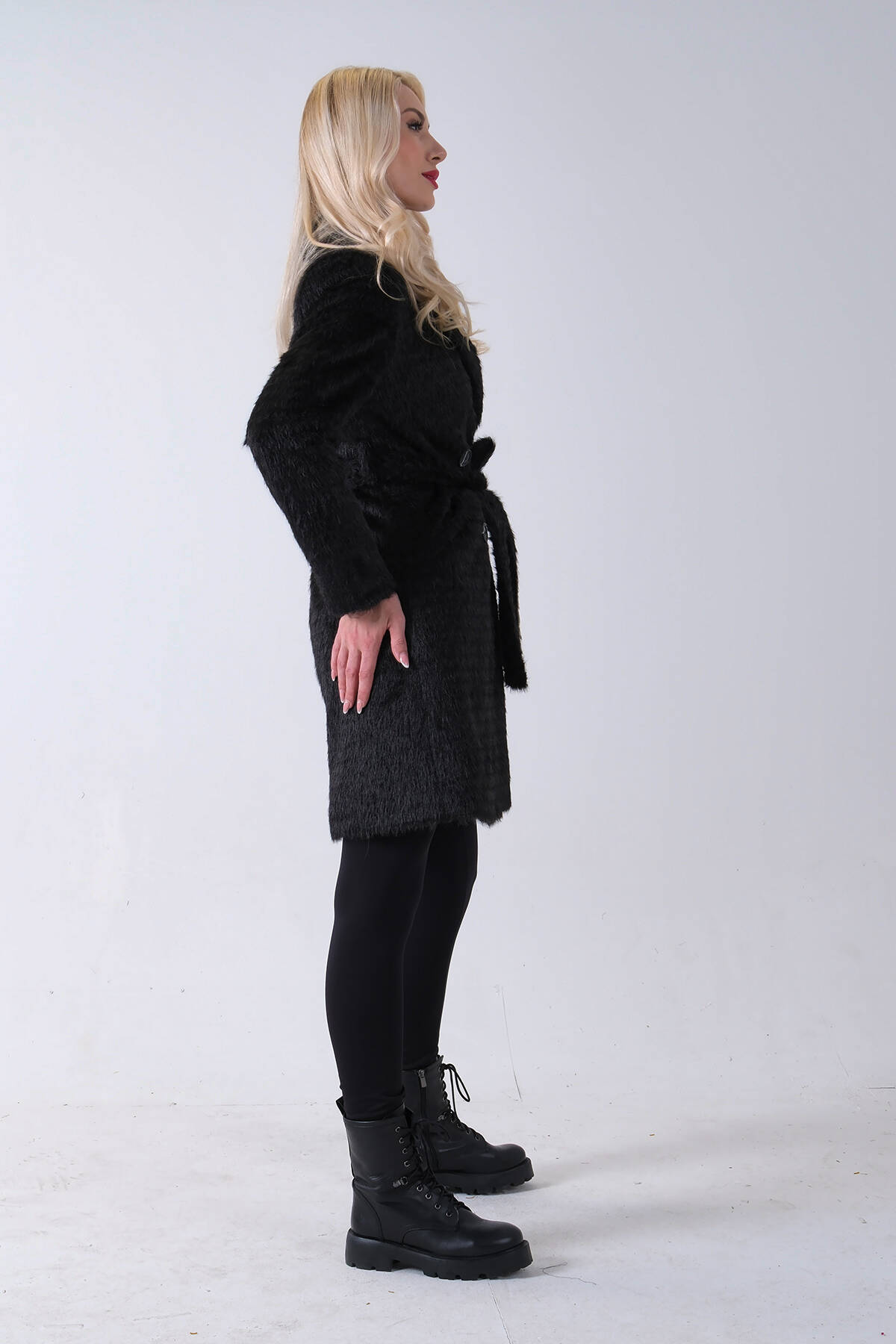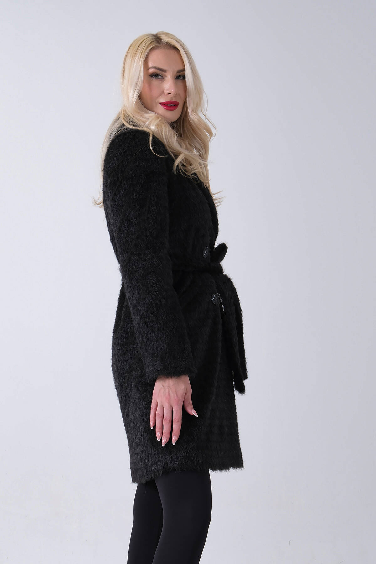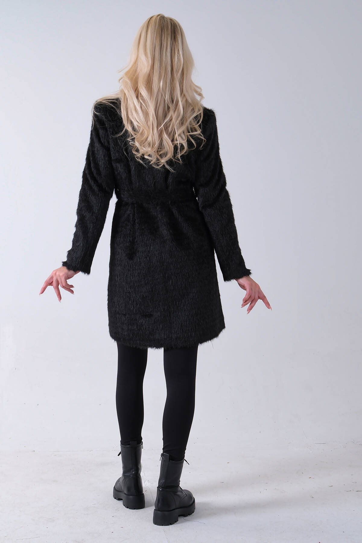 Siyah Şal Yaka Çift Cepli Düğme Kapamalı Kemerli Peluş Kaban 0108088.01