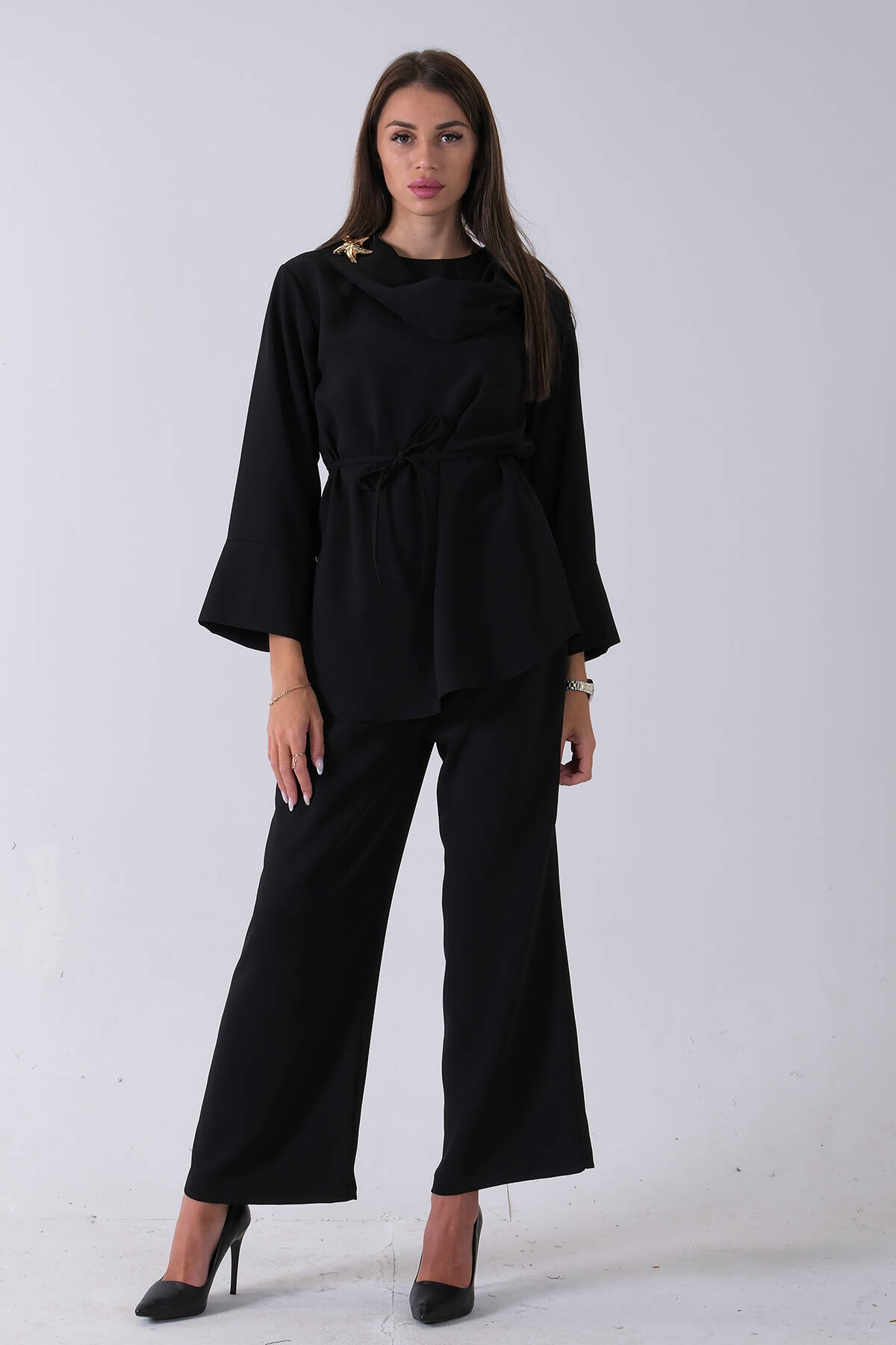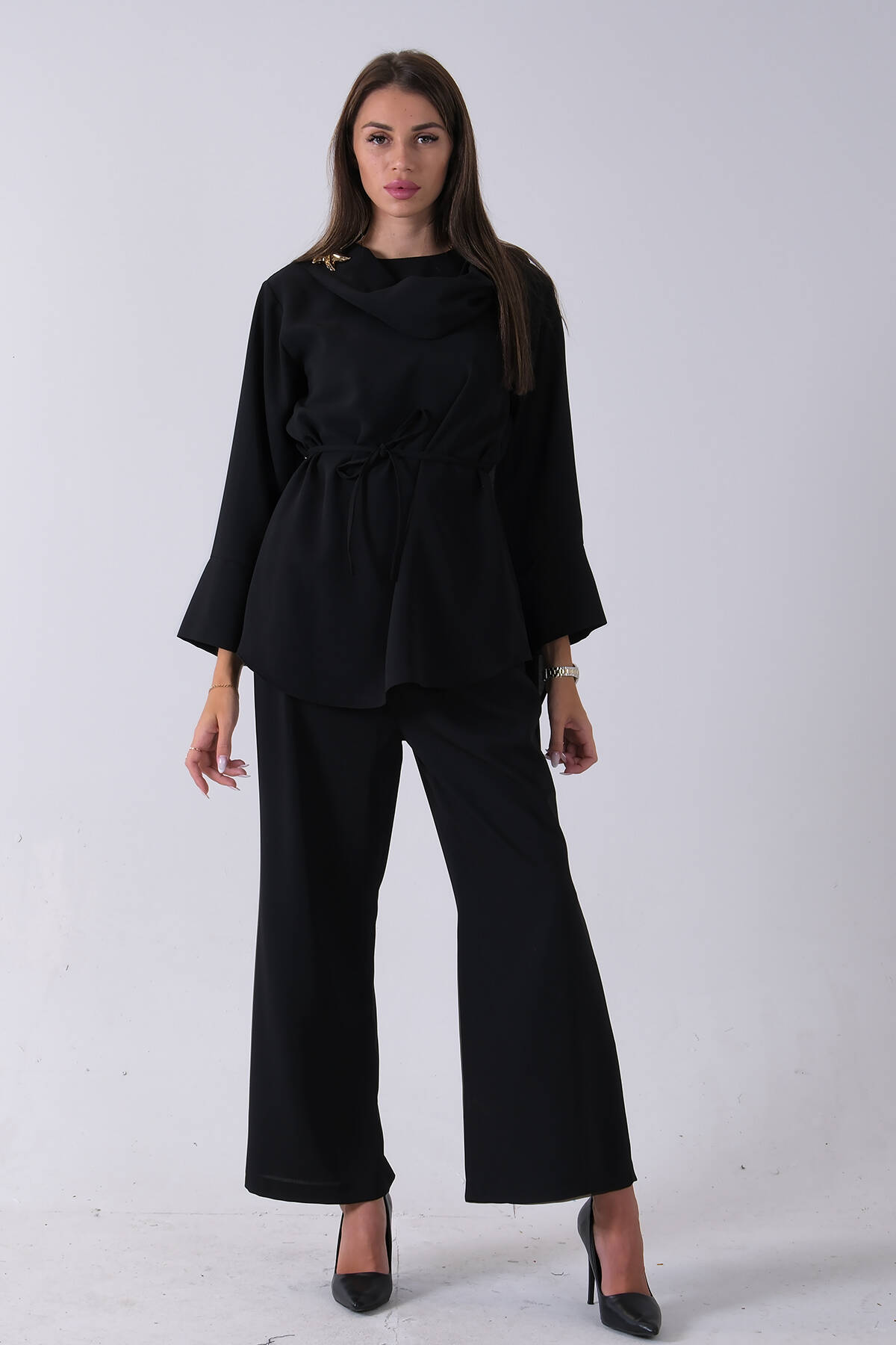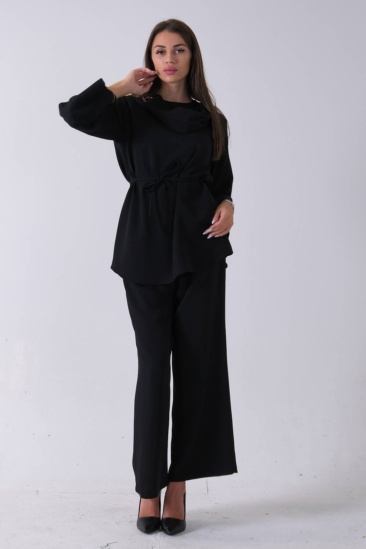 Siyah Tunik Yaka Fermuar Kapamalı File Detaylı Pantolonlu Takım 4577283.01
