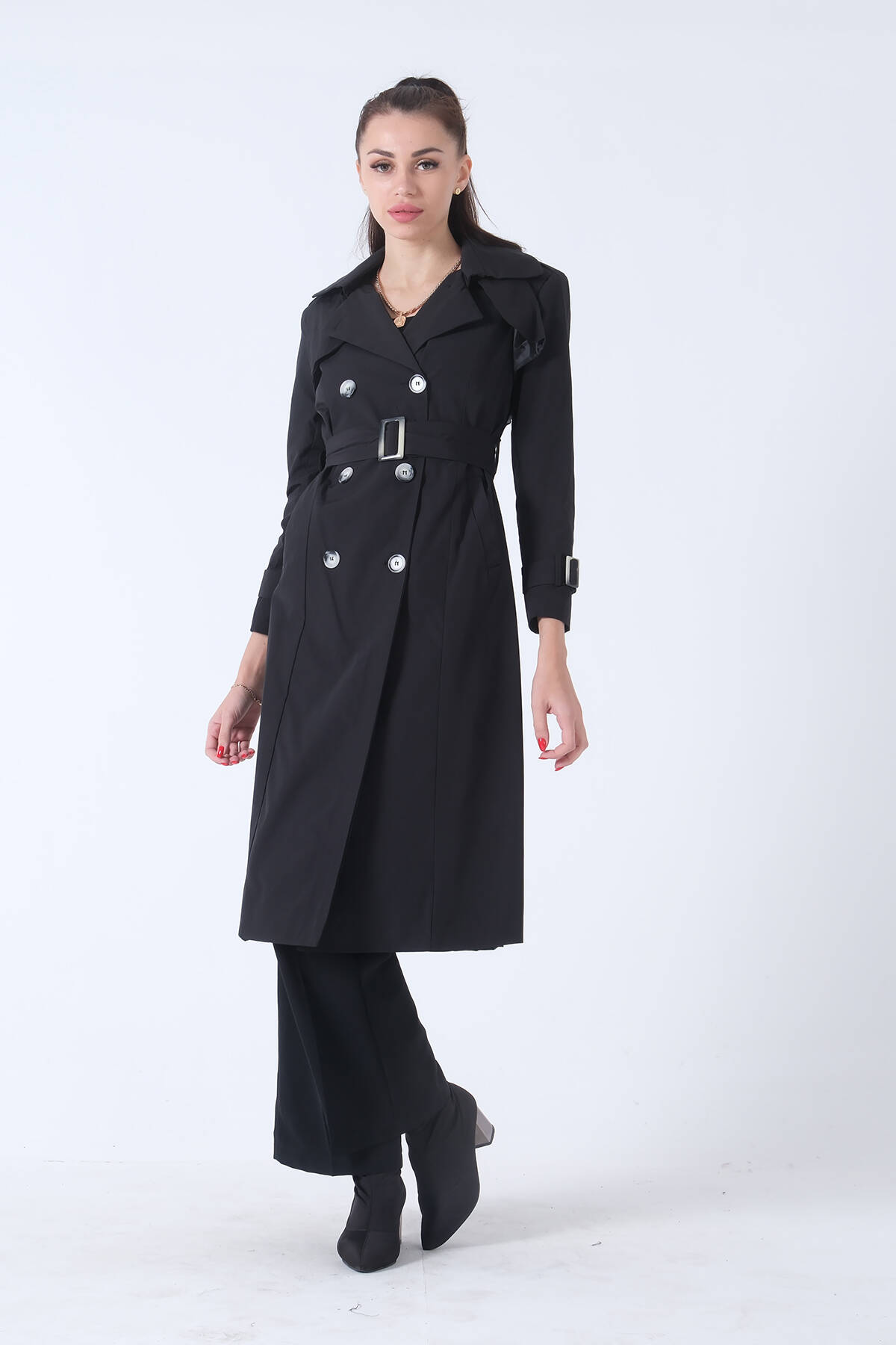 Su Geçirmez Uzun Katlı Yaka Omuz ve Manşet Bant Detaylı Çift Cepli Slim Trençkot