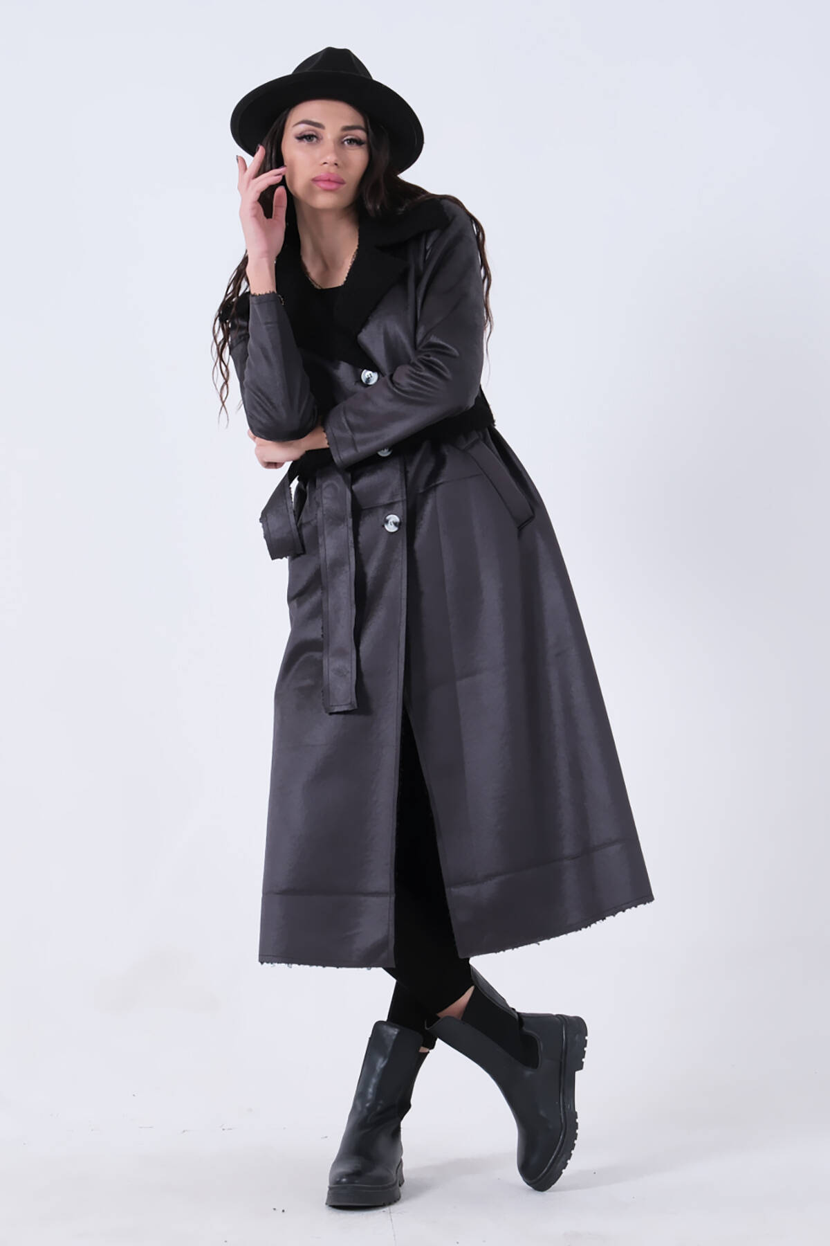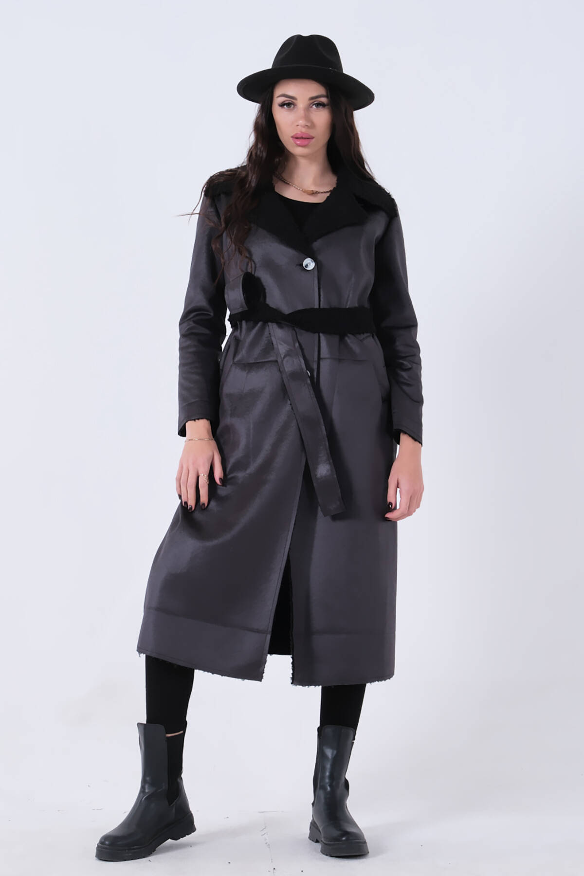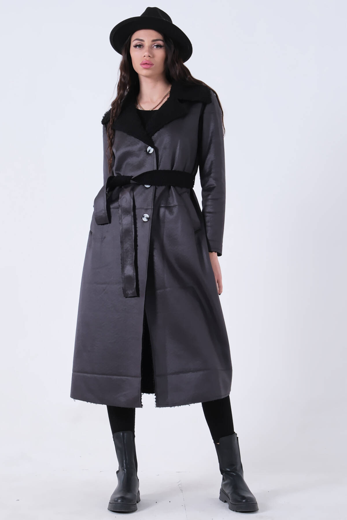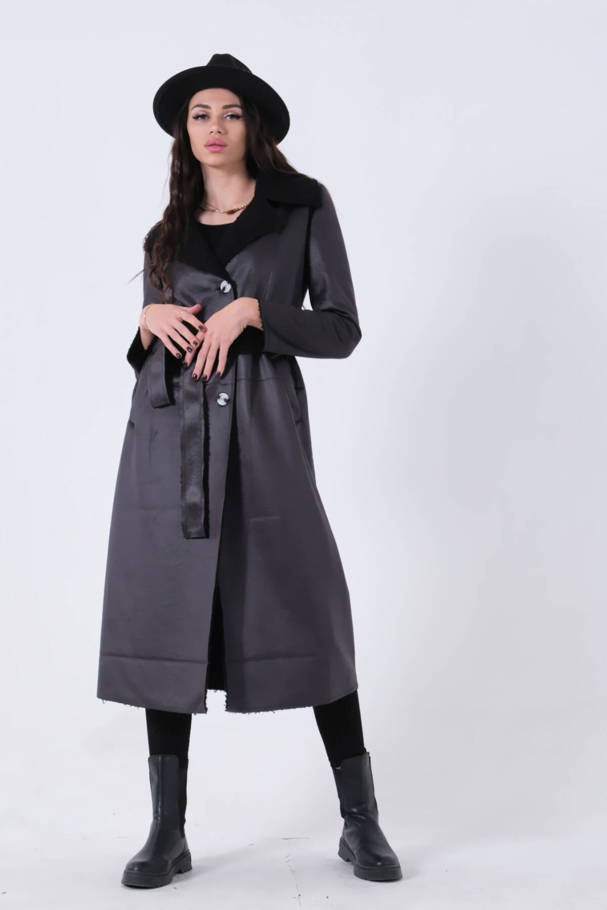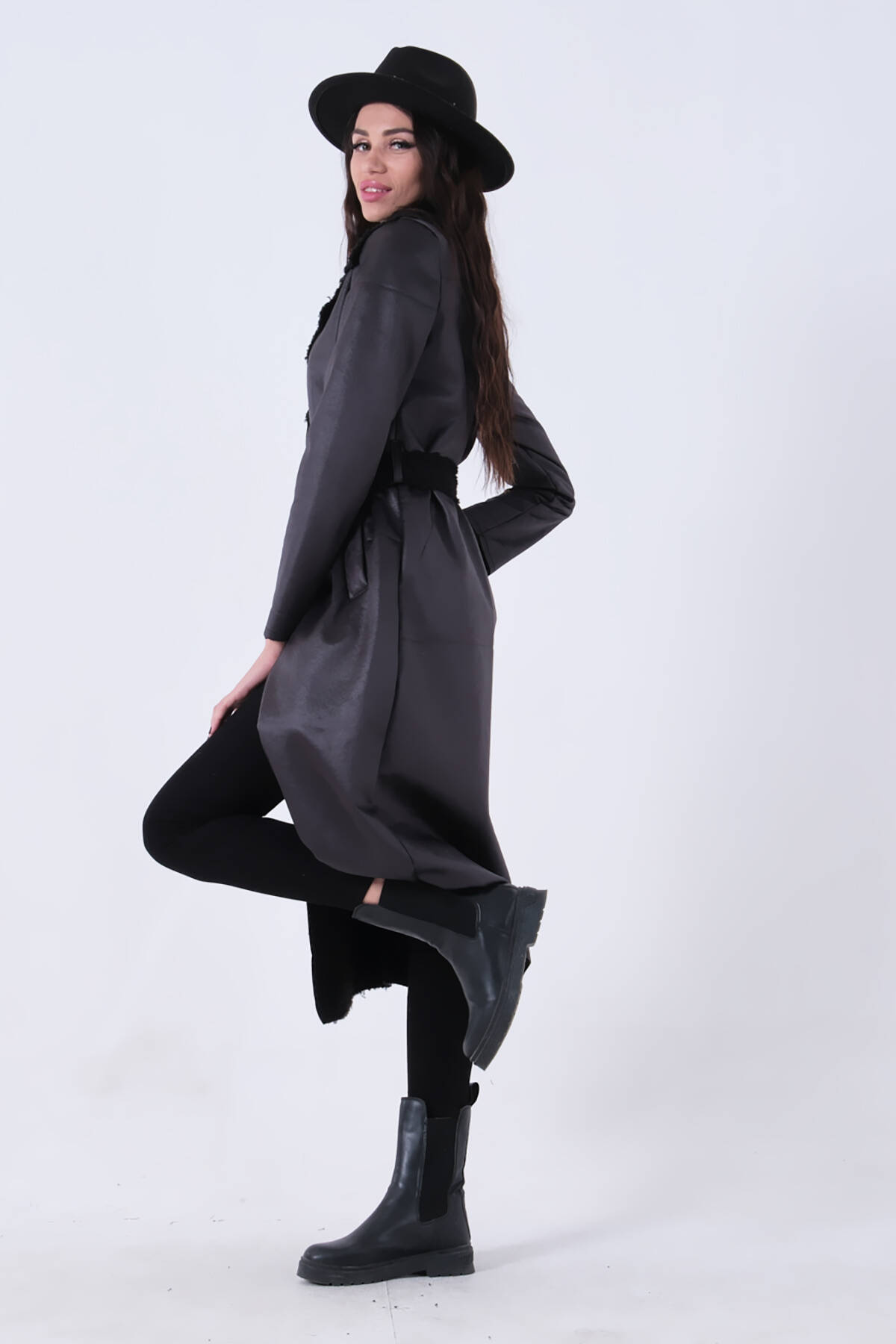 Gri Şal Yaka Çift Cepli Düğme Kapamalı Kemerli Peluş Kaban 0108088.06
