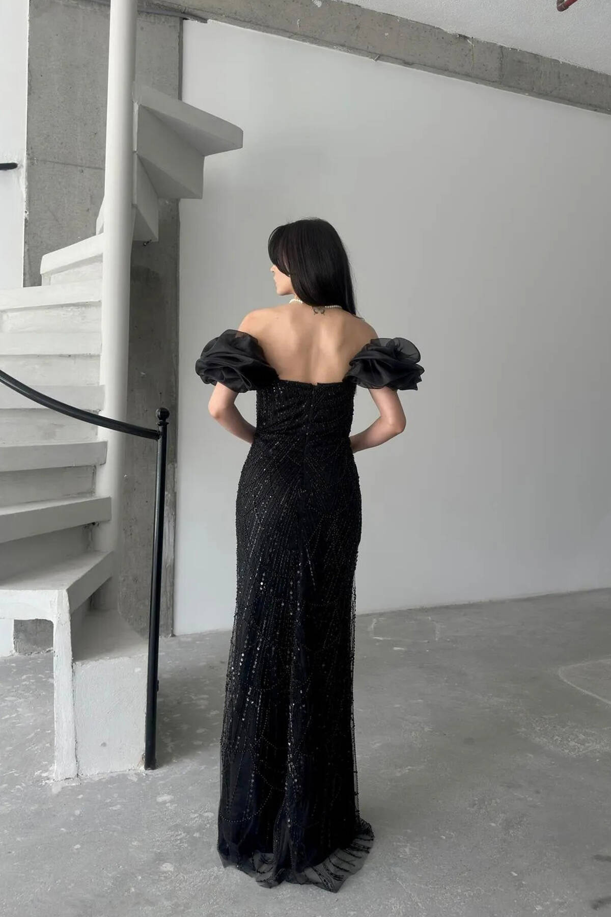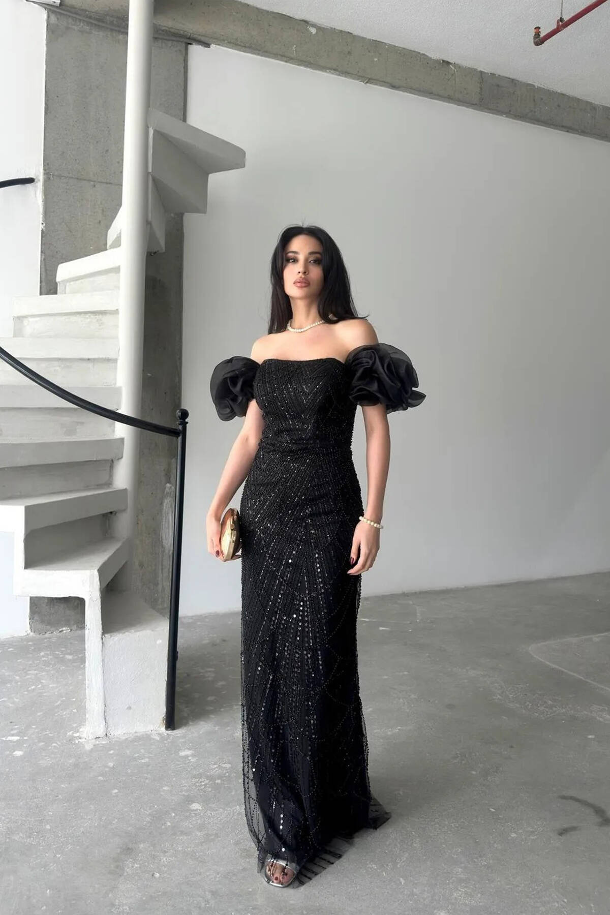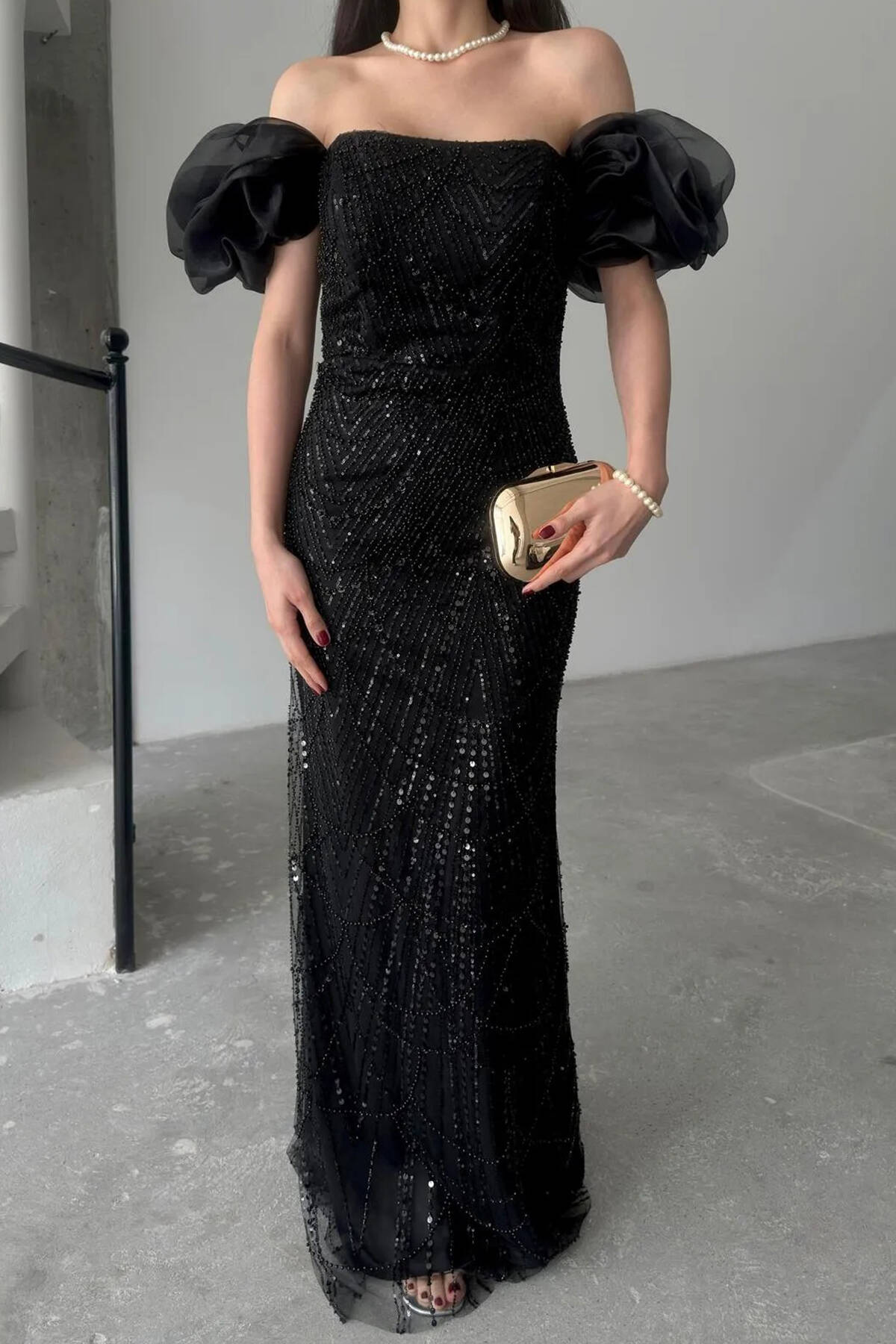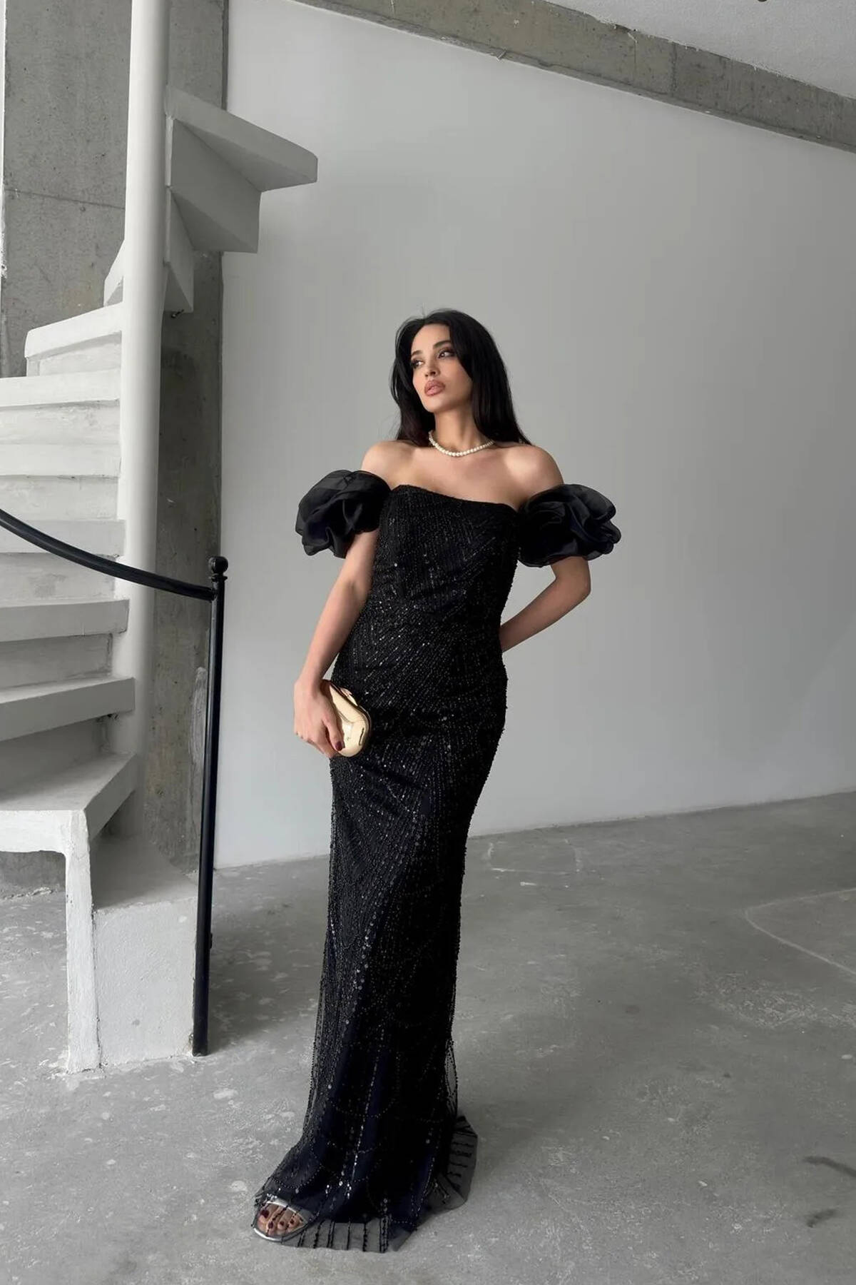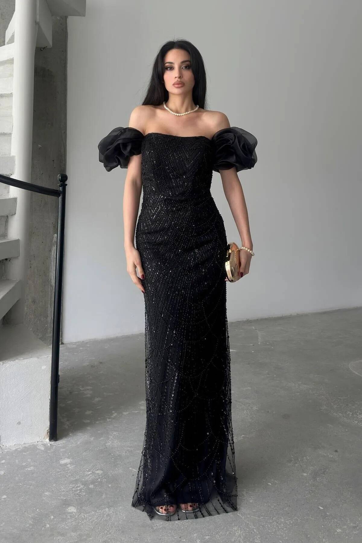 Siyah Taş İşlemeli Balon Kol Abiye 0801053.01