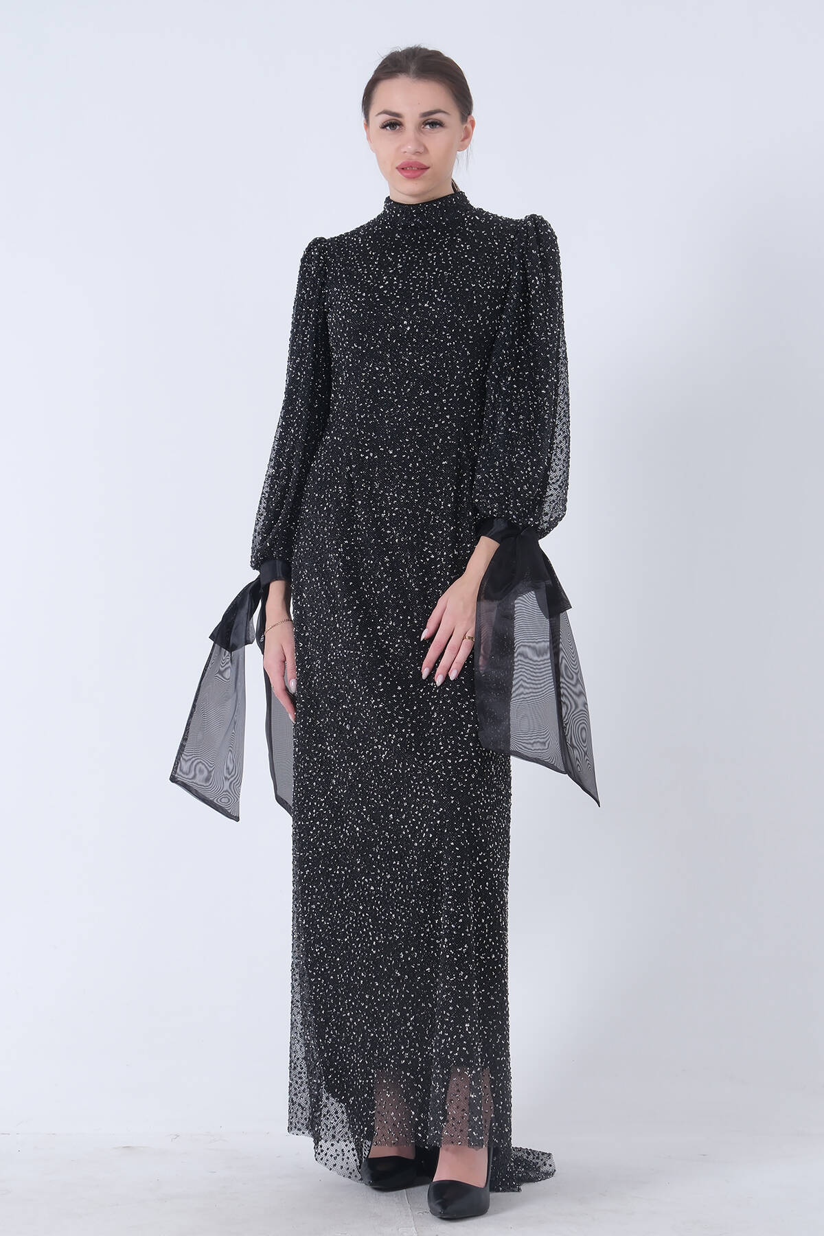 Siyah Çiçek Detaylı Pul Boncuk İşlemeli Kuyruklu Abiye 9705650.01