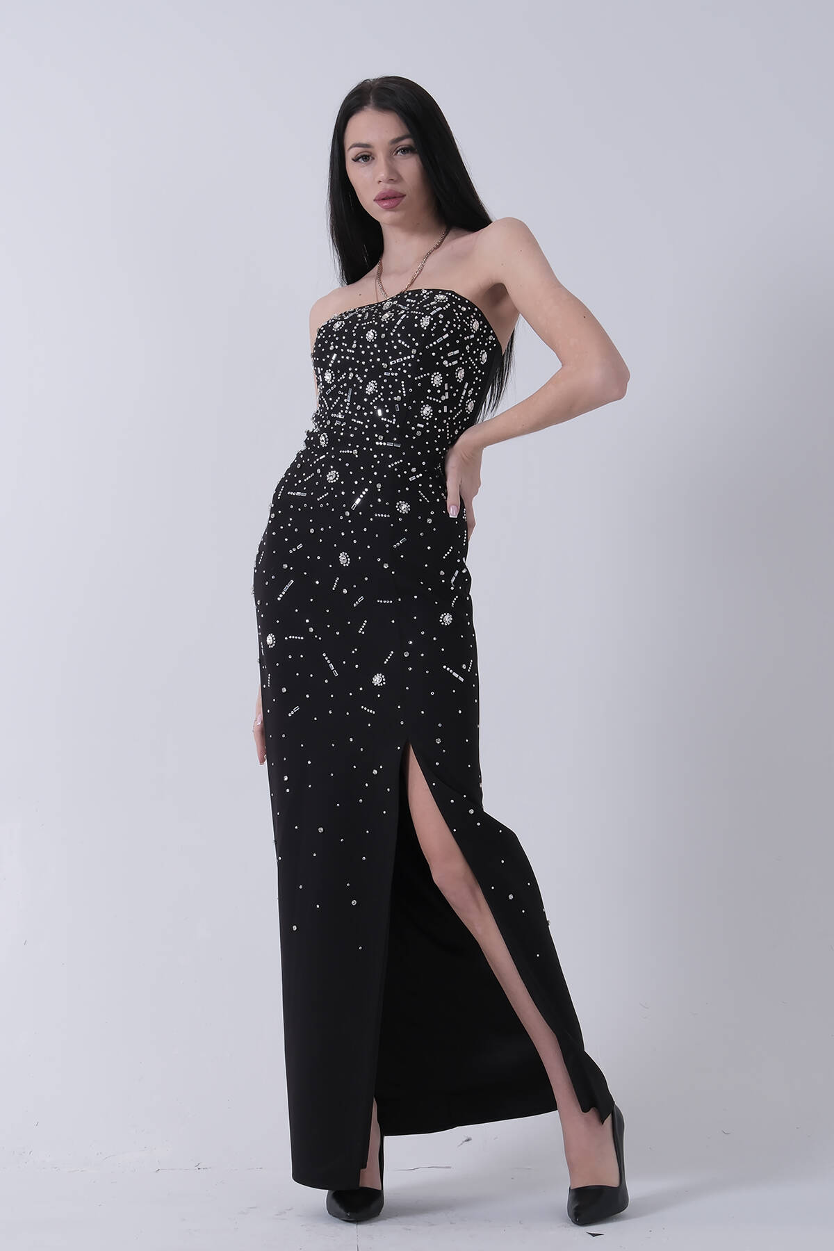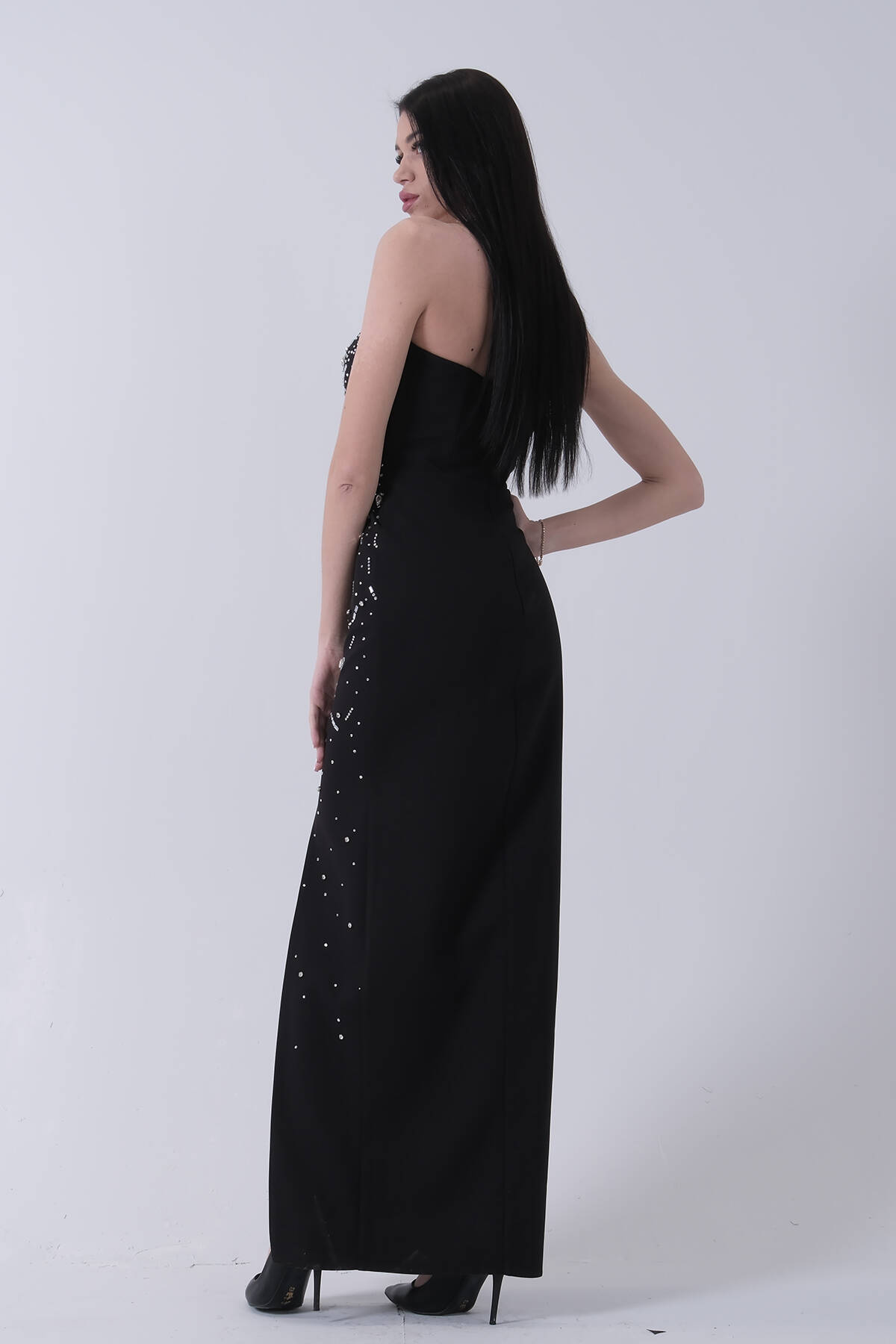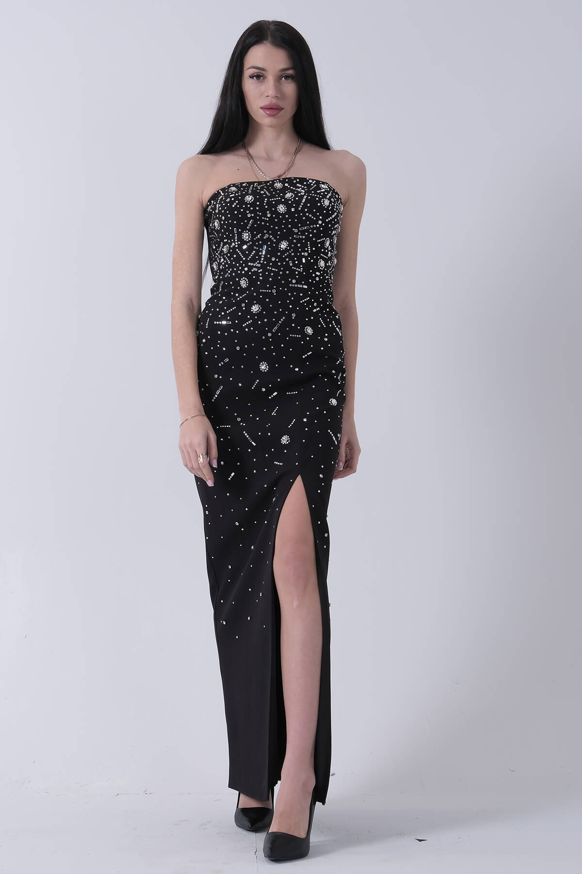 Siyah Taş İşlemeli Straplez Yırtmaçlı Abiye 0801045.01