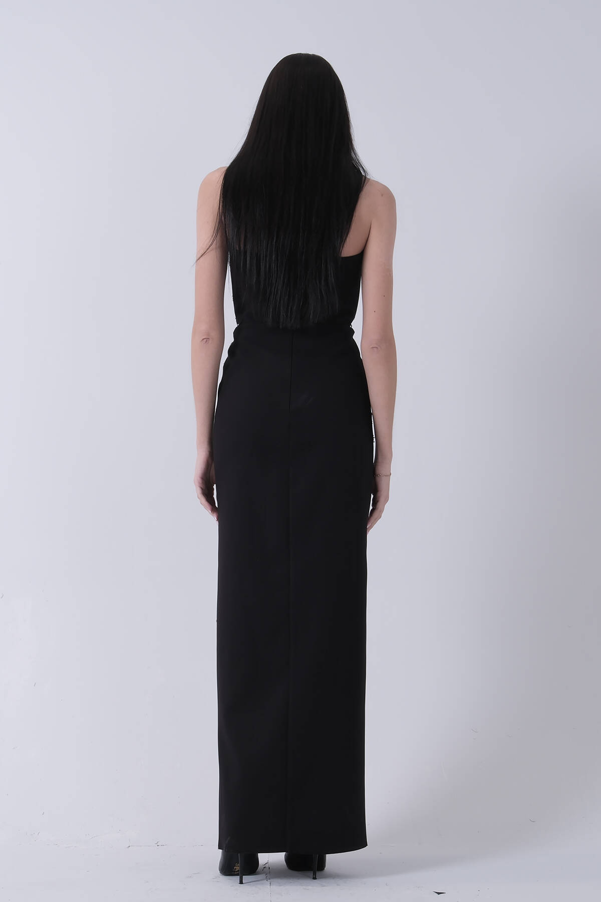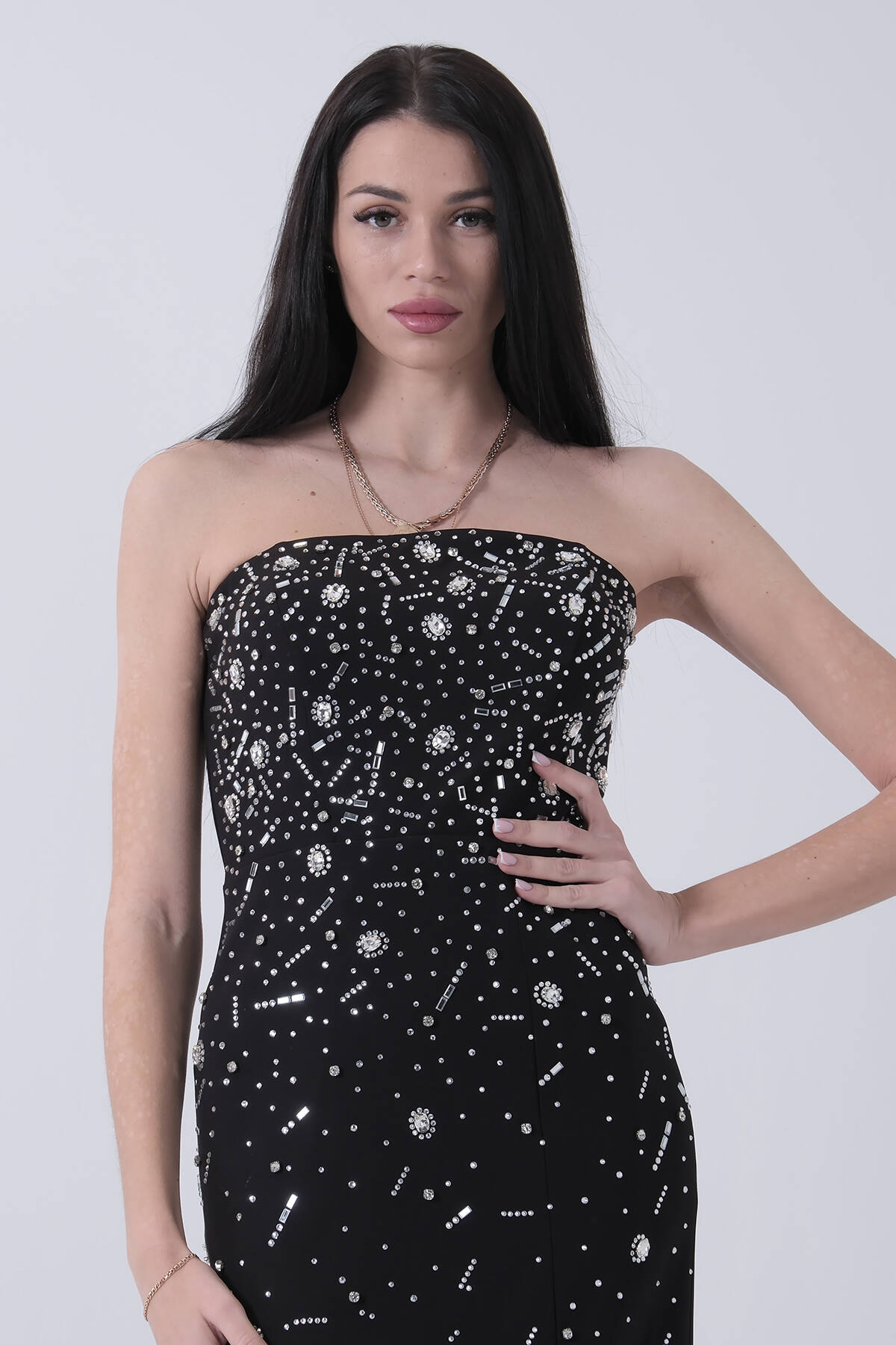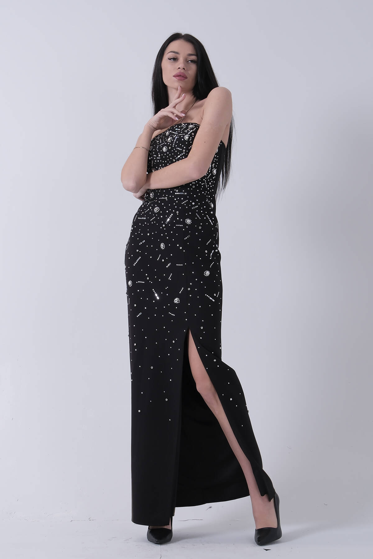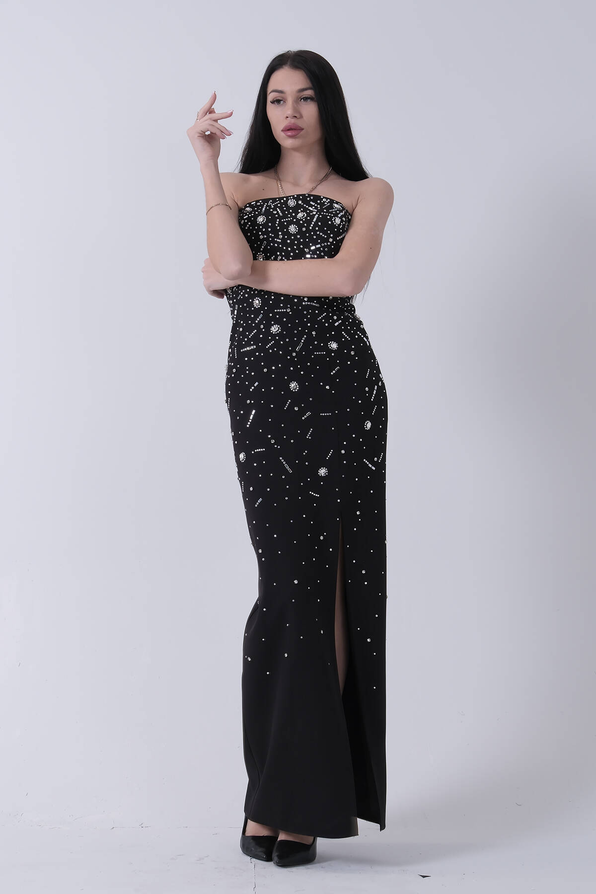 Siyah Taş İşlemeli Straplez Yırtmaçlı Abiye 0801045.01