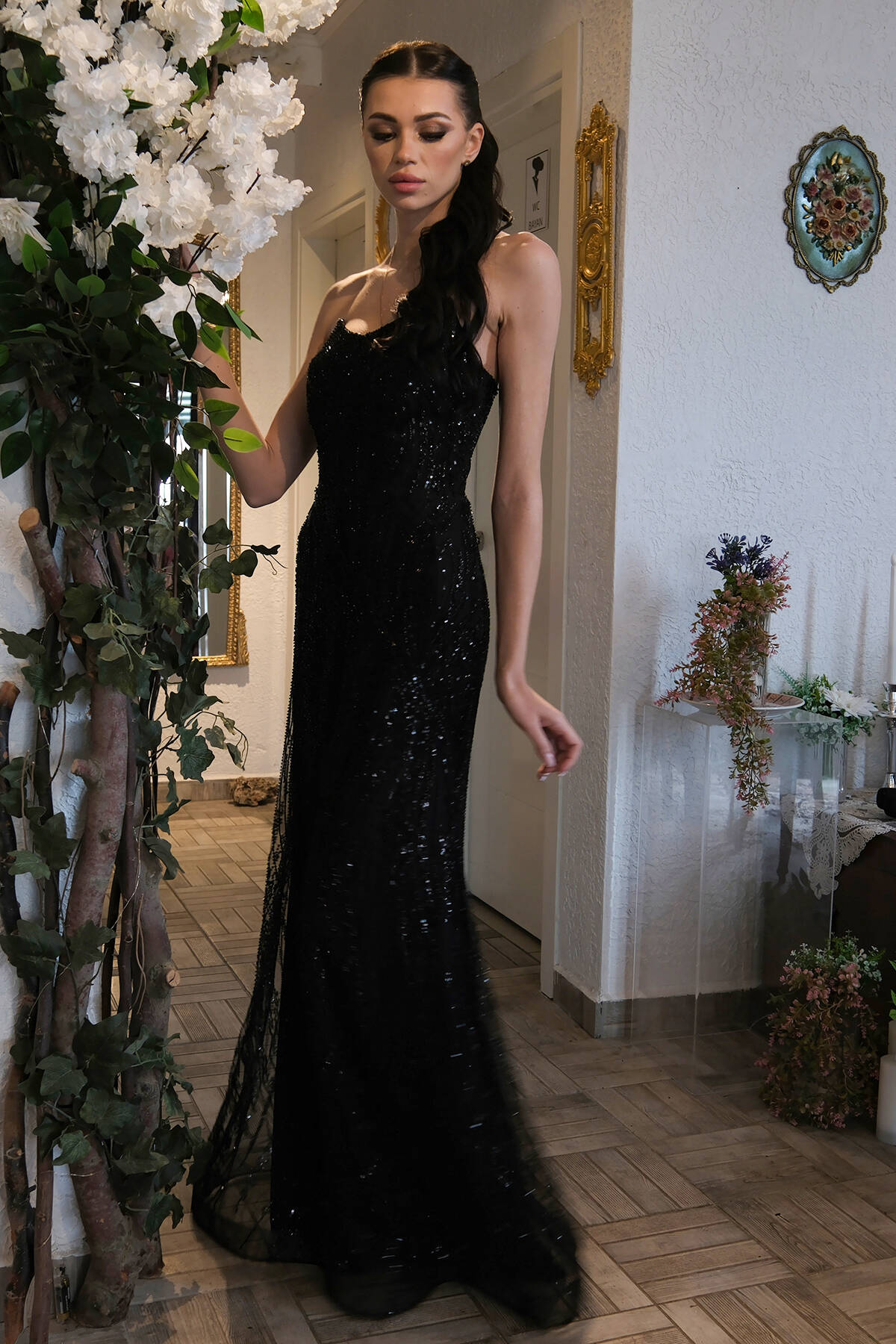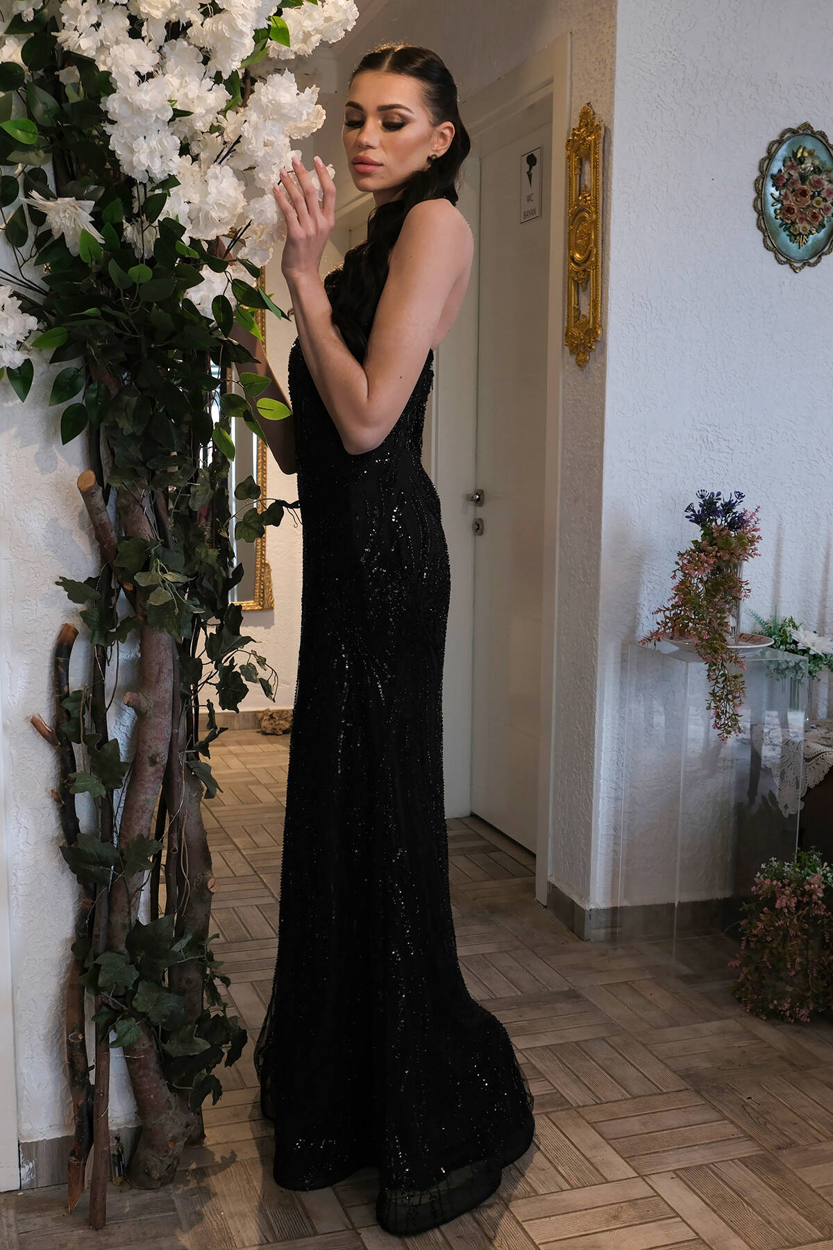 Siyah Taş İşlemeli Uzun Balık Abiye 0801056.01