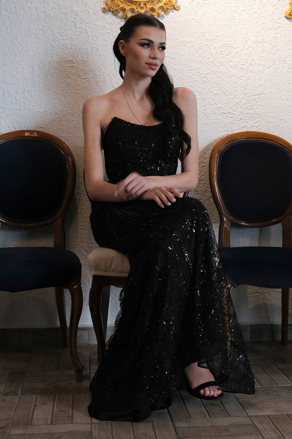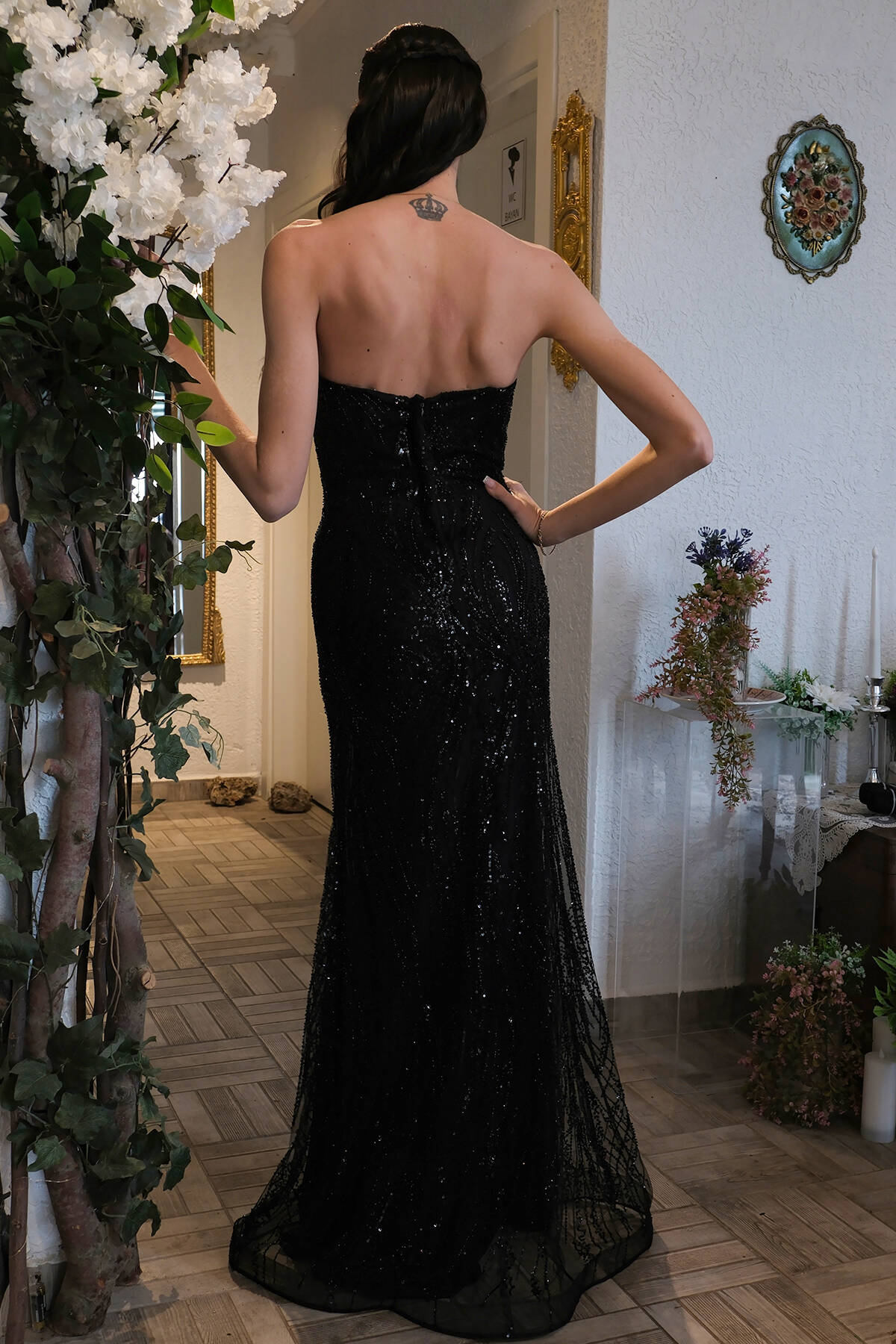 Siyah Önü Taş Detaylı Yırtmaçlı Pul Payet Straplez Abiye 0801163.01