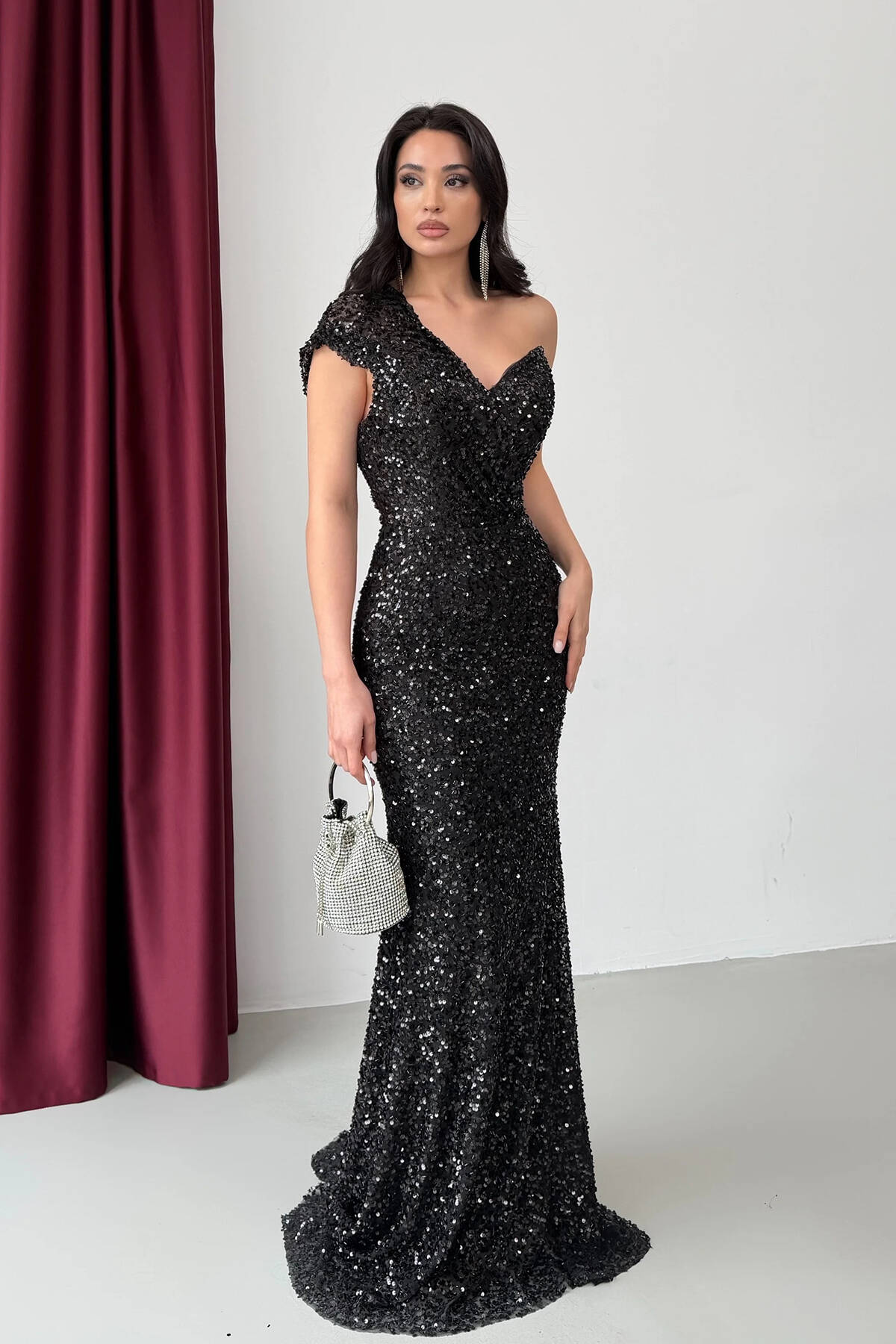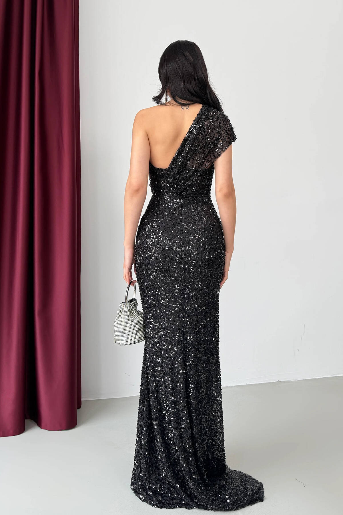 Siyah Tek Omuz Pul Payetli Straplez Abiye 0801130.01
