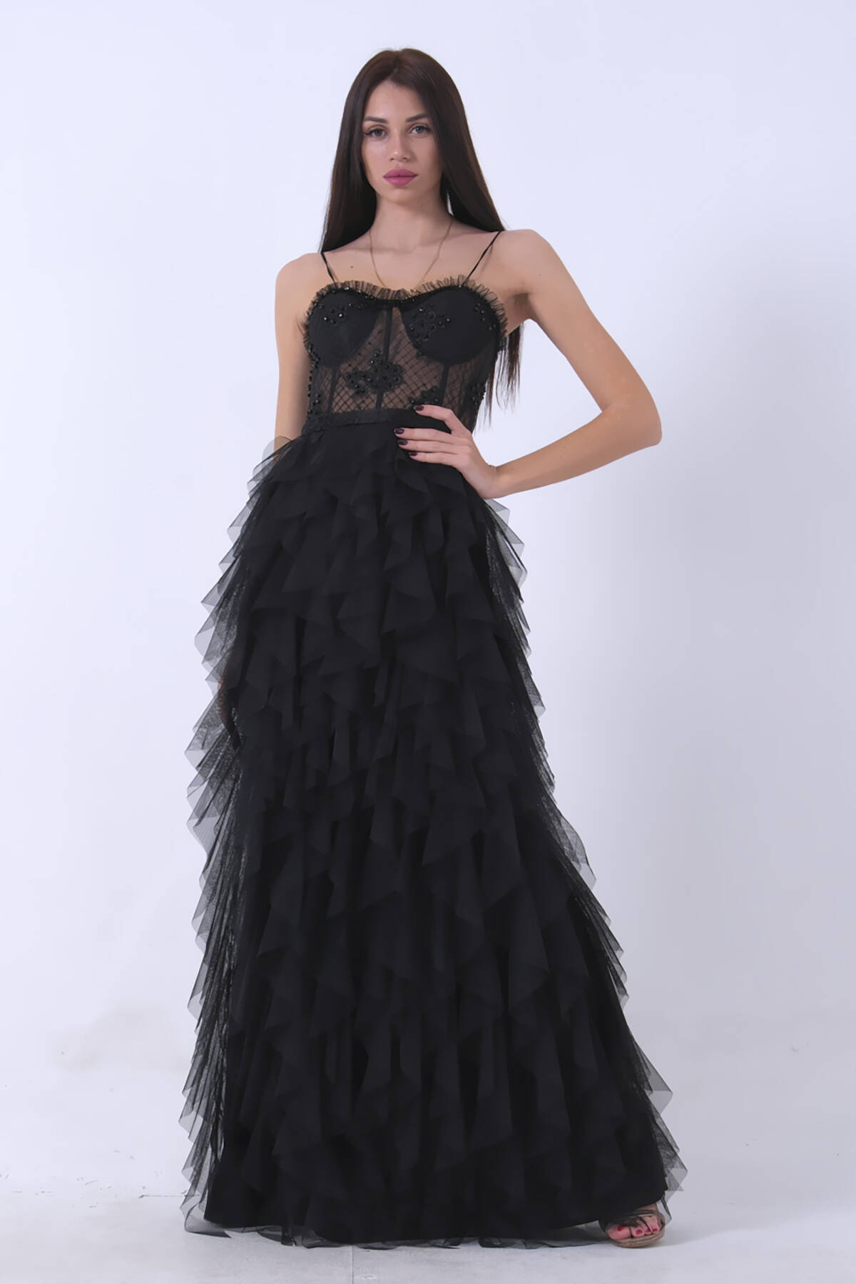 Siyah Transparan Taşlı Eteği Fırfırlı Abiye 9705034.01