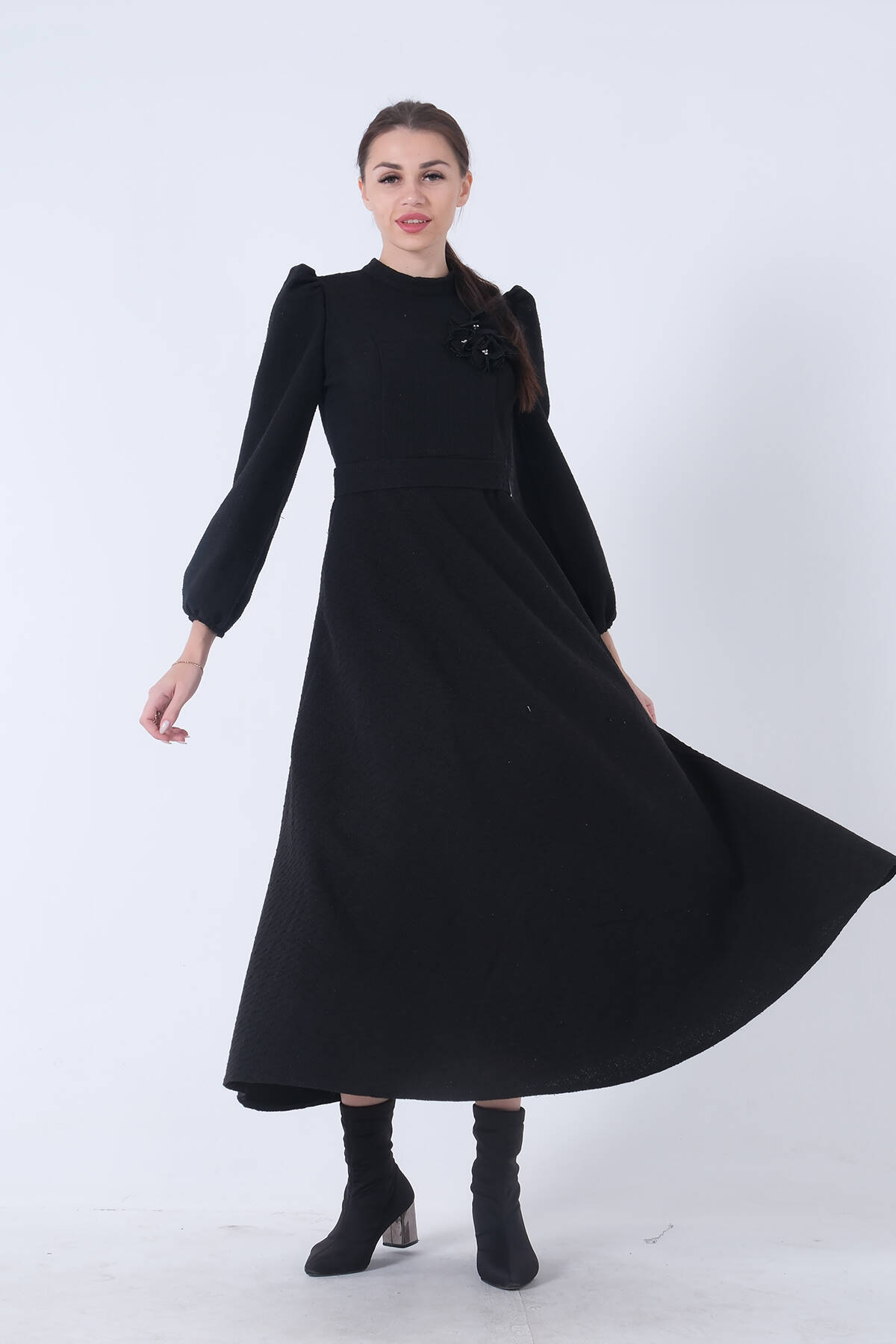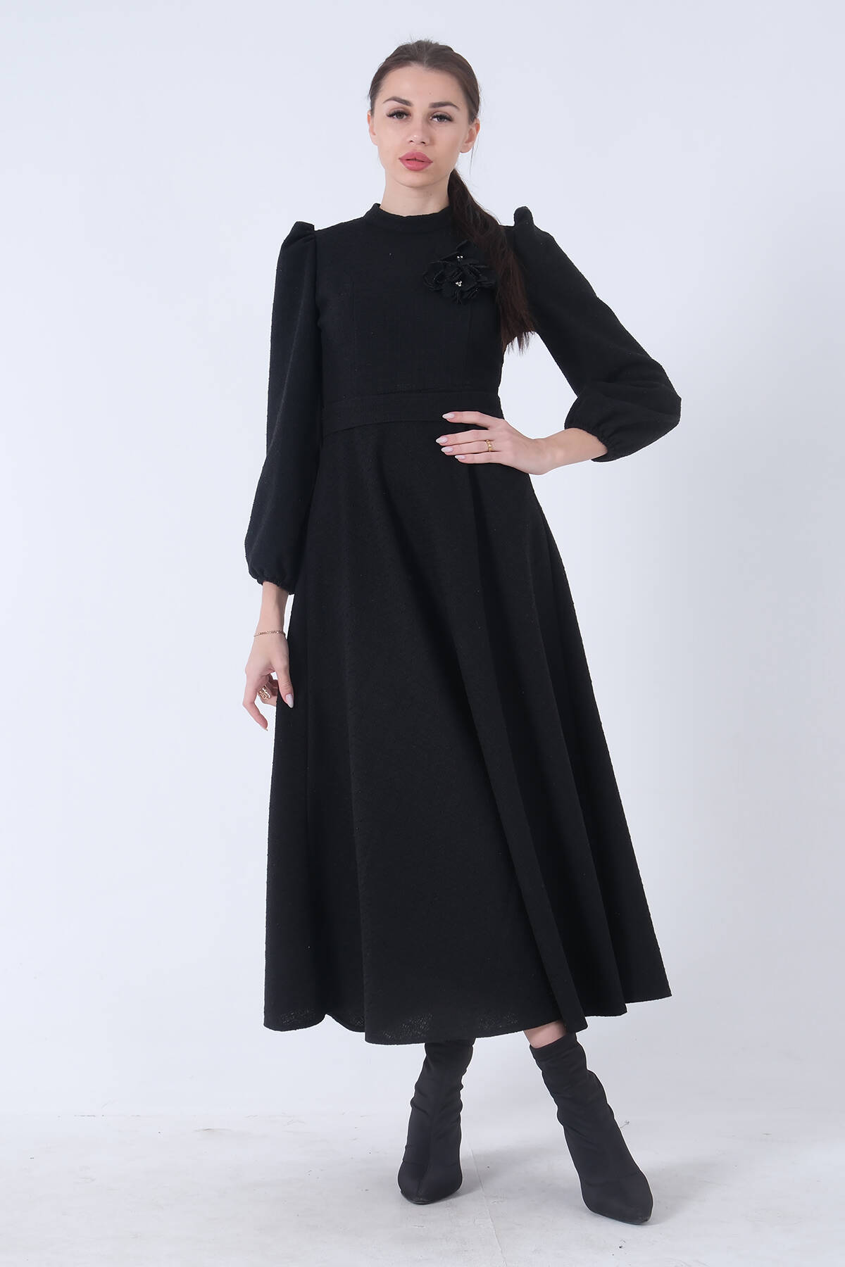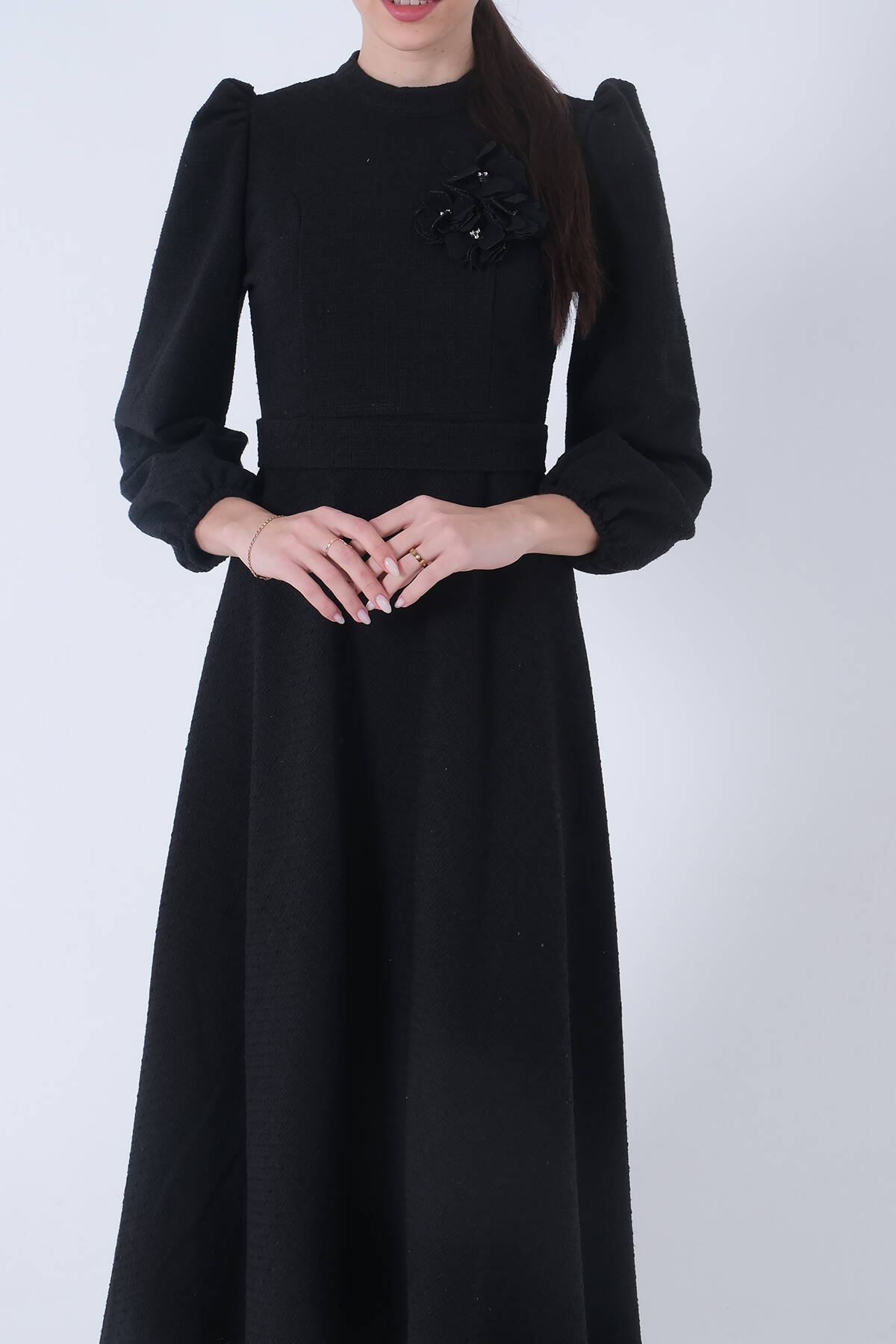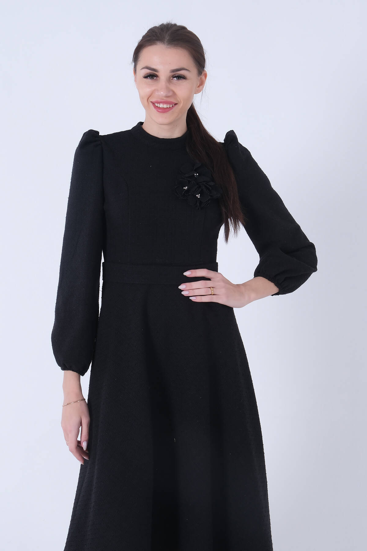 Siyah Tüvid Kumaş Çiçek Detaylı Kolları Lastikli Seyyar Kuşaklı Elbise 4593267.01