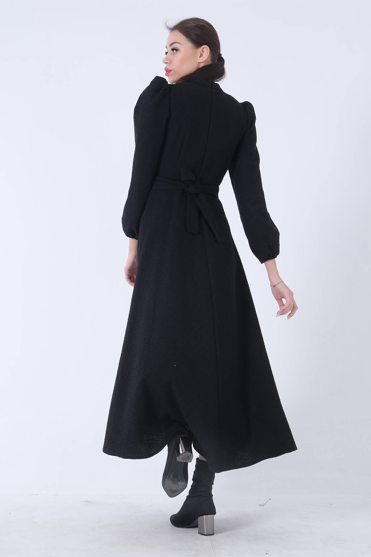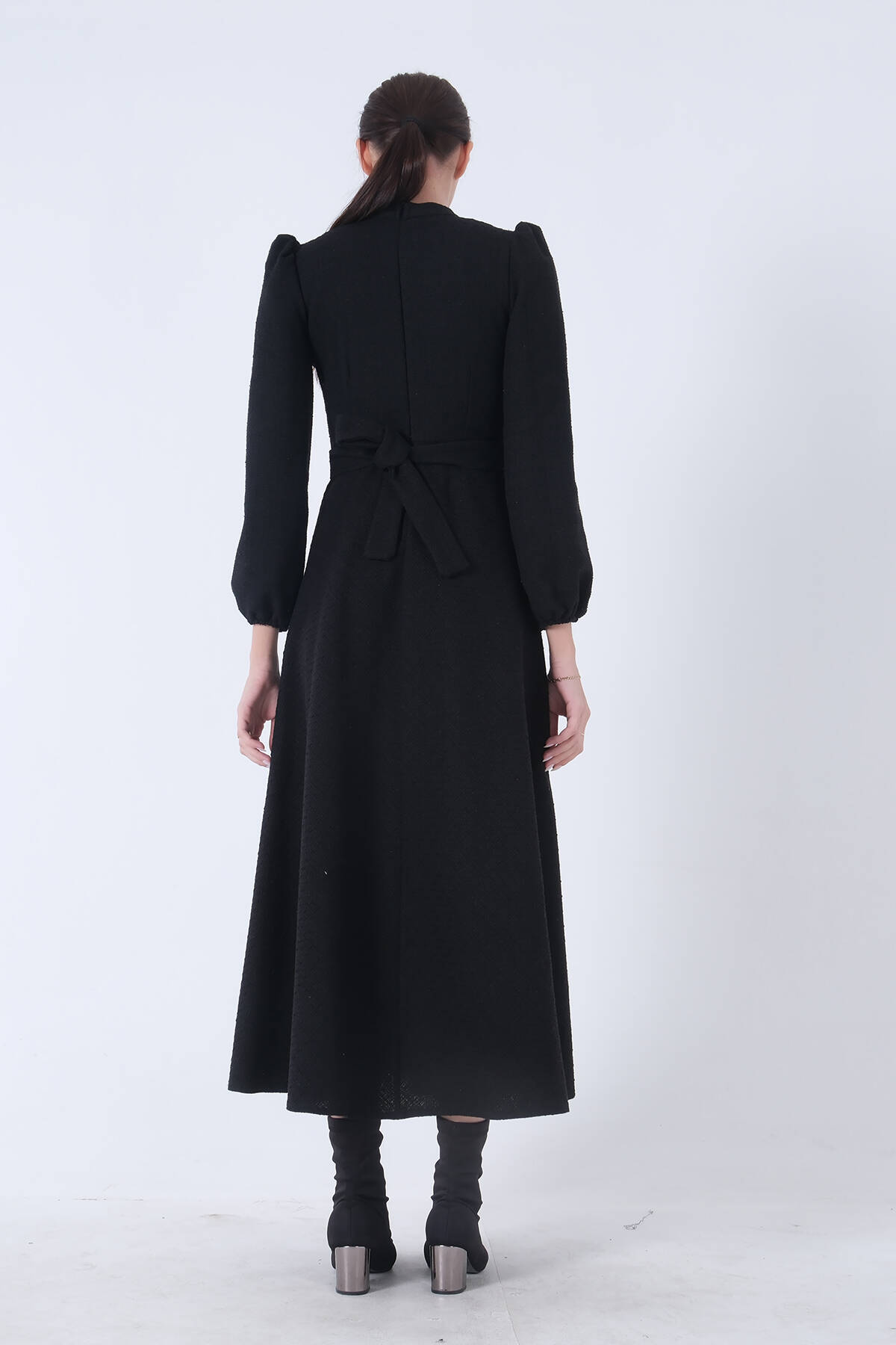 Siyah Bisiklet Yaka Kendinden Şal Detaylı Broşlu Bel Bağlamalı Elbise 4571580.01