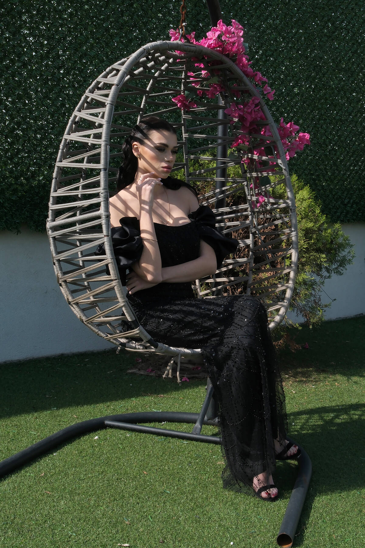 Siyah Çiçek Detaylı Pul Boncuk İşlemeli Kuyruklu Abiye 9705650.01