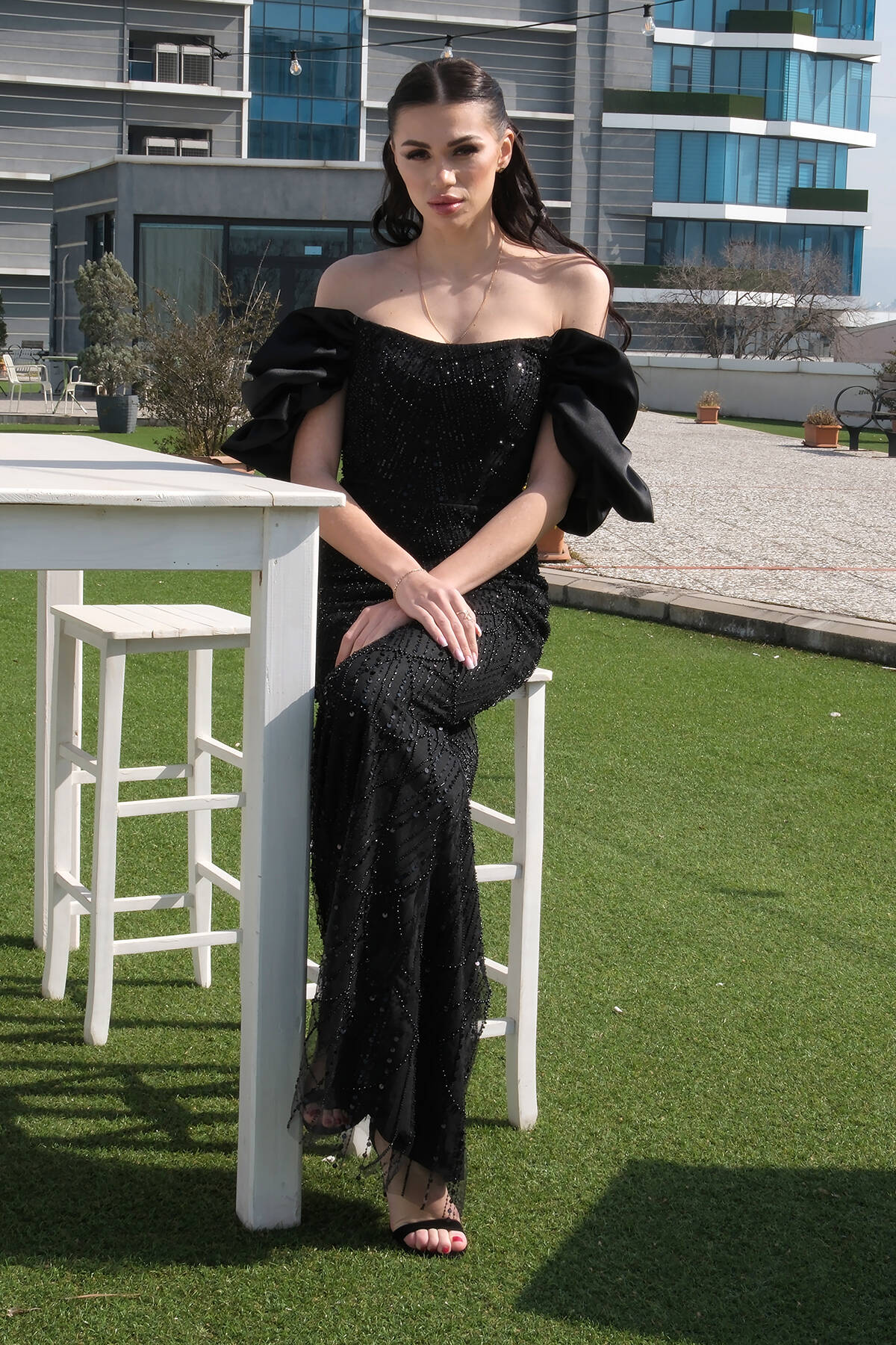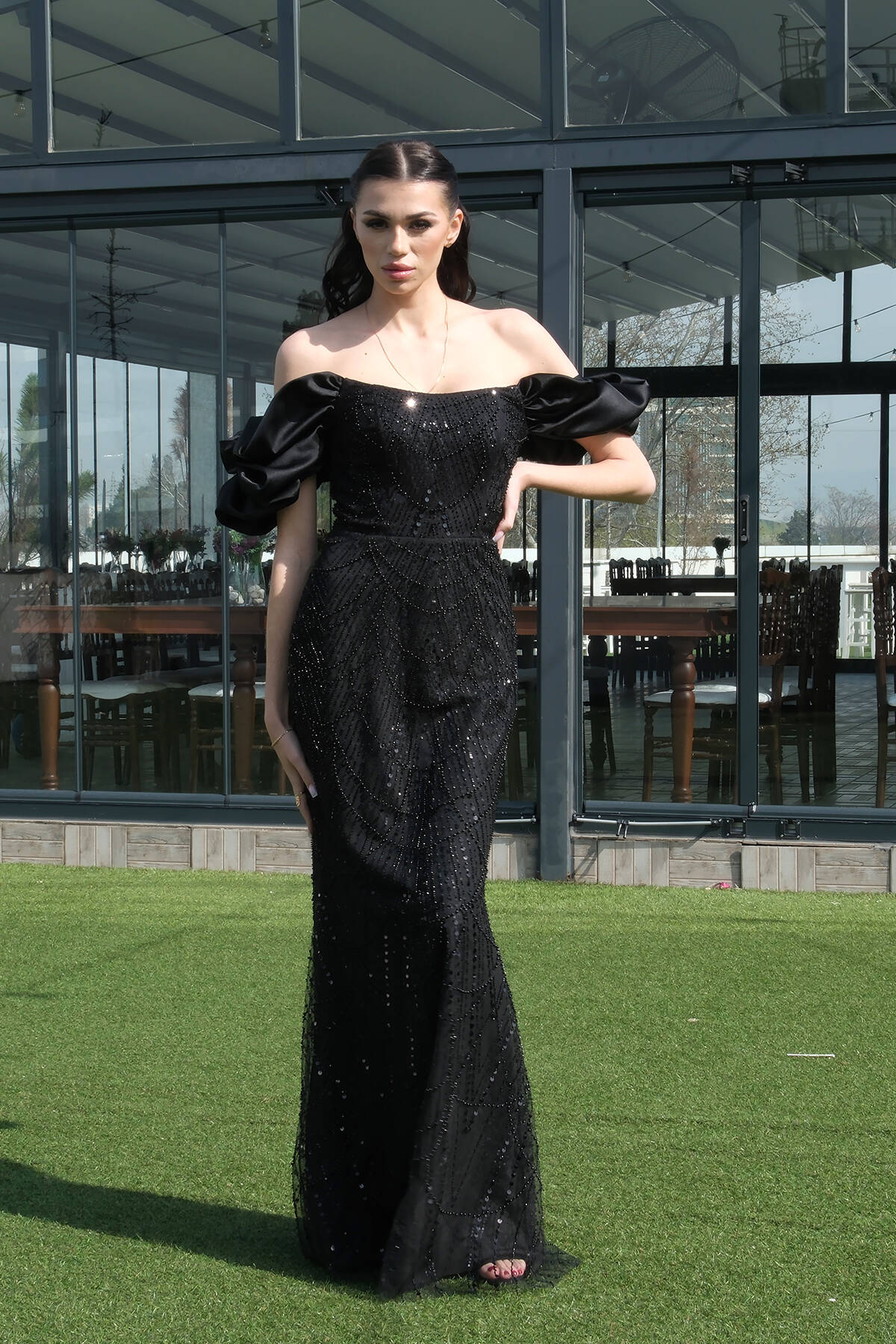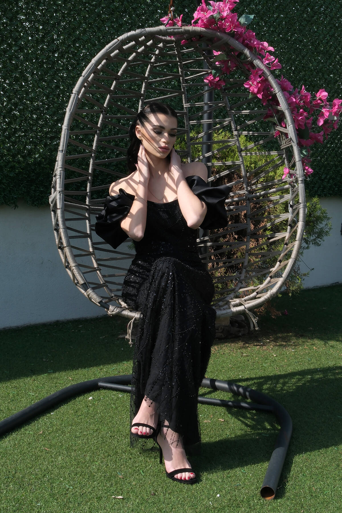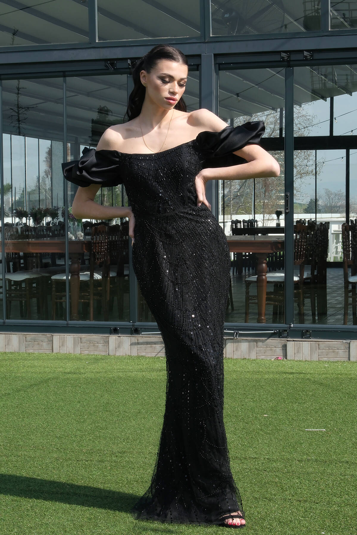 Siyah Üzeri Taş Boncuk İşlemeli Balon Kol Abiye 9705417.01