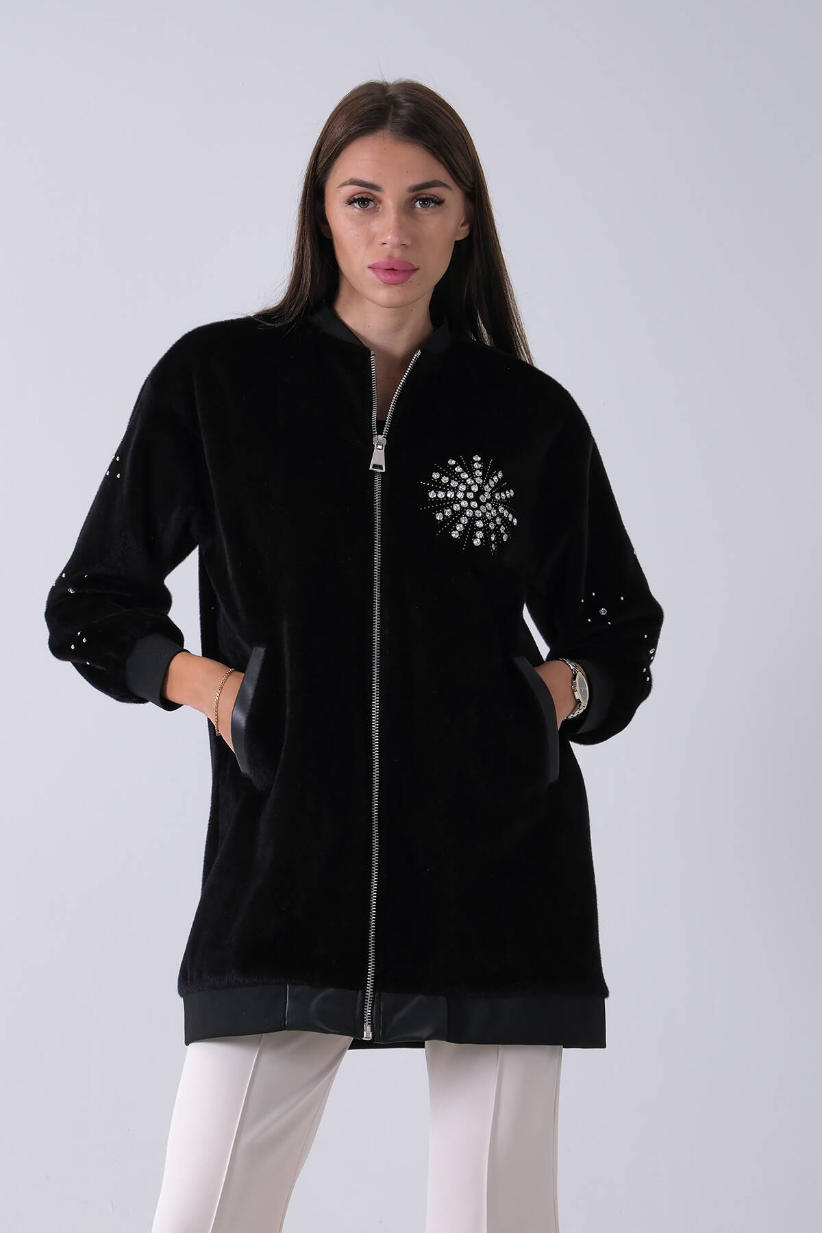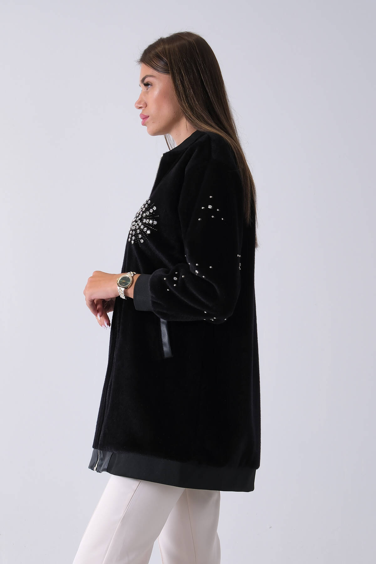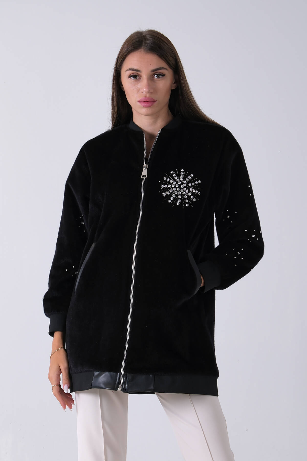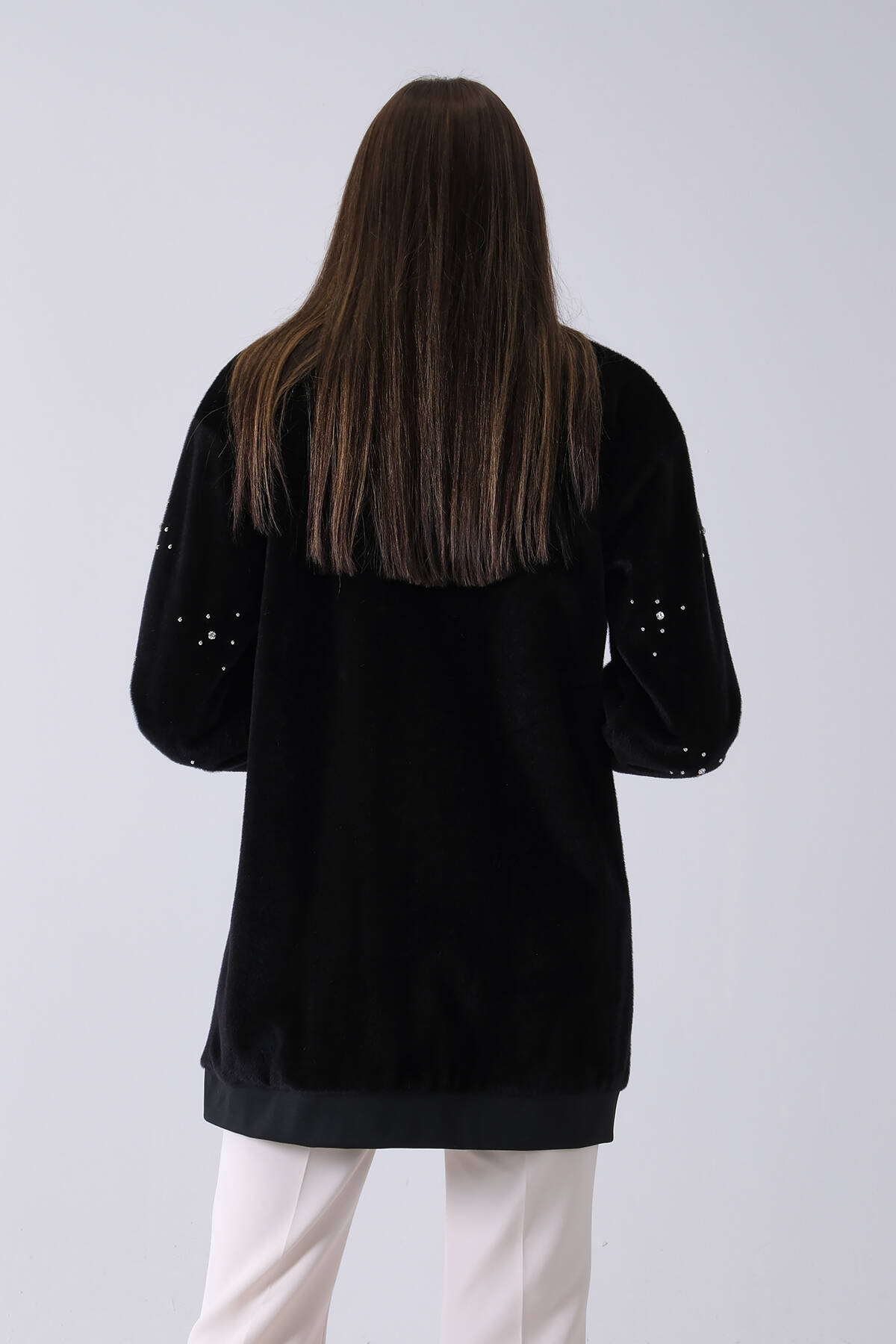 Siyah Üzeri Taş Detaylı Yandan Cepli Peluş Hırka 4701420.01