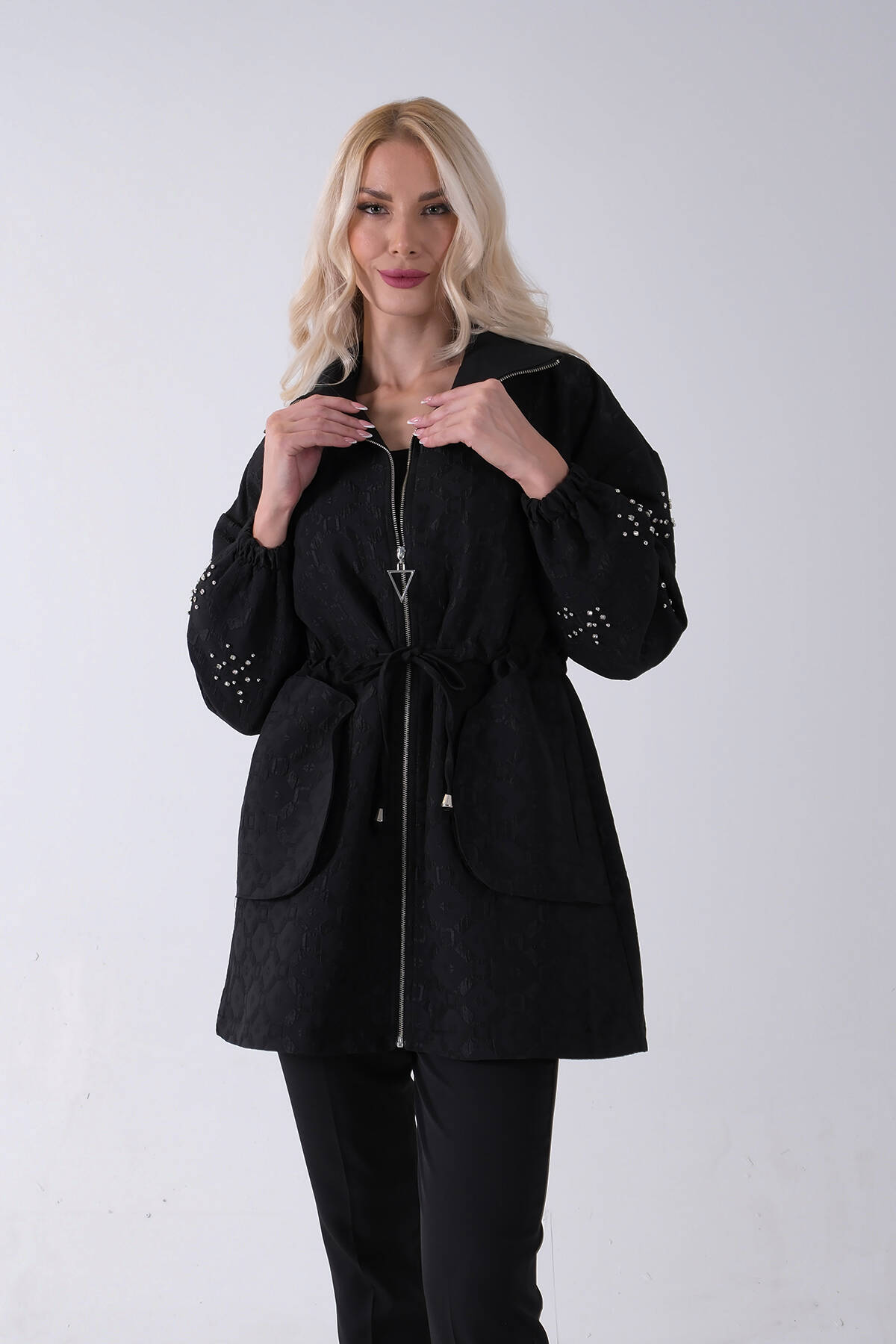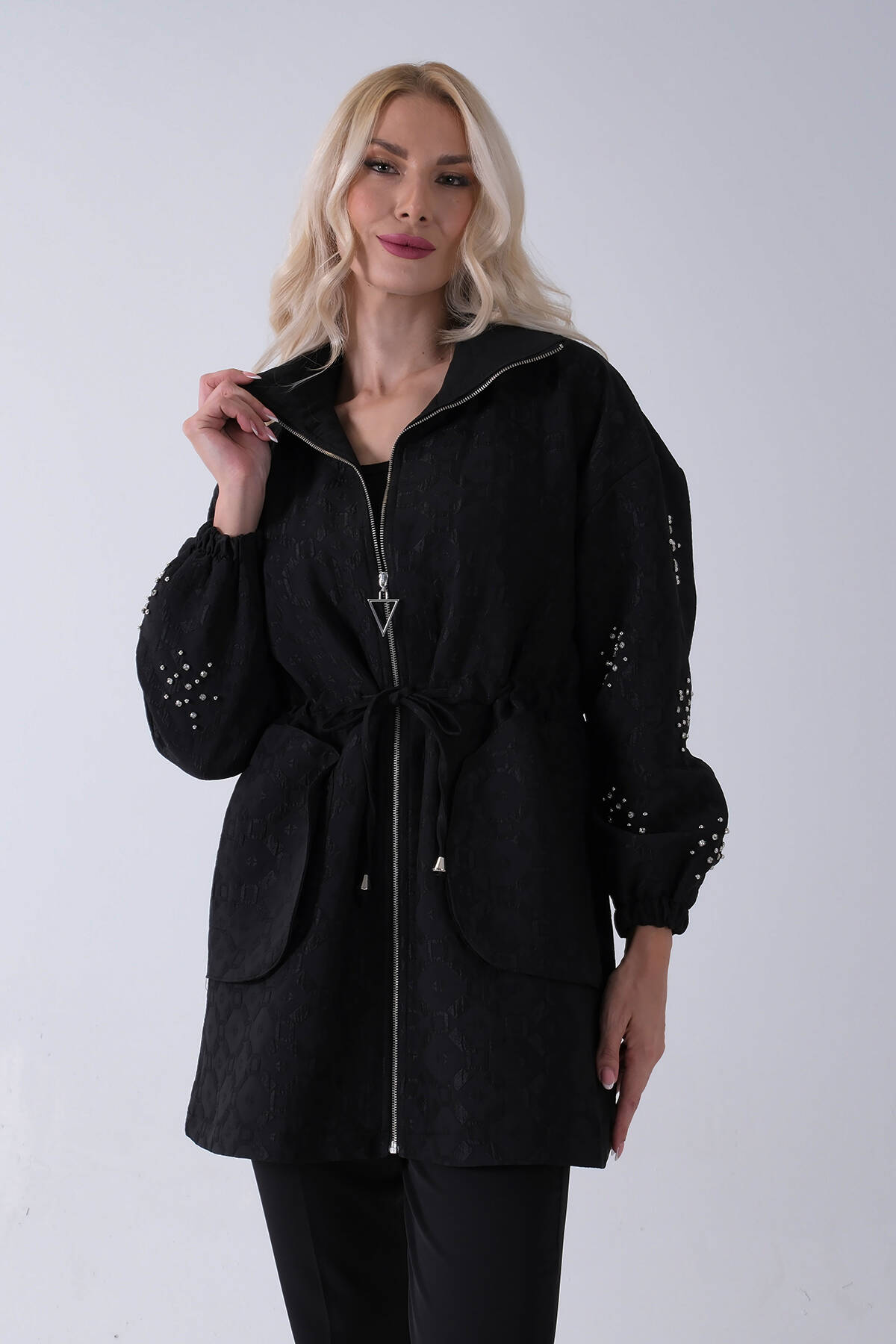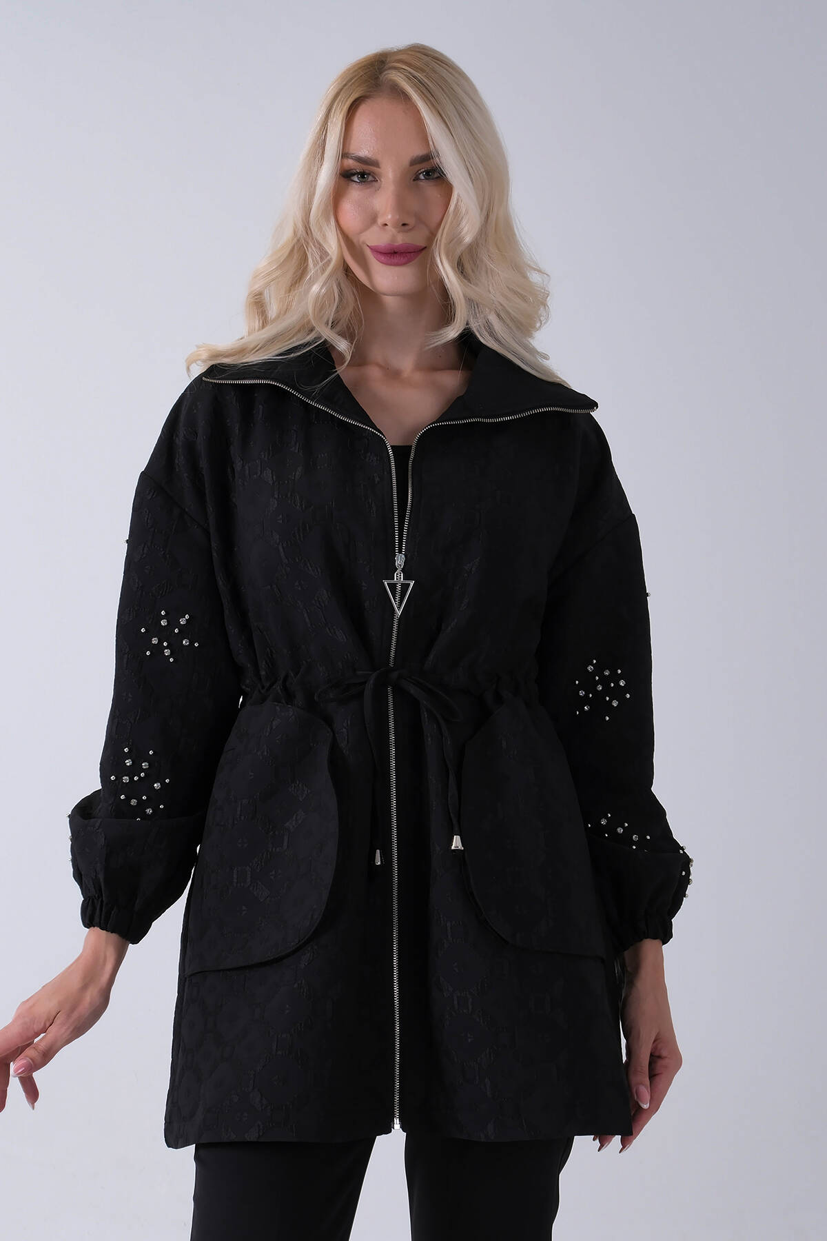 Siyah Üzeri Taş Detaylı Yandan Cepli Trenç 940140177.01