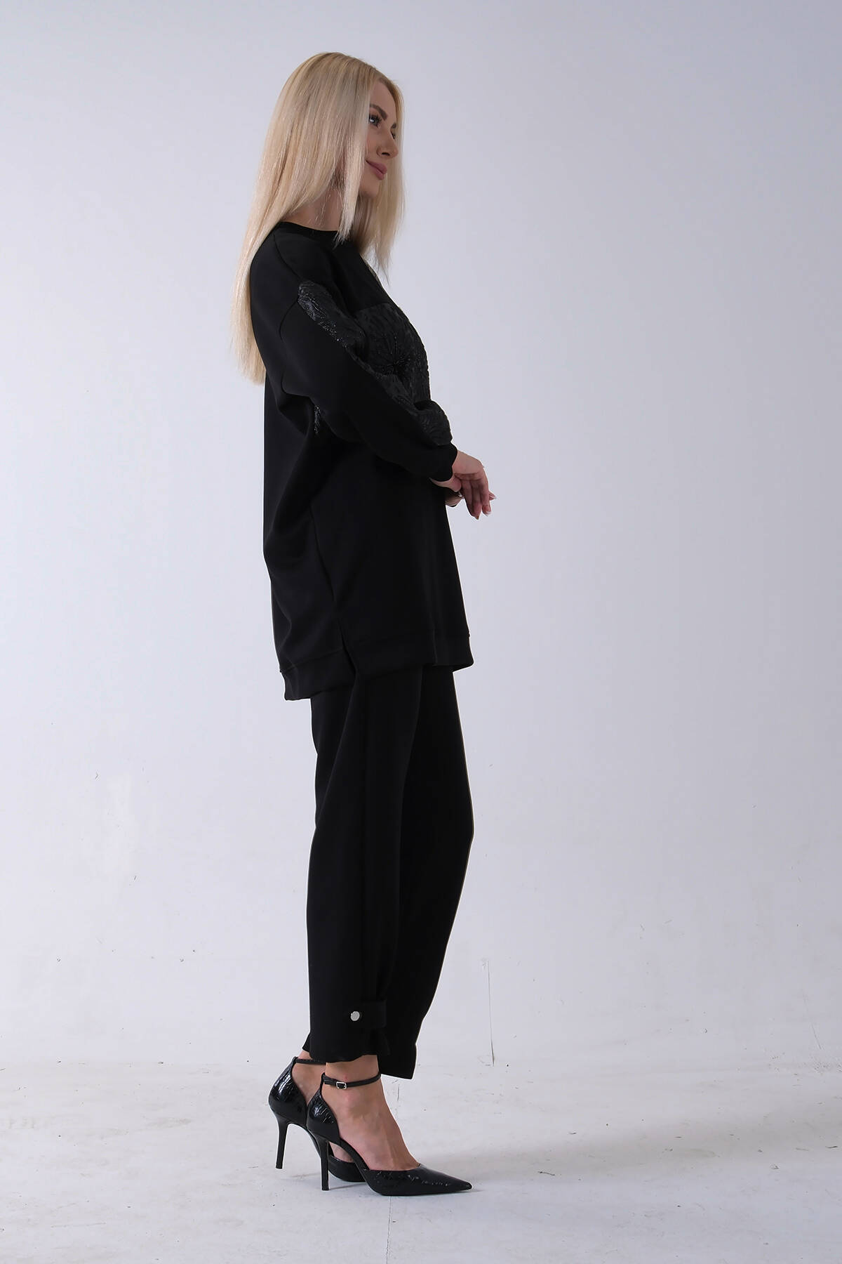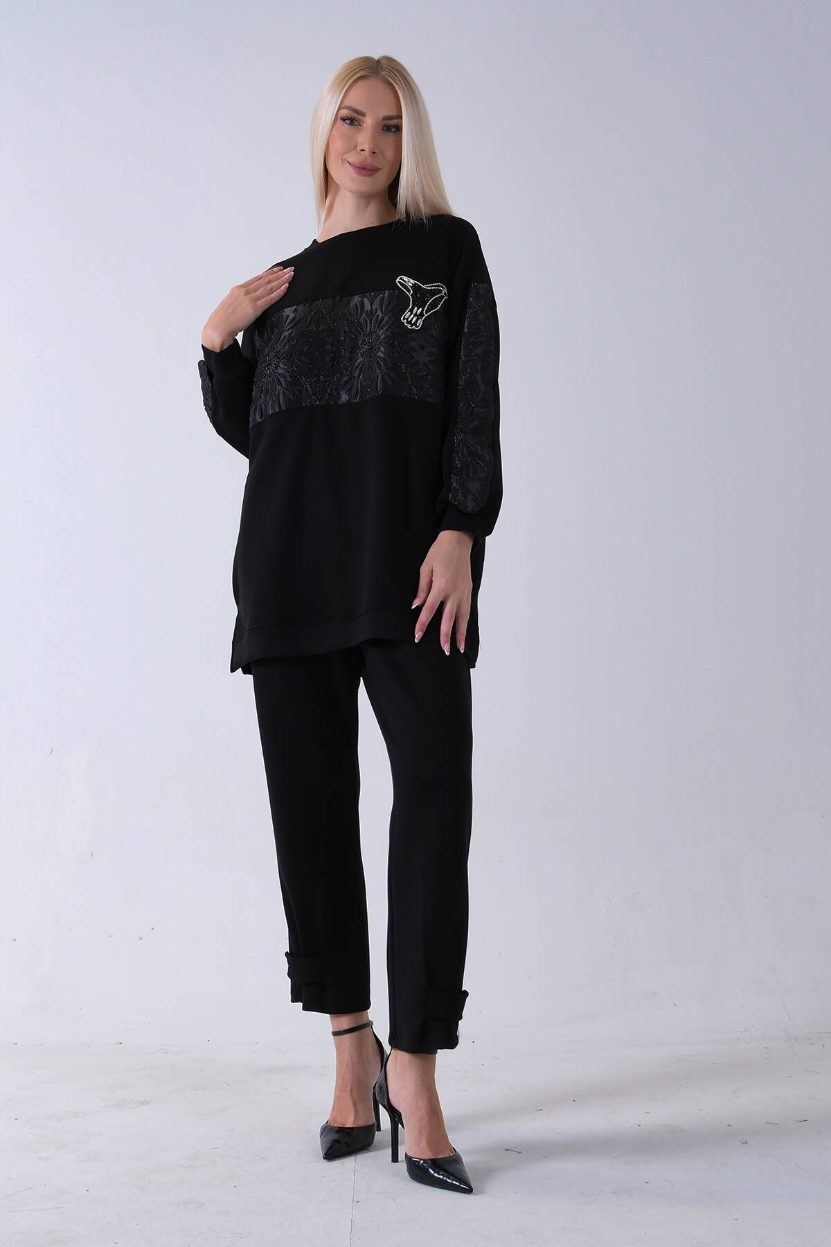 Siyah Üzeri Taş İşleme Desenli Pantolonlu Takım 940120231.01