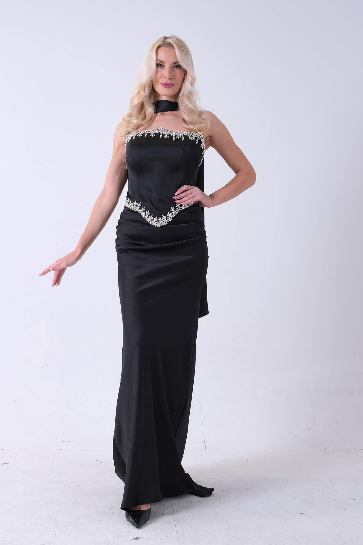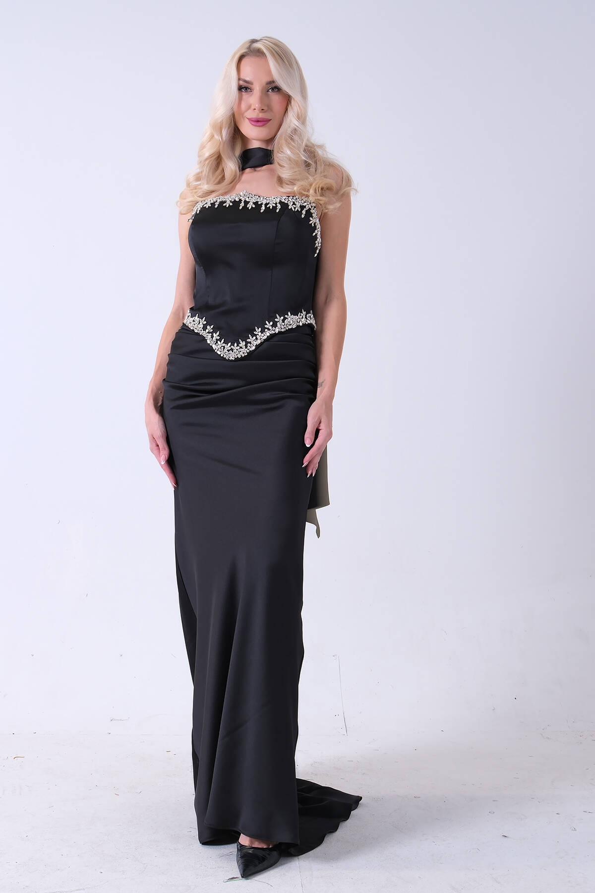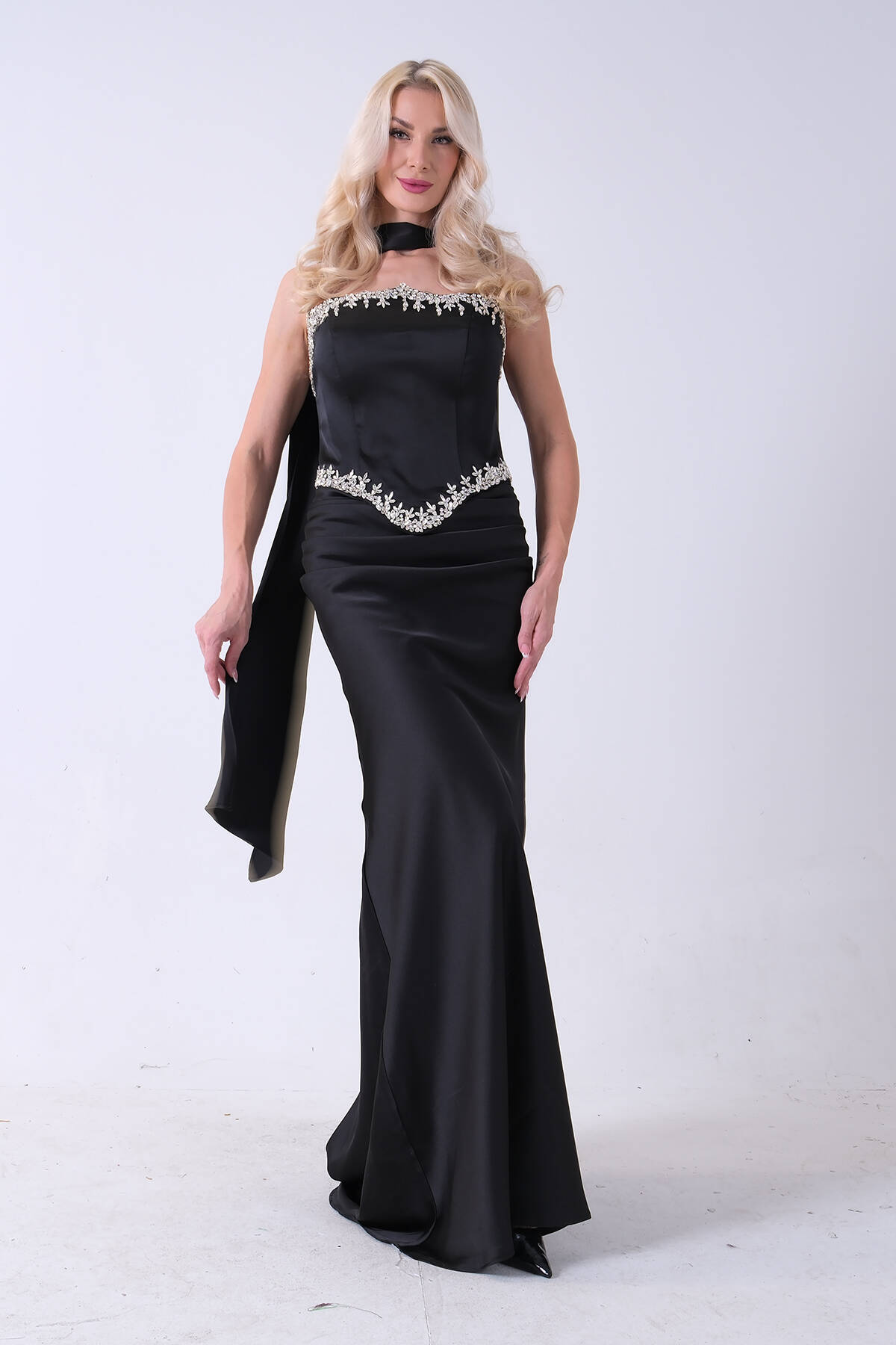 Siyah Üzeri Taş İşleme Detaylı Kuşak Bağlama Detaylı Straplez Abiye 08011801.01