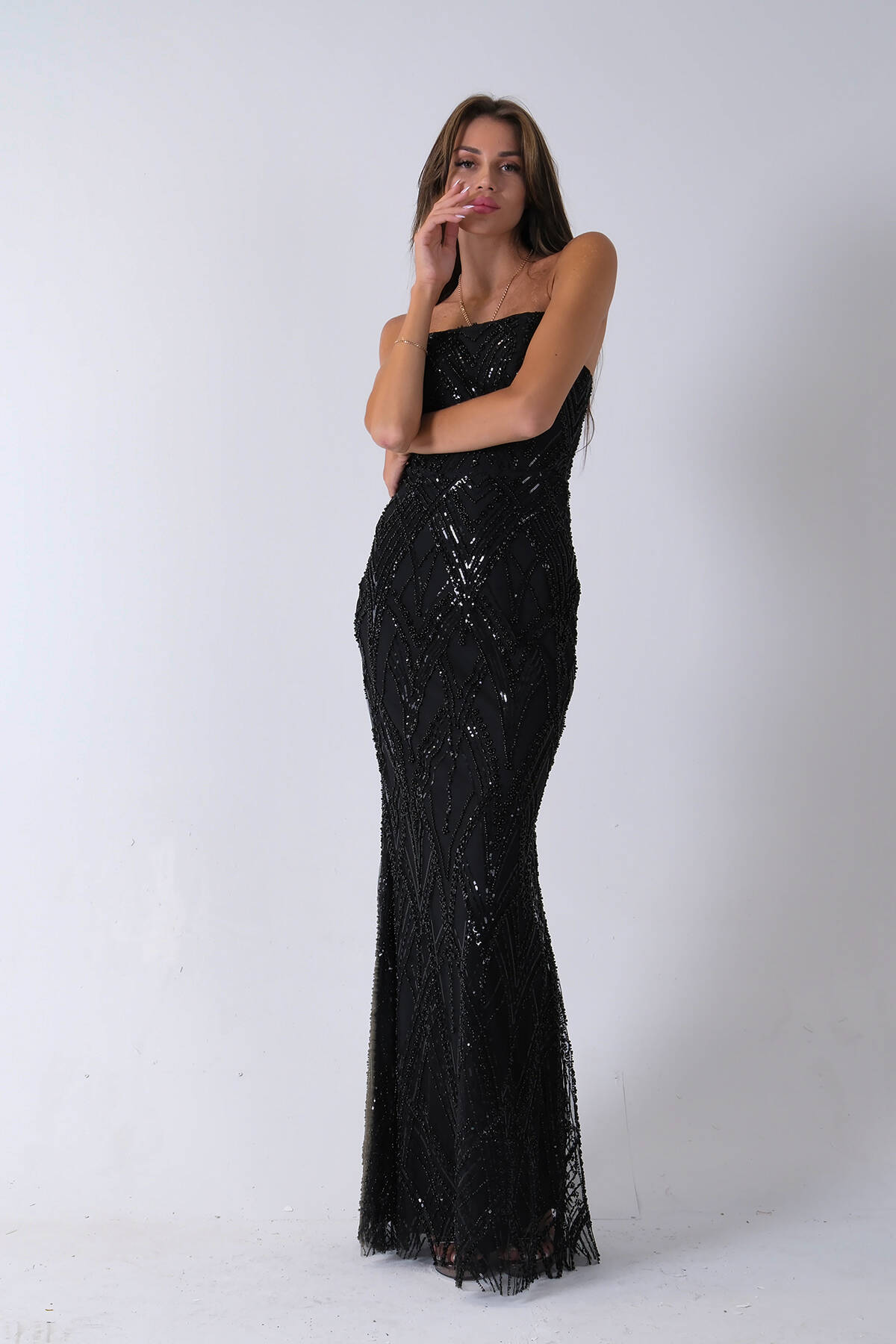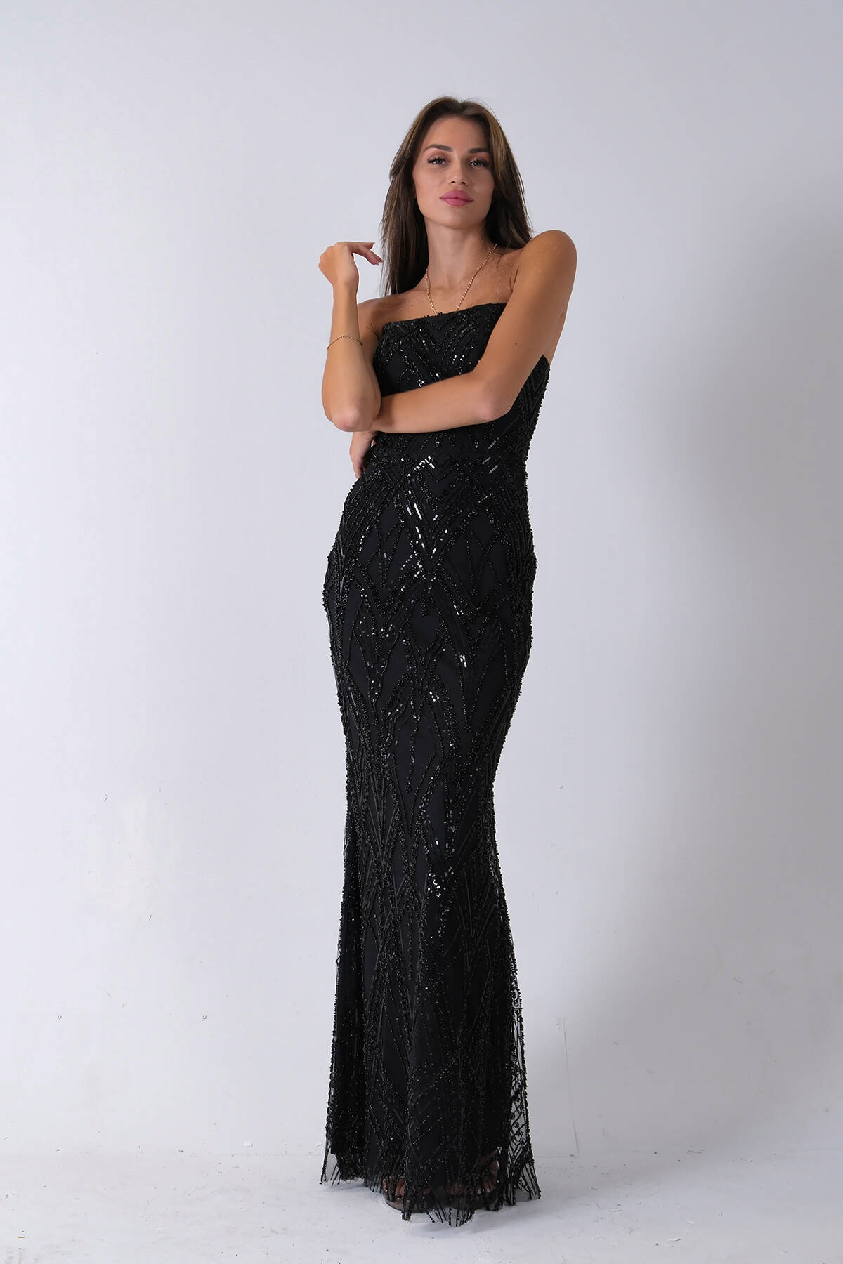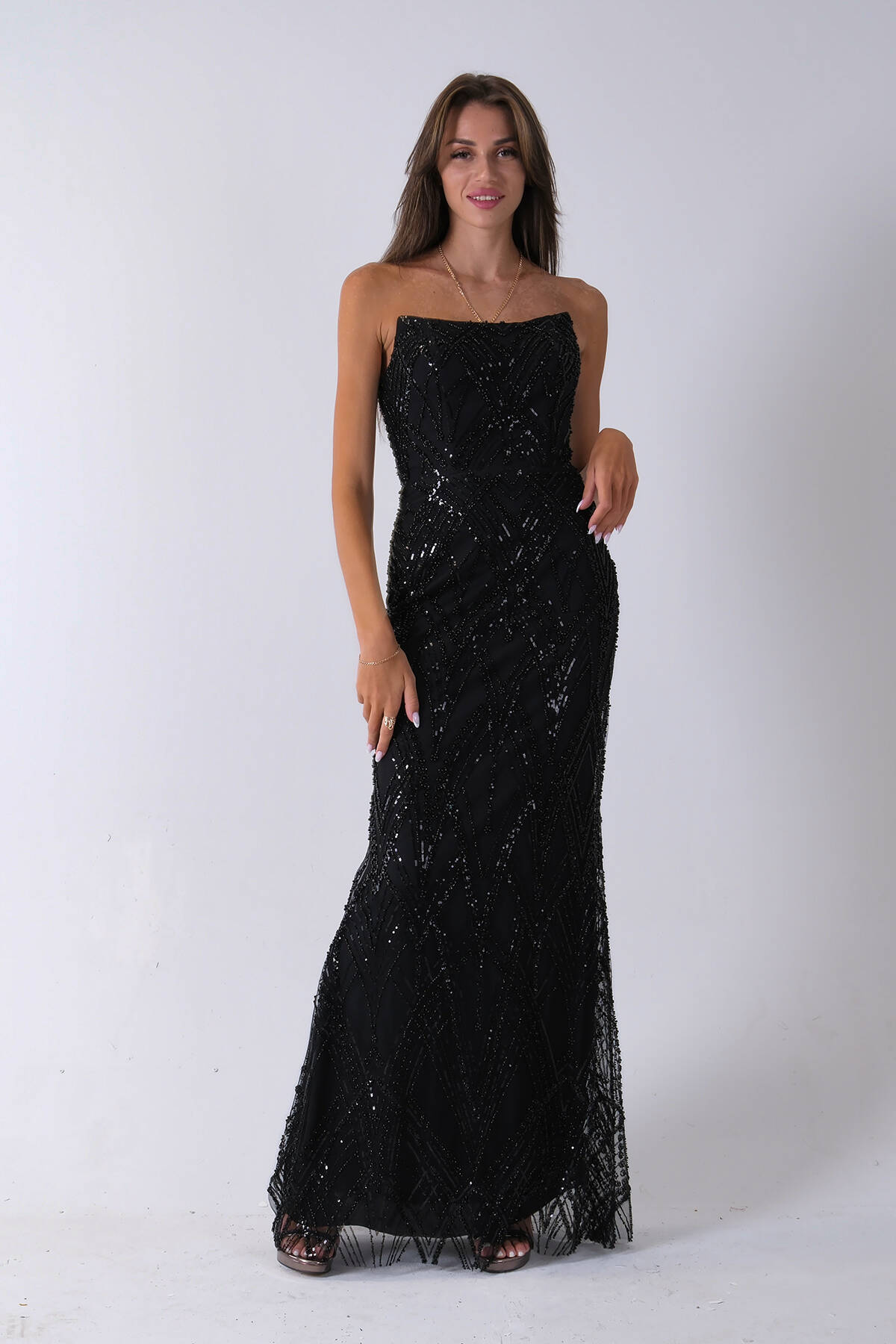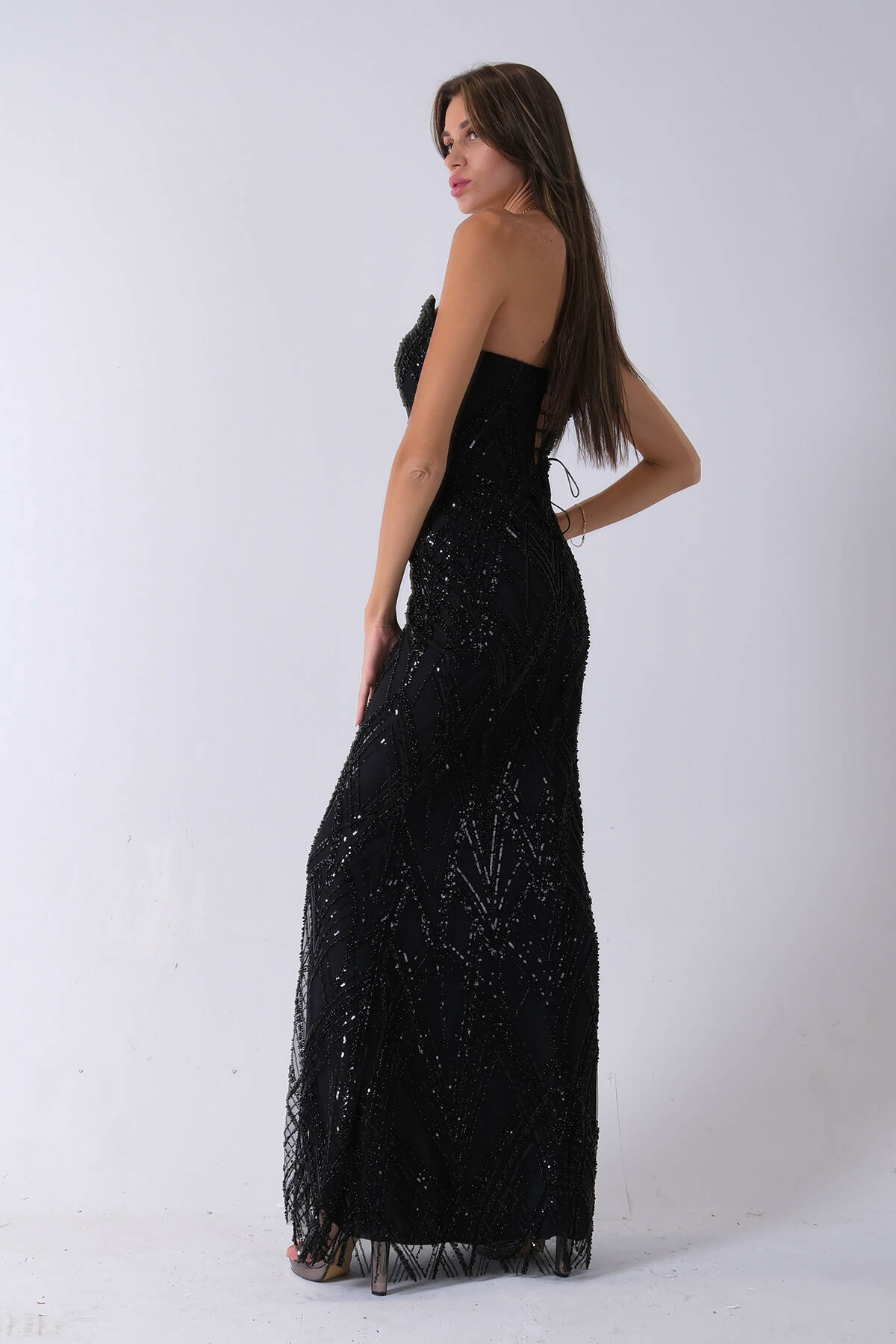 Siyah Üzeri Taş İşlemeli Sırt Bağlamalı Straplez Abiye 9705498.01