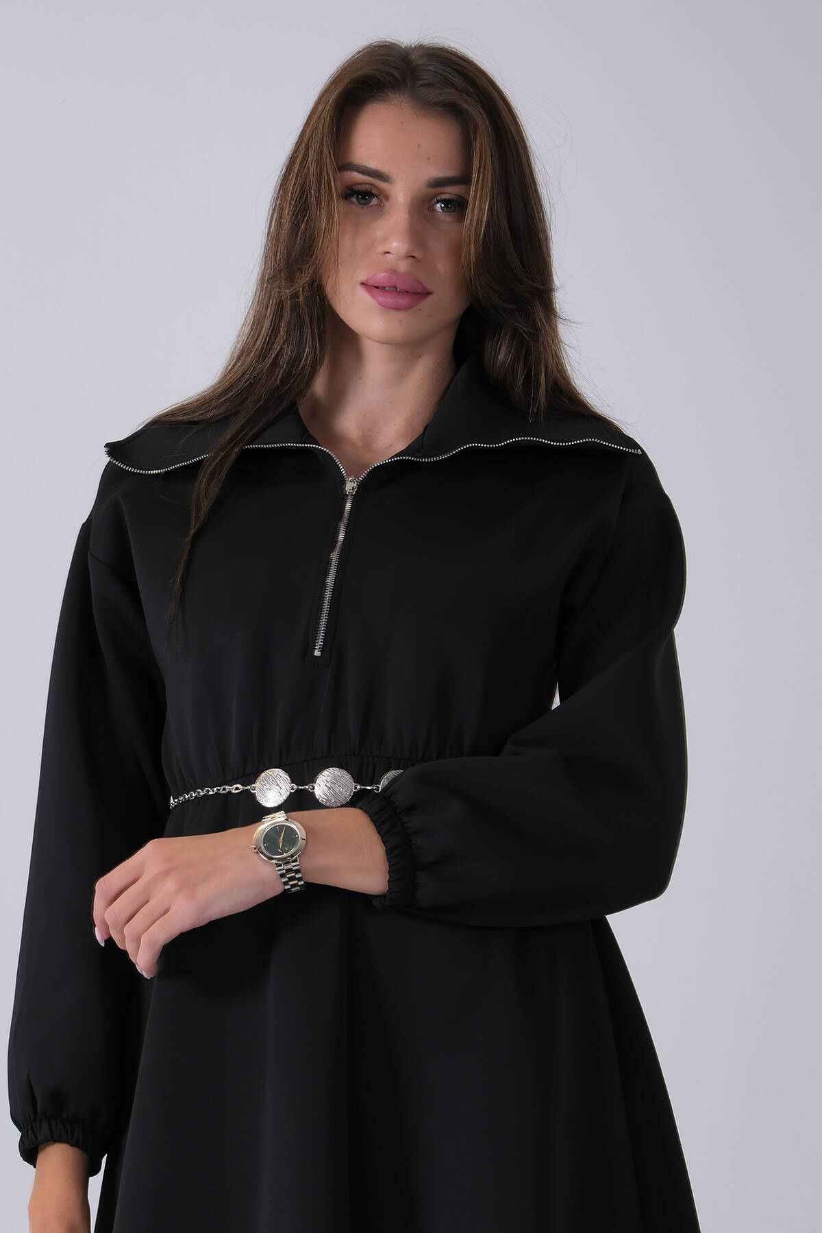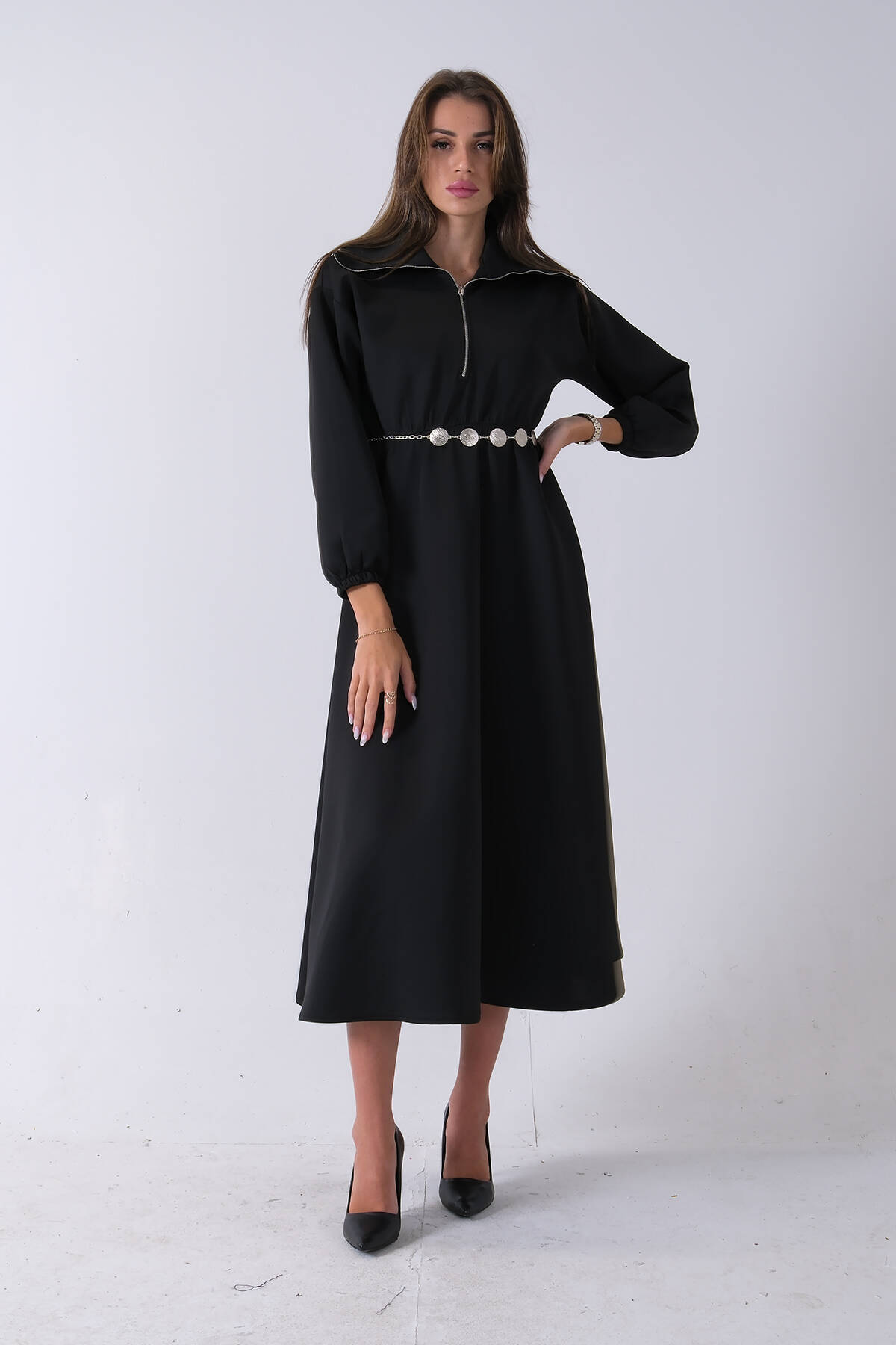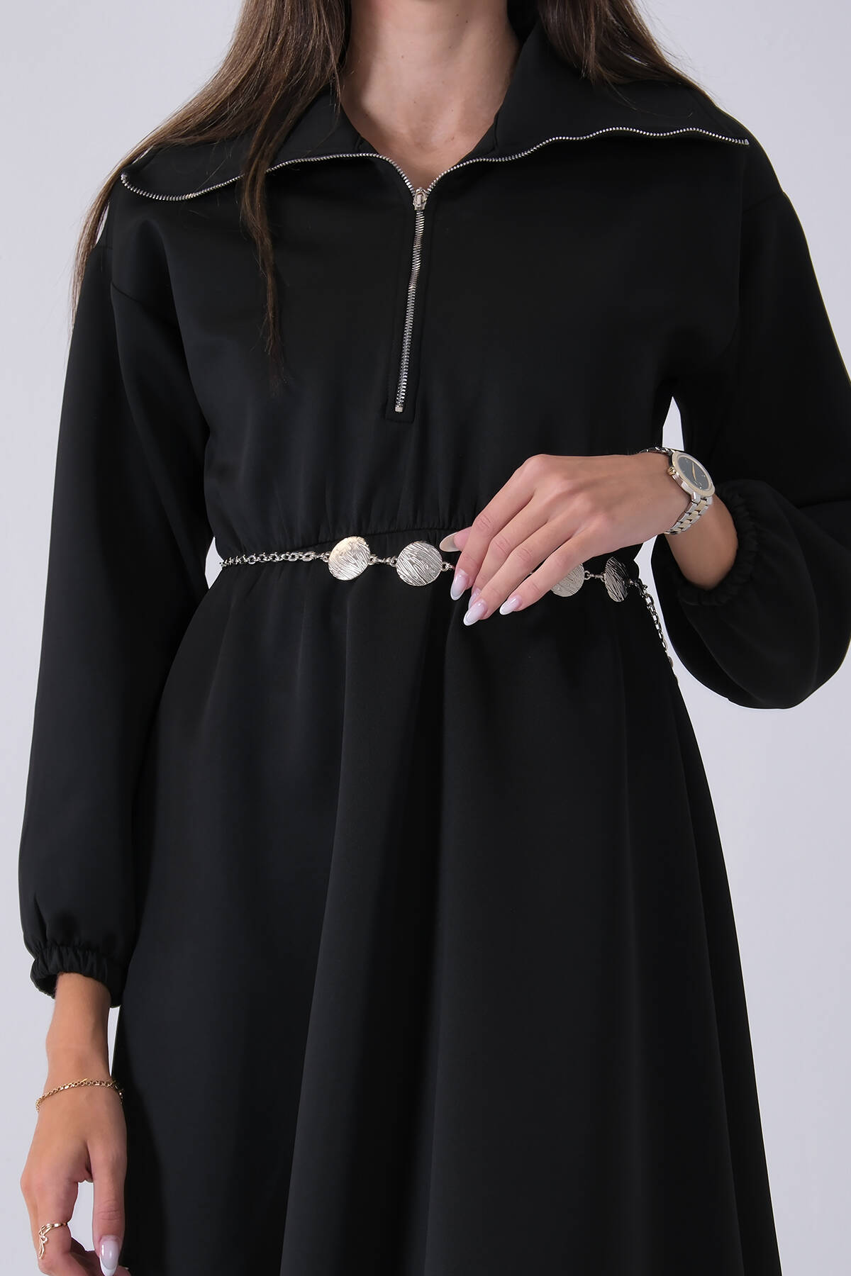 Siyah Yaka Fermuar Detaylı Bel ve Bileği Lastikli Kemerli Scuba Elbise 4593455.01