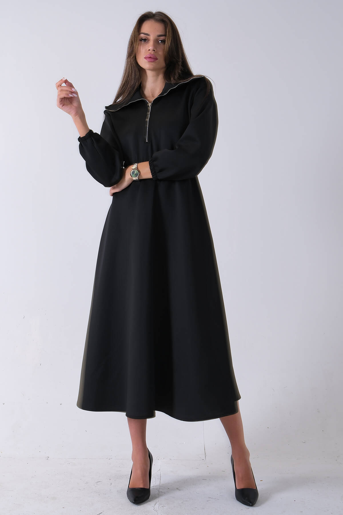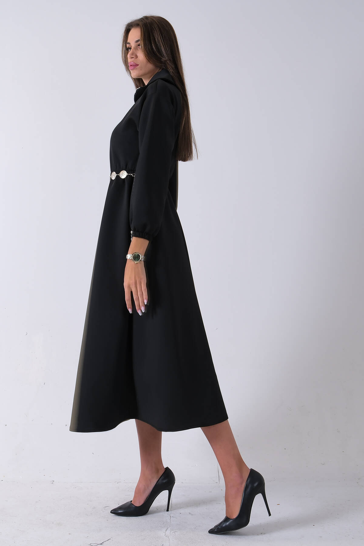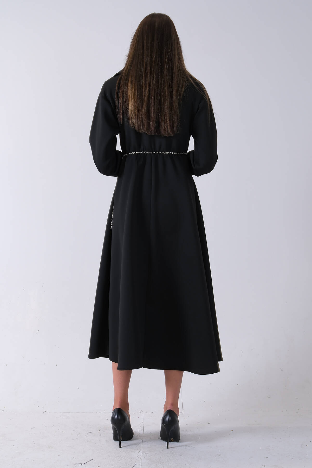 Siyah Yaka Fermuar Detaylı Bel ve Bileği Lastikli Kemerli Scuba Elbise 4593455.01