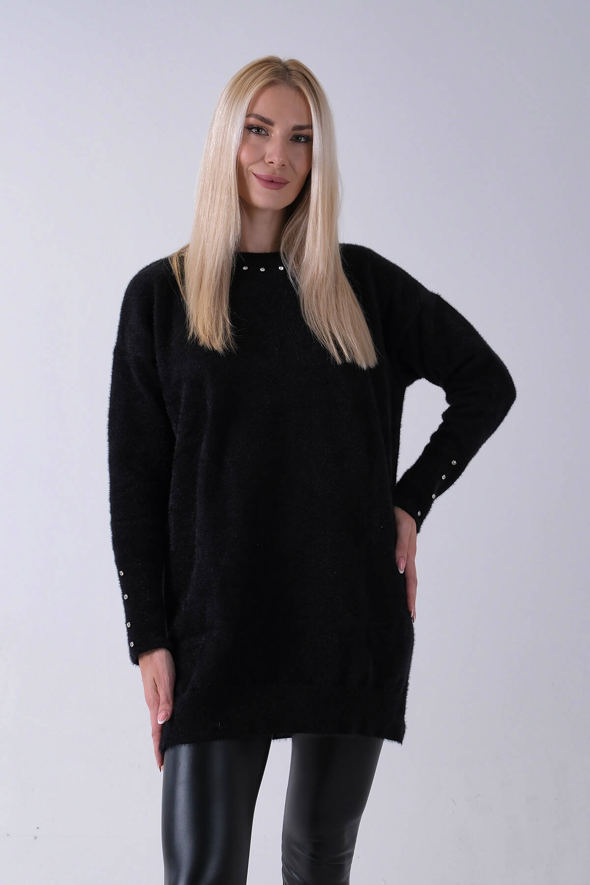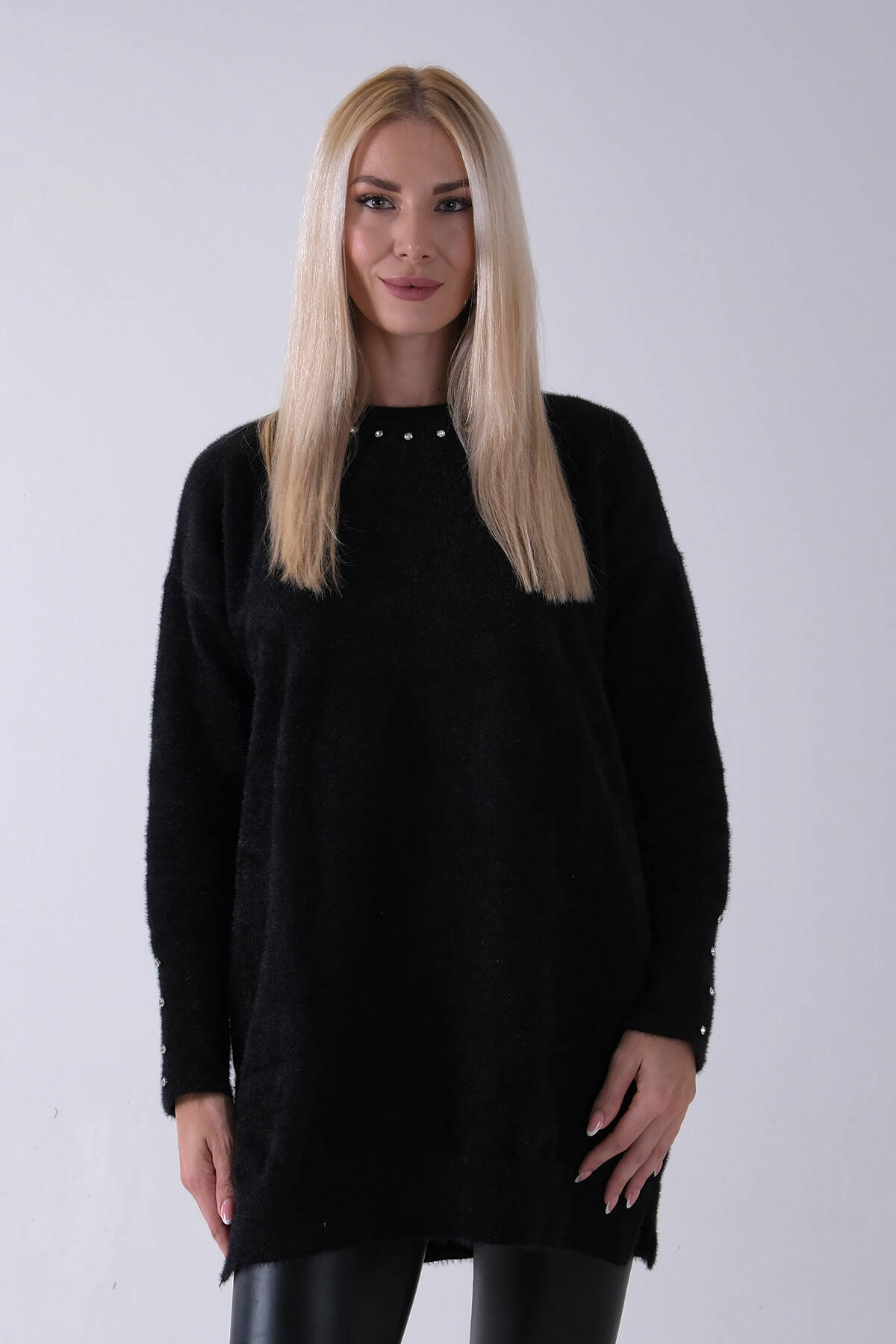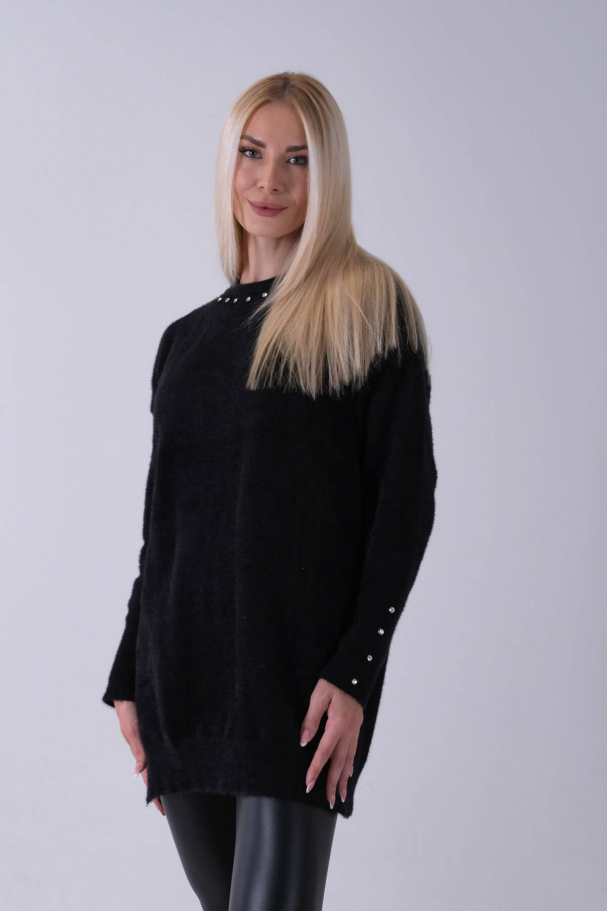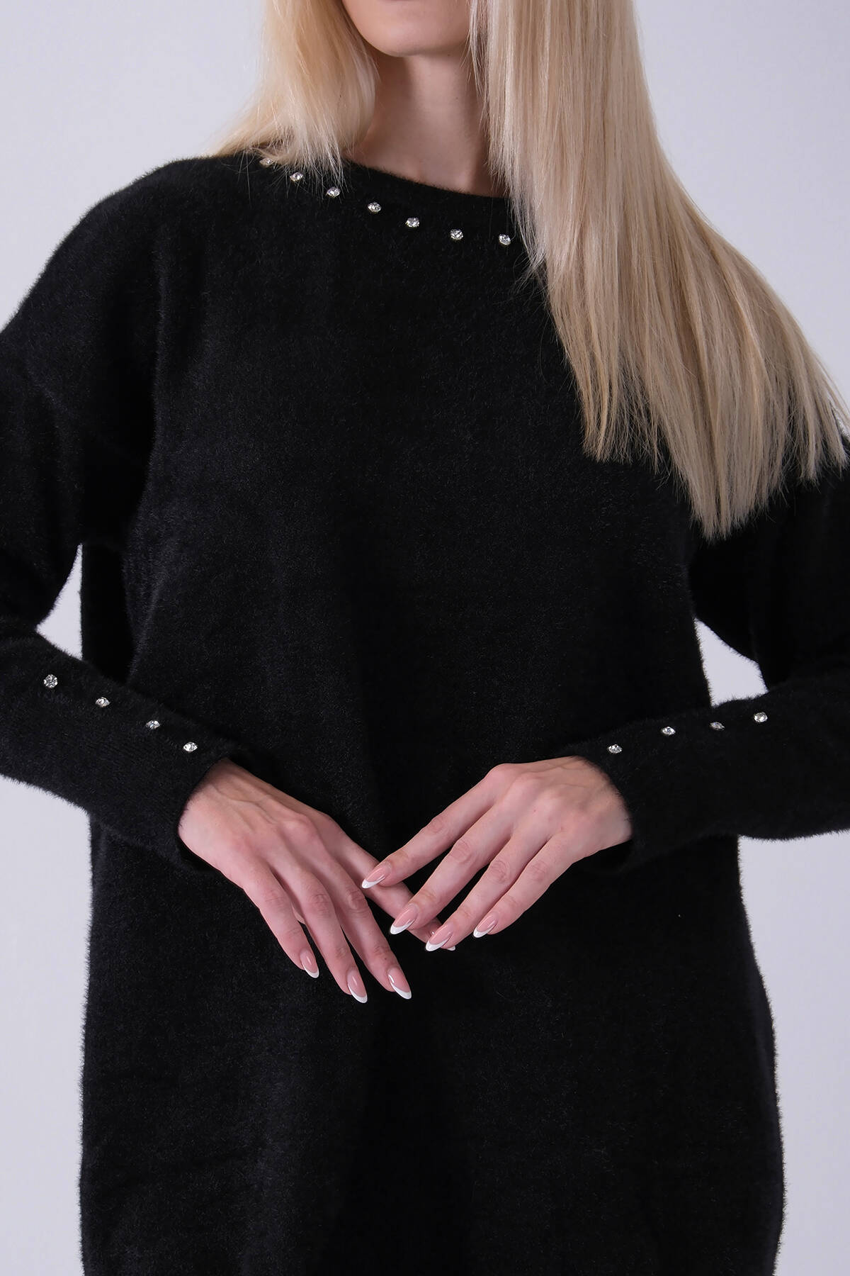 Siyah Yaka ve Kolları Taş Detaylı Bisiklet Yaka Kazak 44530206.01