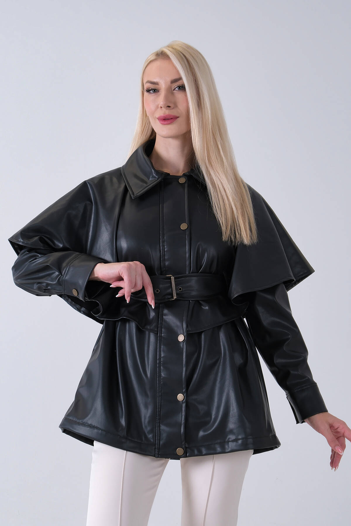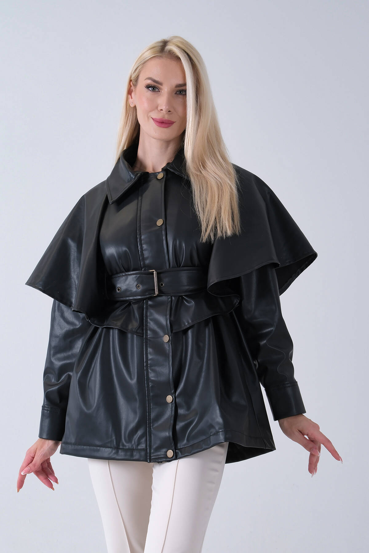 Siyah Yakalı Kendinden Pelerinli Kemerli Deri Ceket 5309366.01