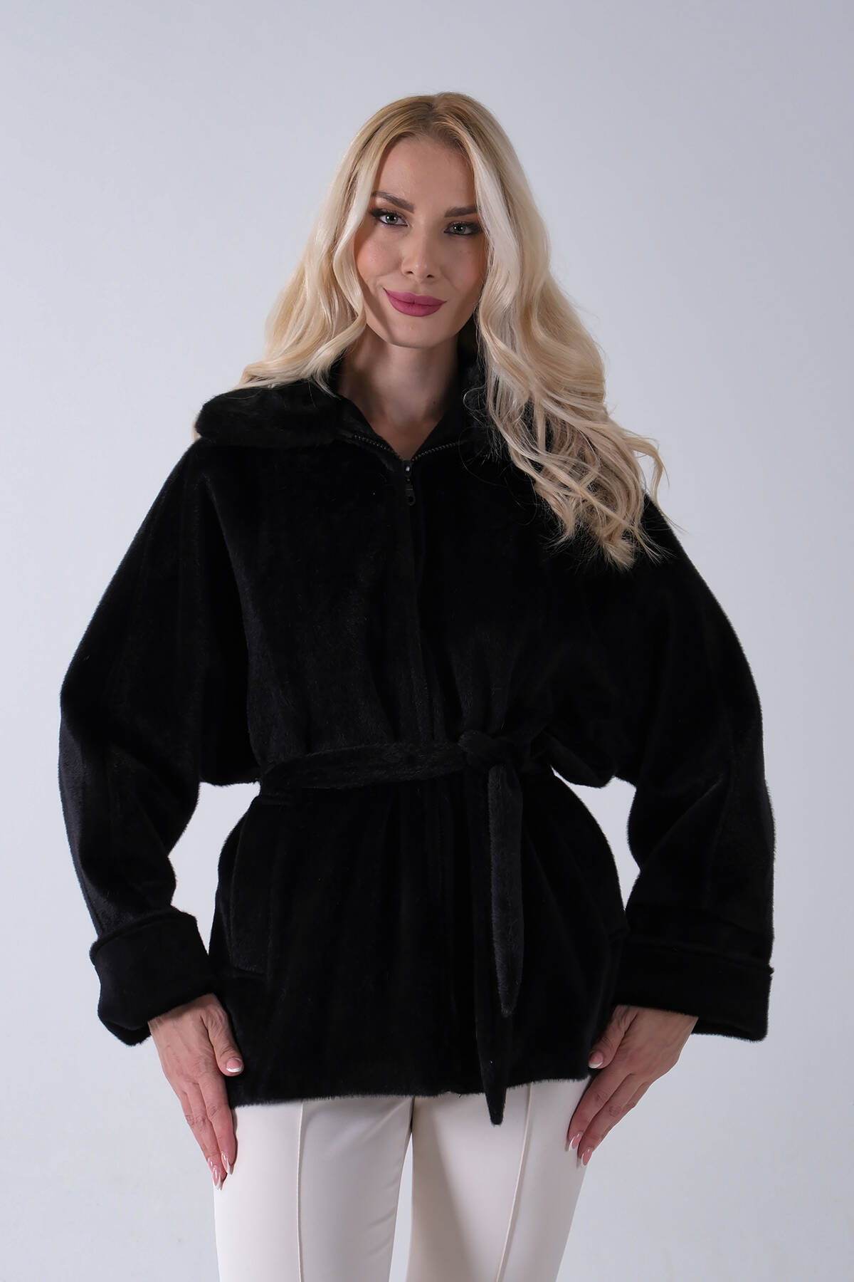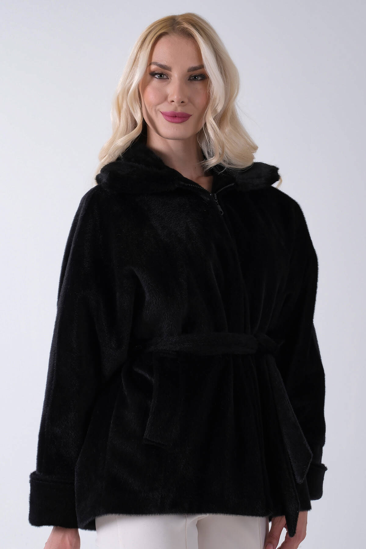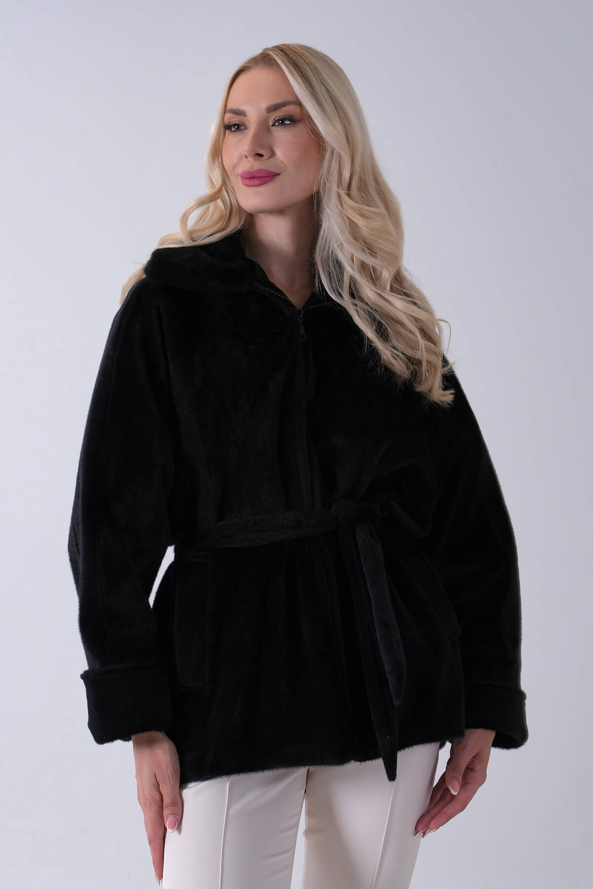Siyah Yakası Kürk Detaylı Kemerli Fermuar Kapamalı Kaşe Ceket 5307098.01