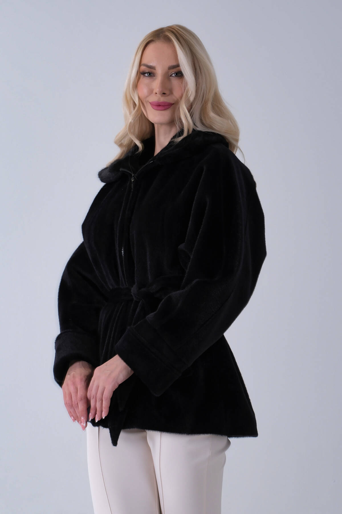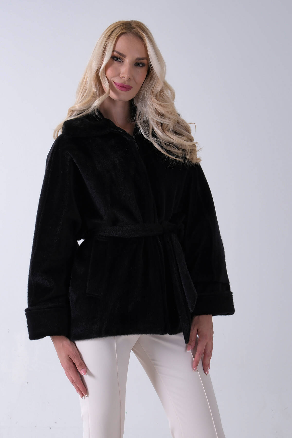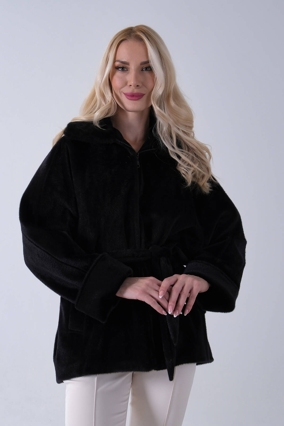 Siyah Yakası Kürk Detaylı Kemerli Fermuar Kapamalı Kaşe Ceket 5307098.01