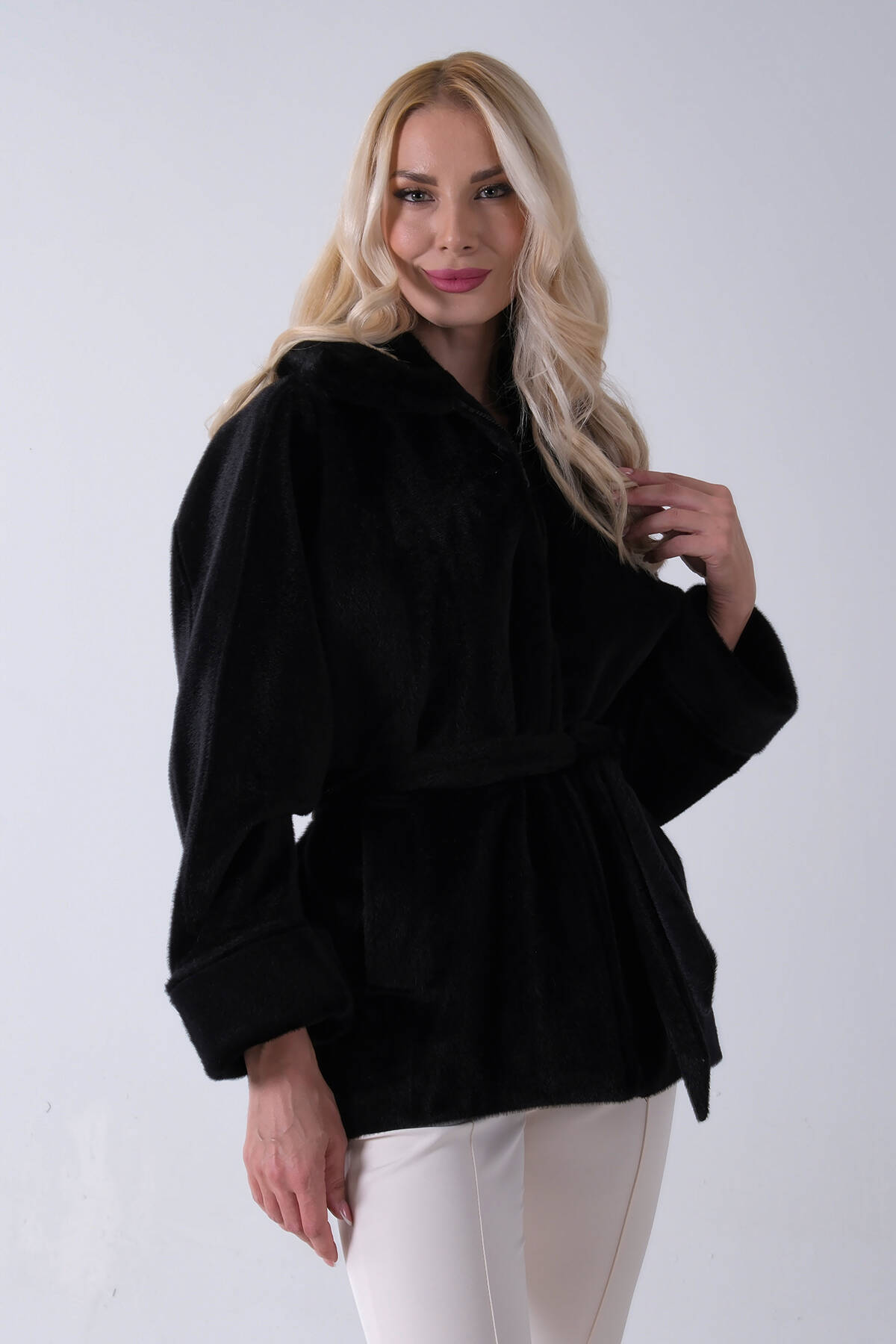 Siyah Yakalı Kendinden Pelerinli Kemerli Deri Ceket 5309366.01