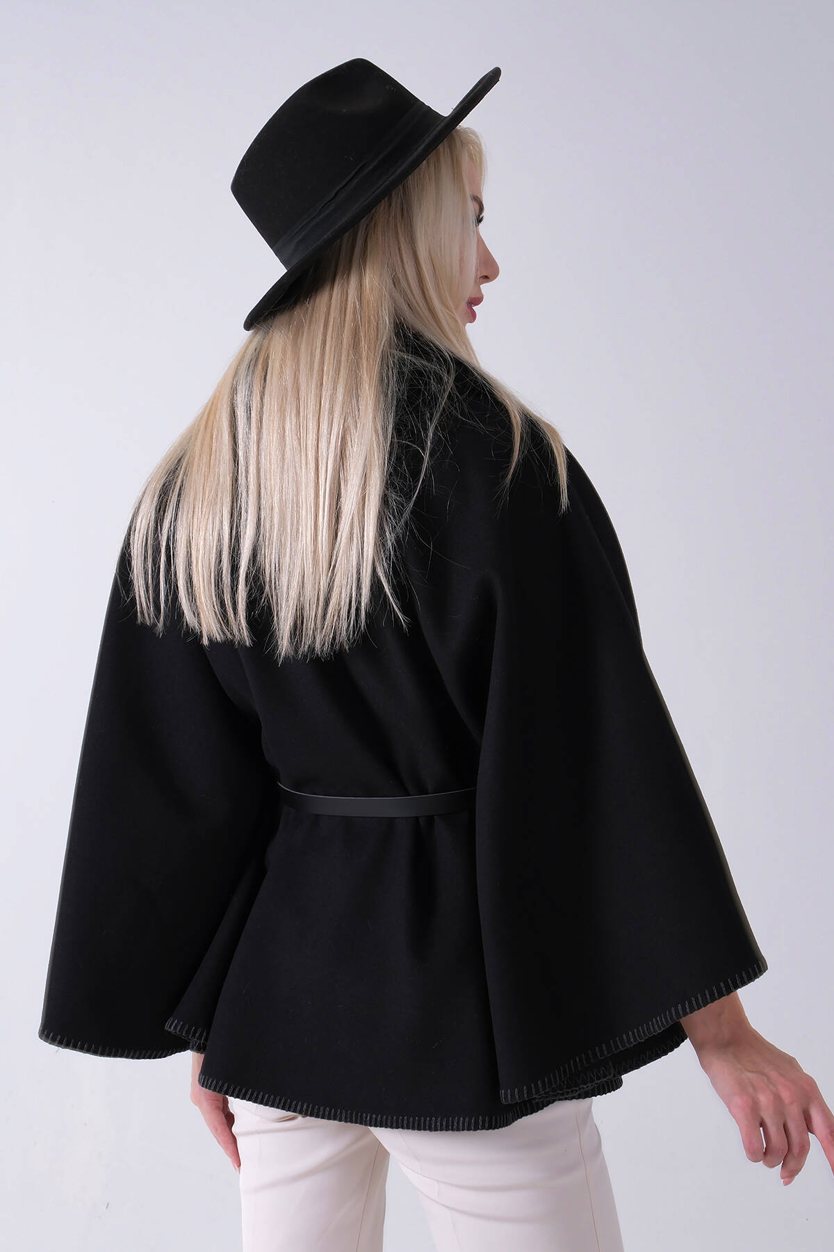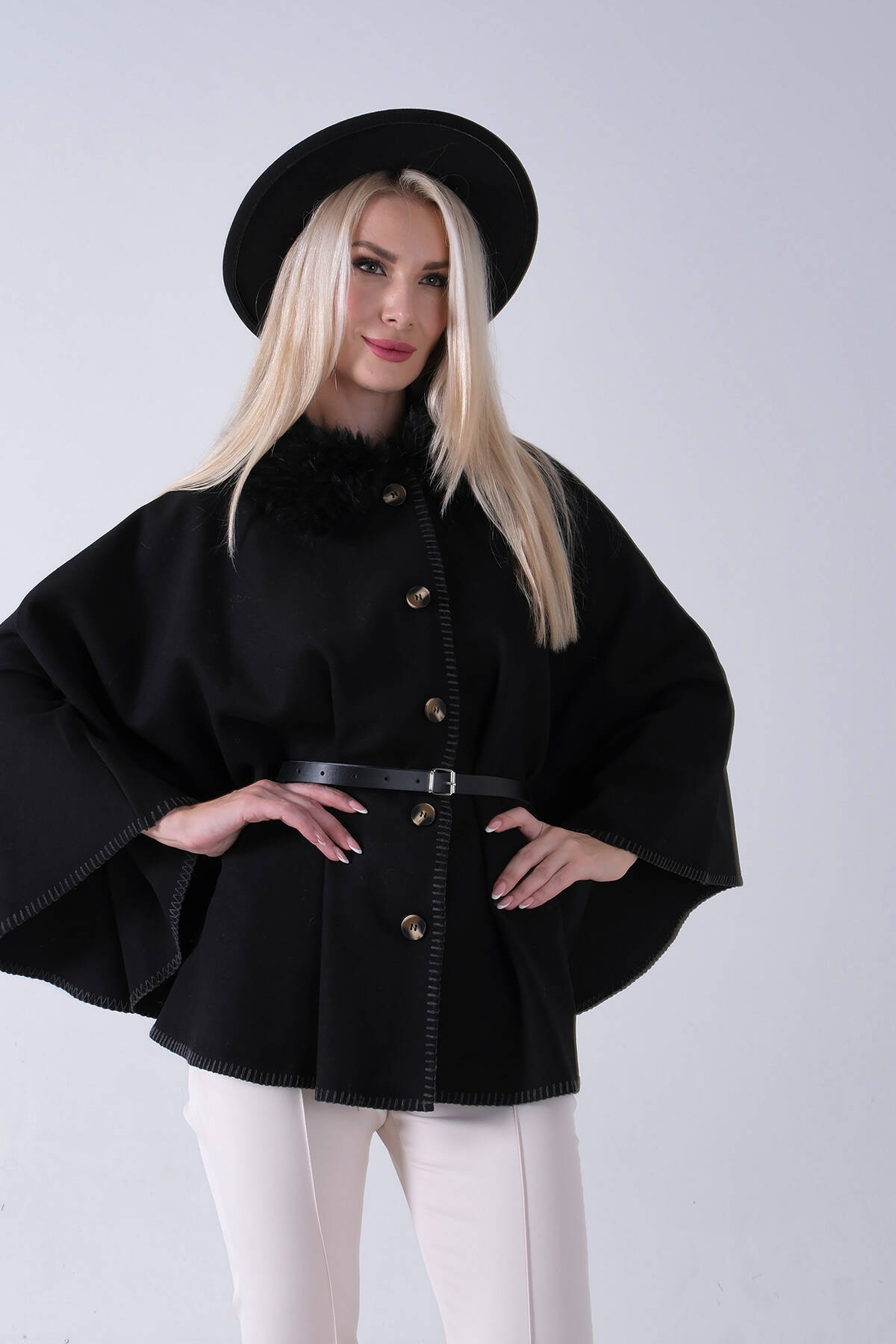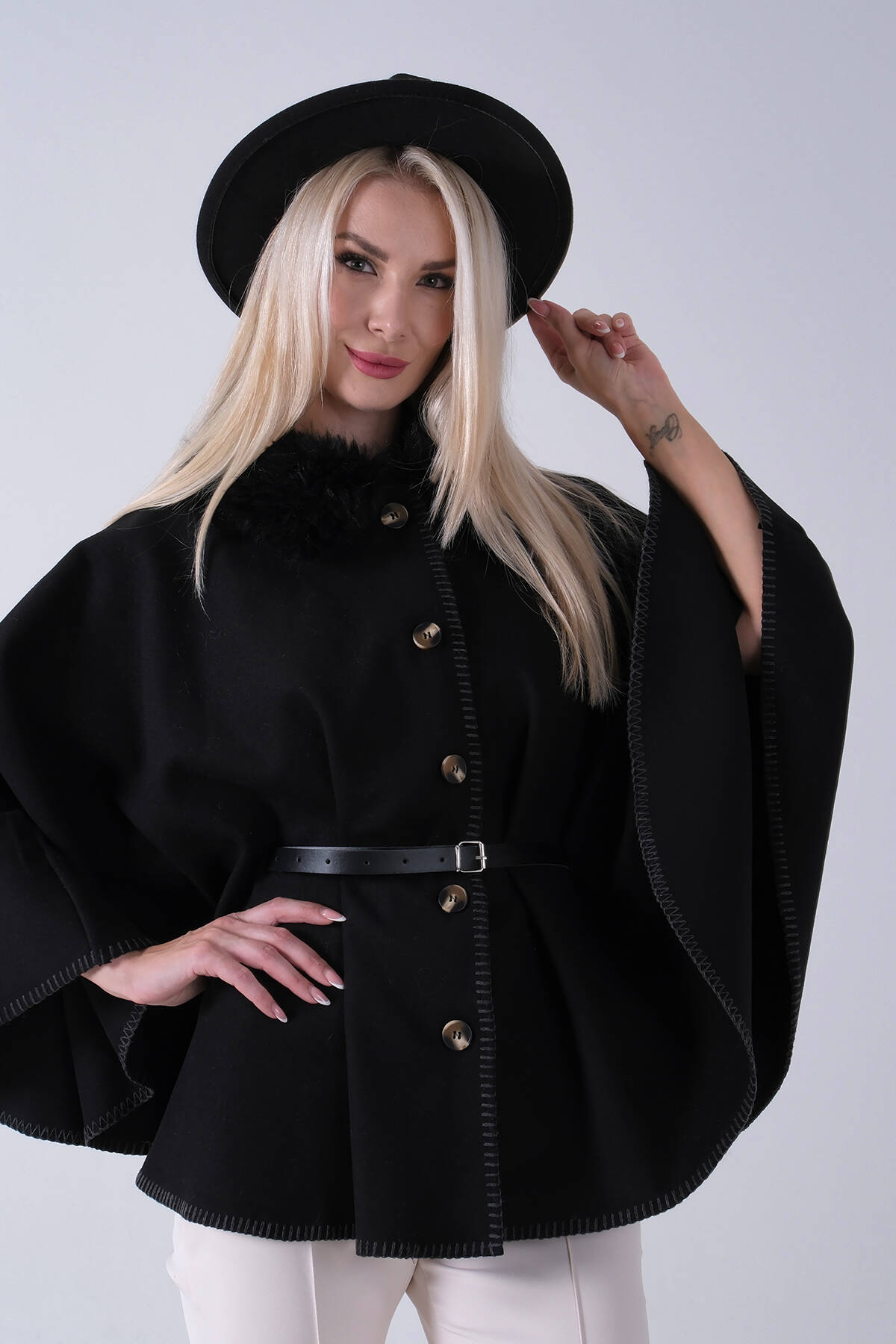 Siyah Yakası Kürklü Dikiş Detaylı Kemerli Panço 47122731.01
