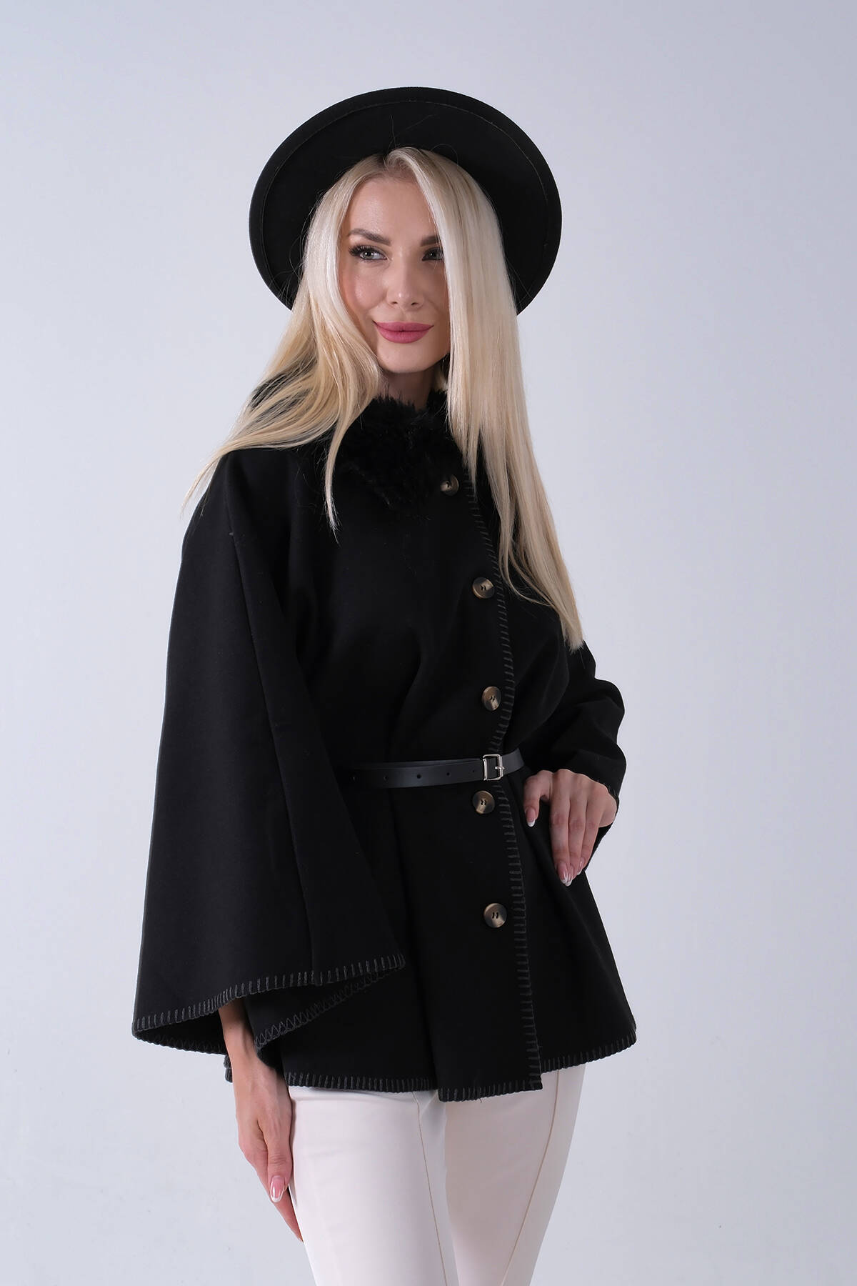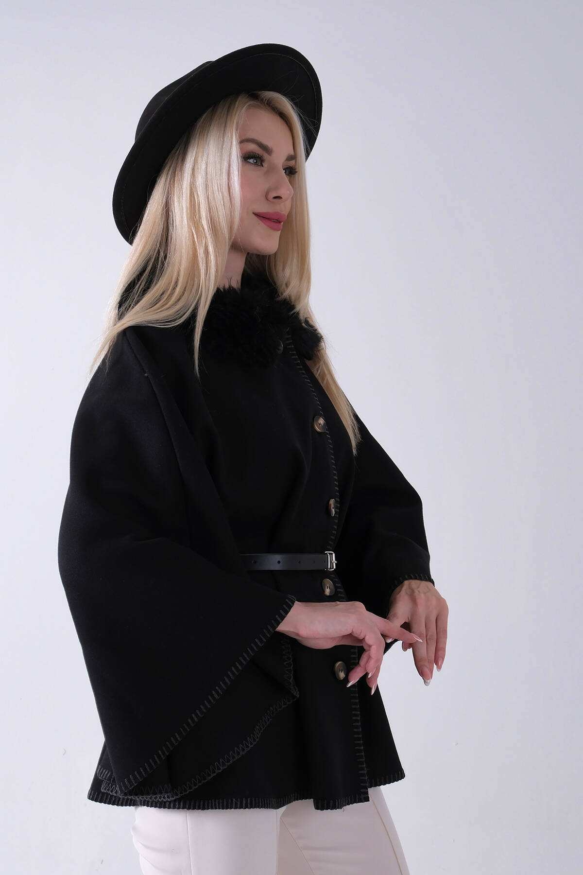 Siyah Önü Düğme Kapamalı Kemerli Yakası Kürklü Panço 47122714.01