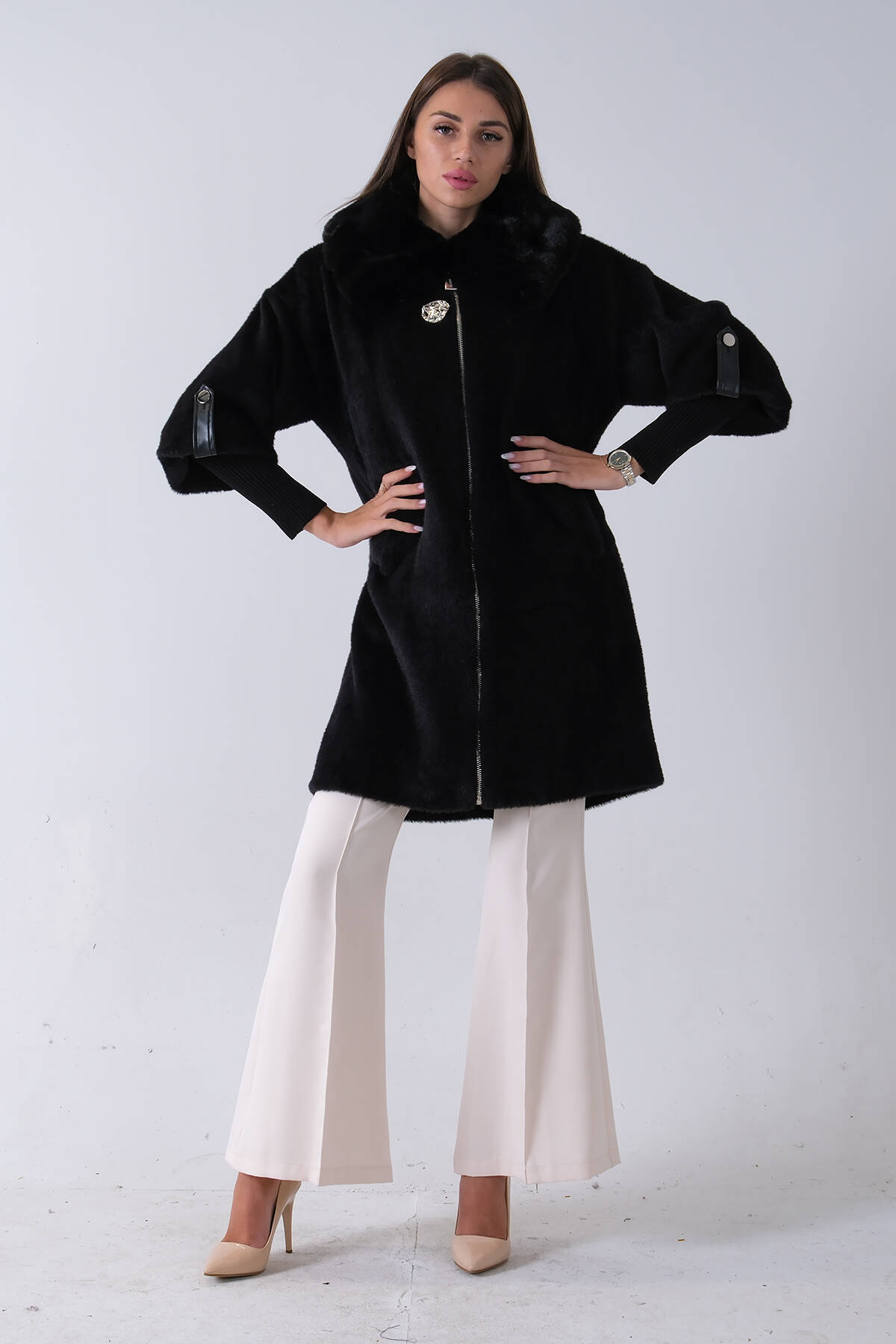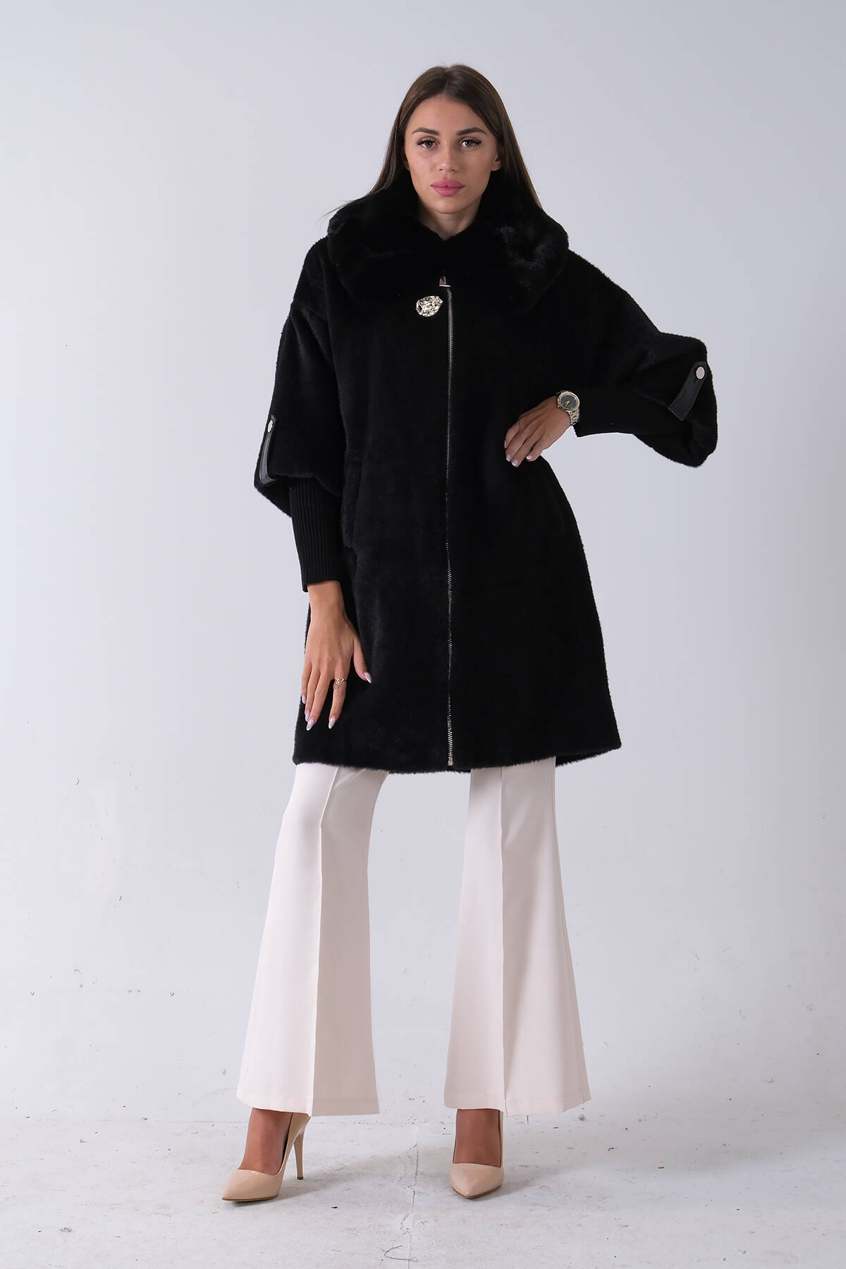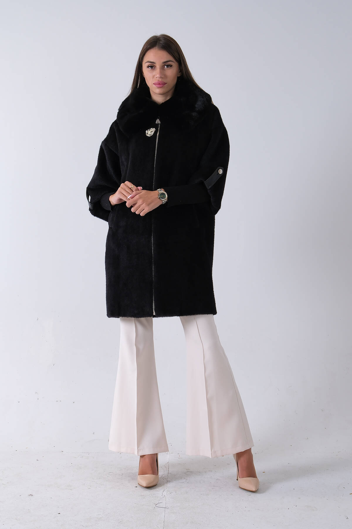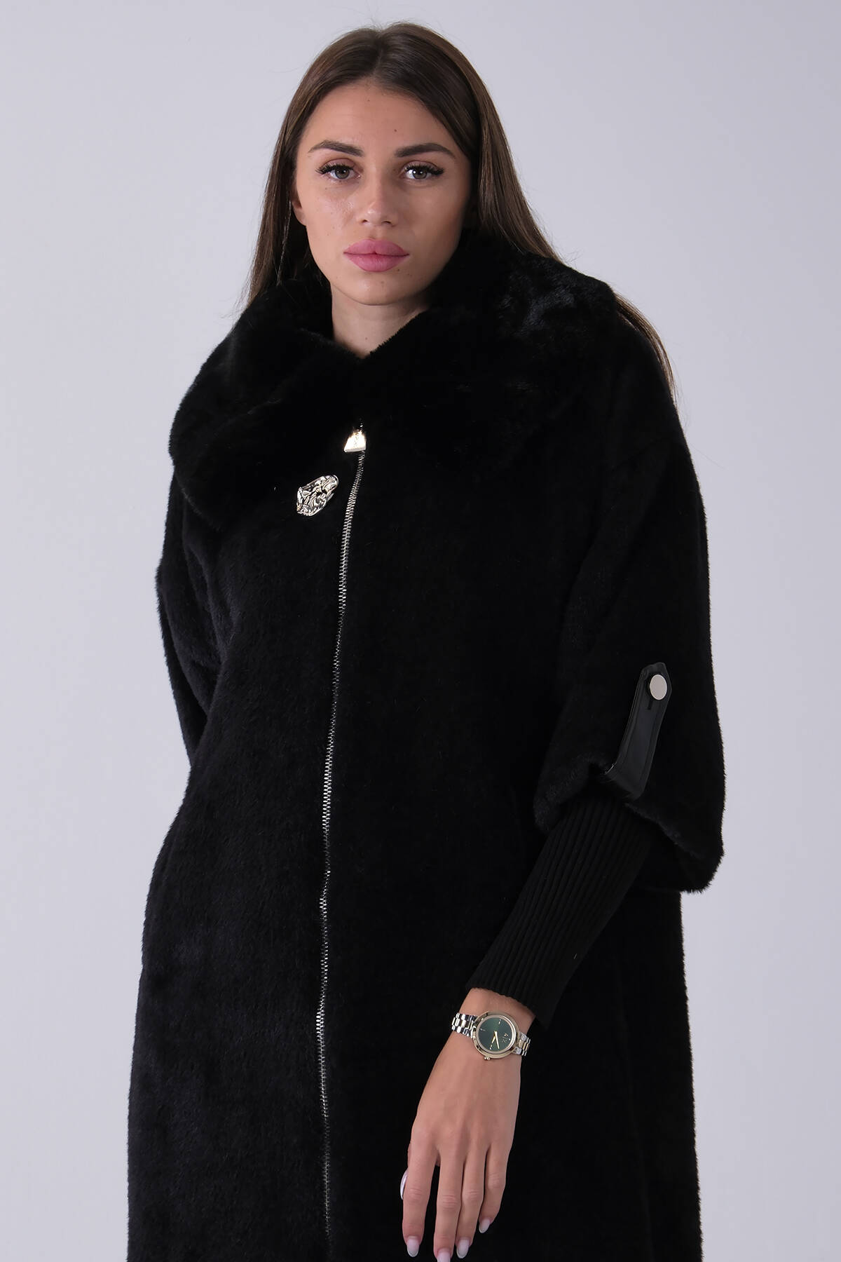 Siyah Yandan Cepli Broş Detaylı Yaka Kürklü Peluş Kaban 44510847.01