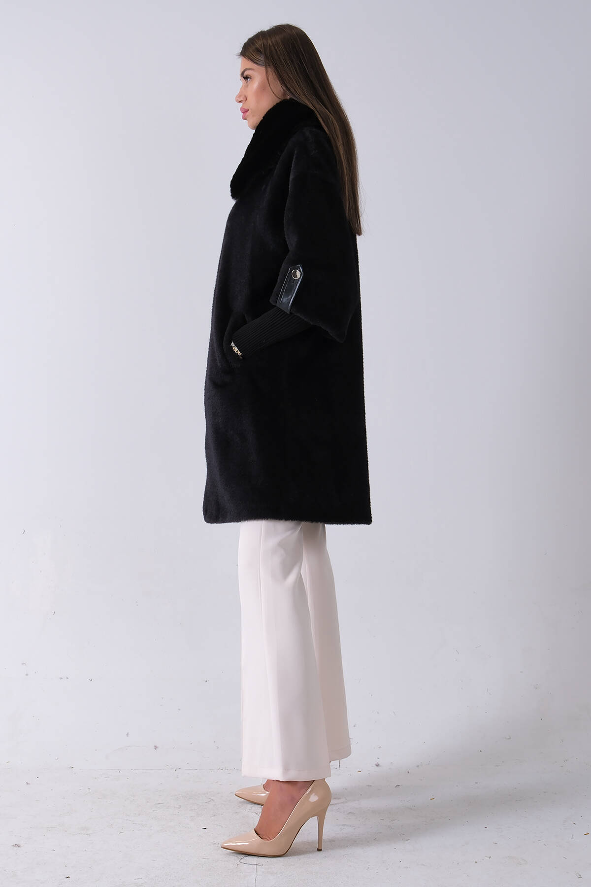 Taş Yandan Cepli Broş Detaylı Yaka Kürklü Peluş Kaban 44510847.50