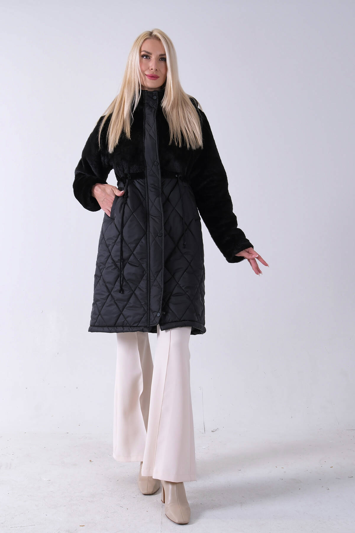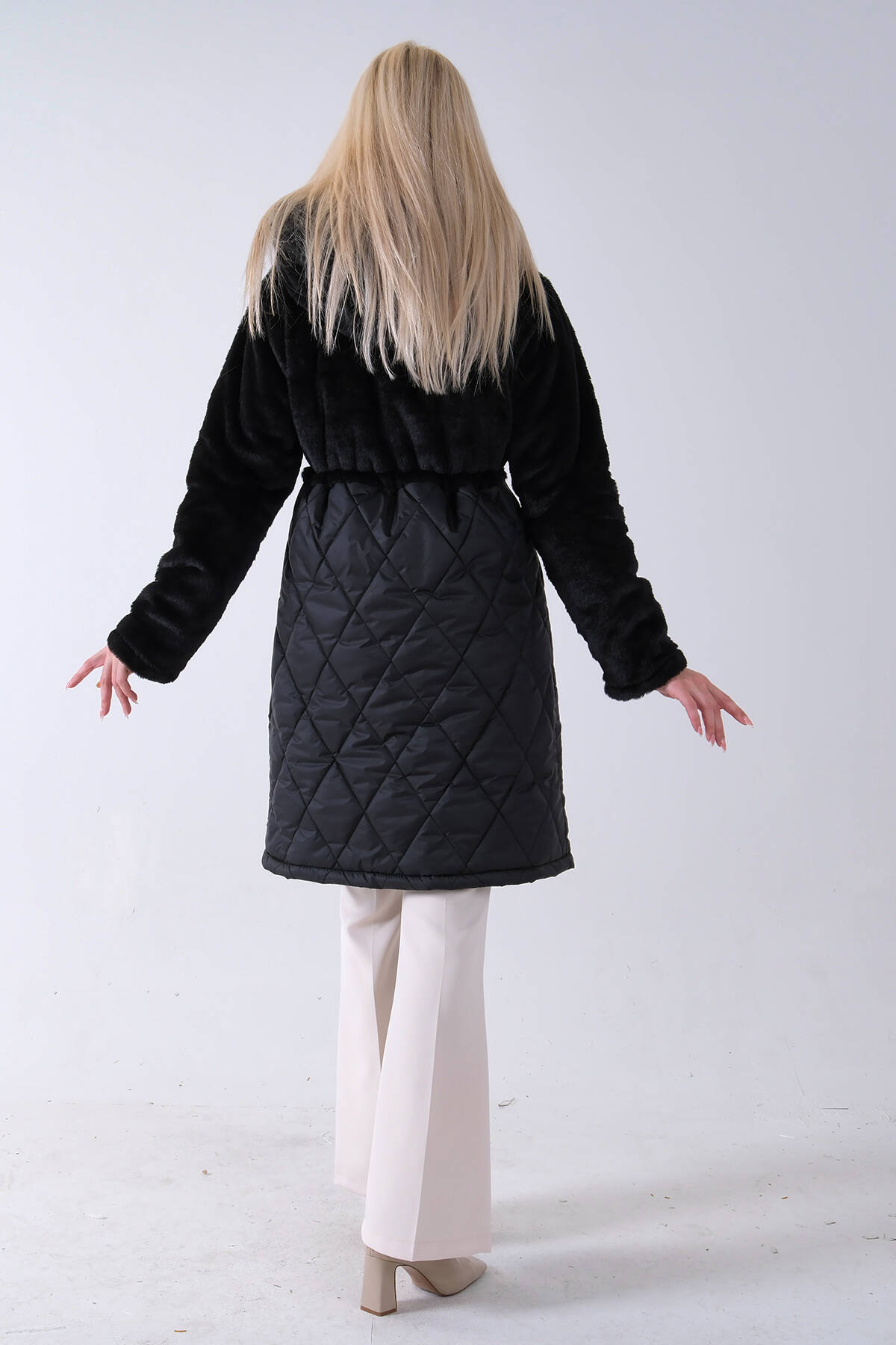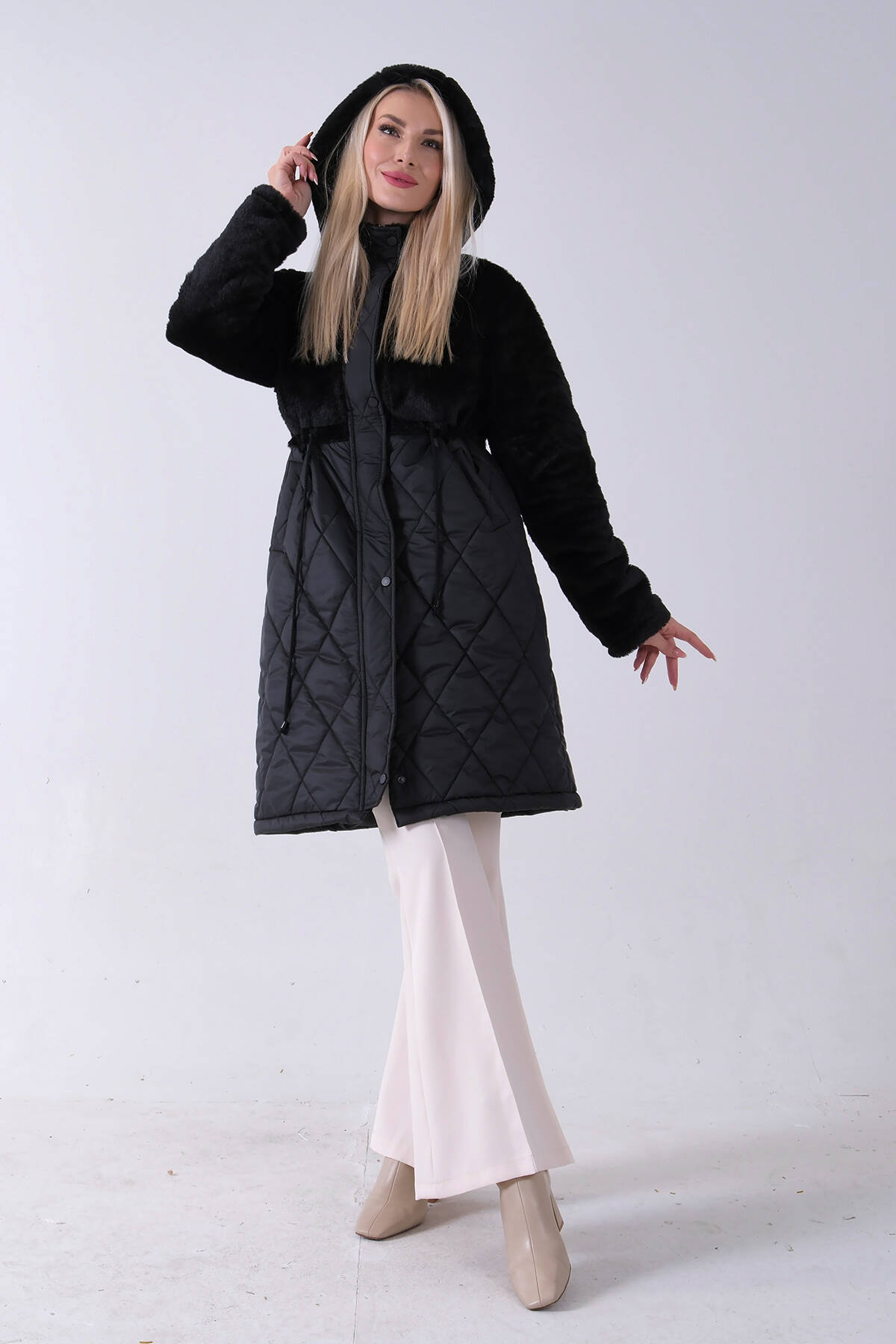 Siyah Yarım Peluş Detaylı Belden Sıktırmalı Kapüşonlu Baklava Desen Mont 44520211.01