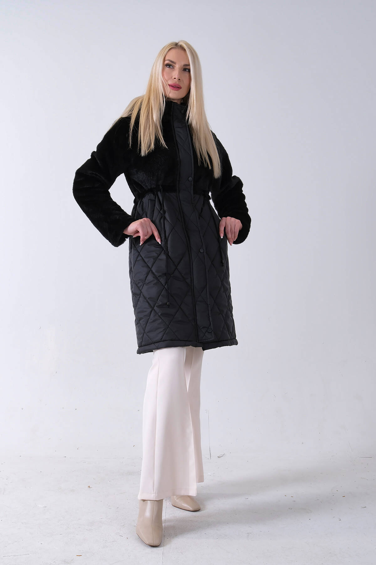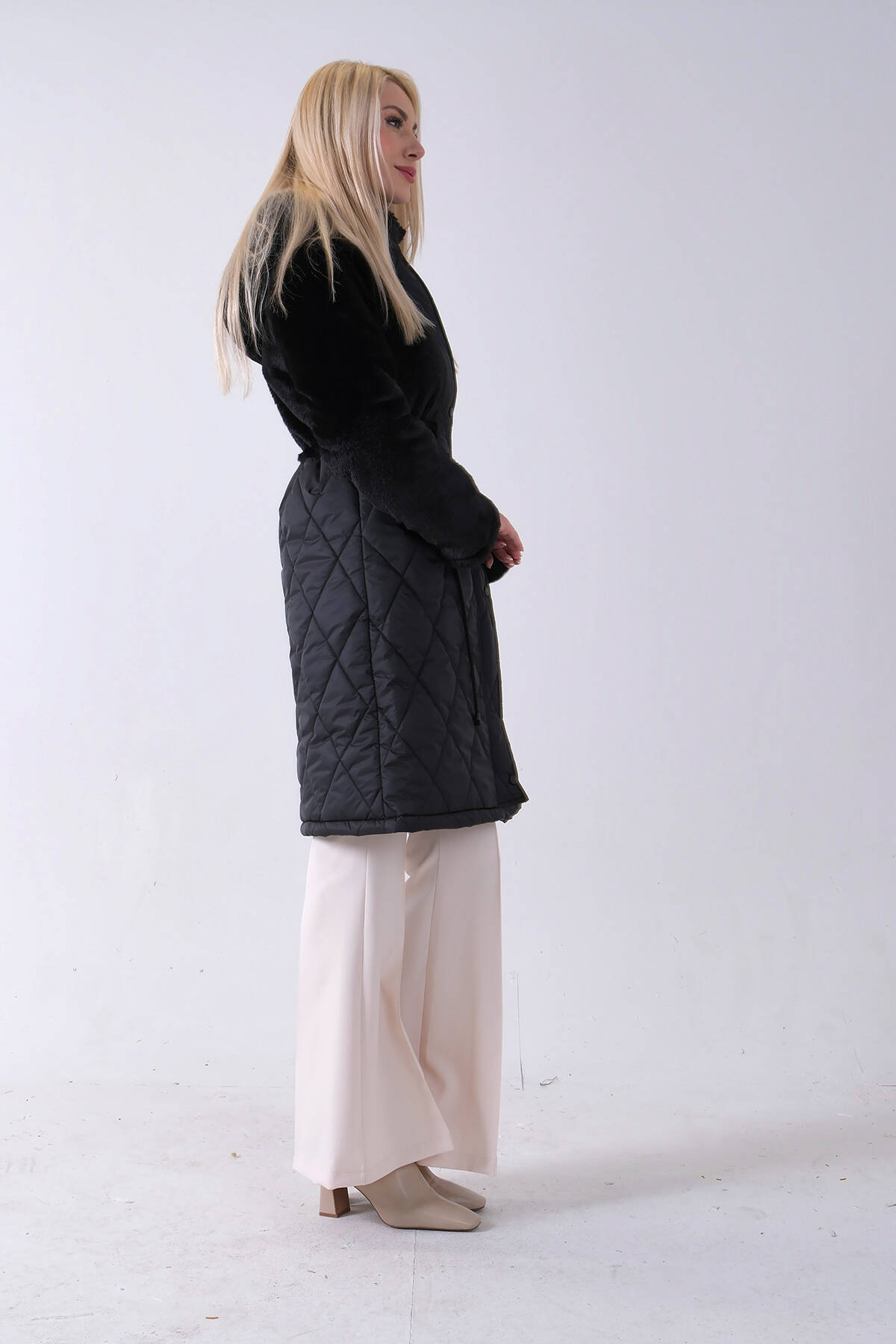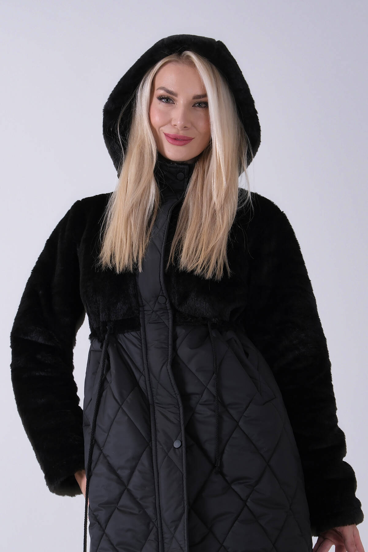 Siyah Yarım Peluş Detaylı Belden Sıktırmalı Kapüşonlu Baklava Desen Mont 44520211.01