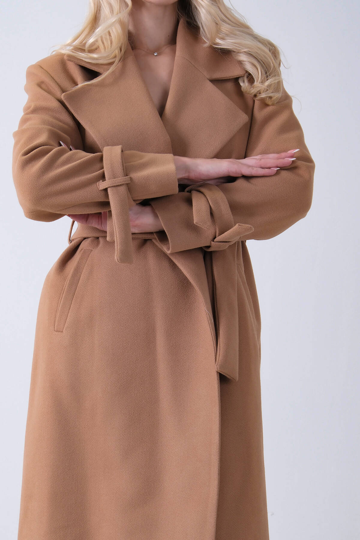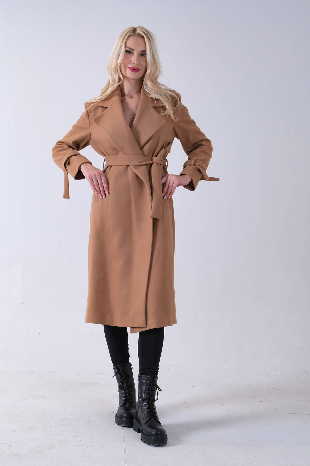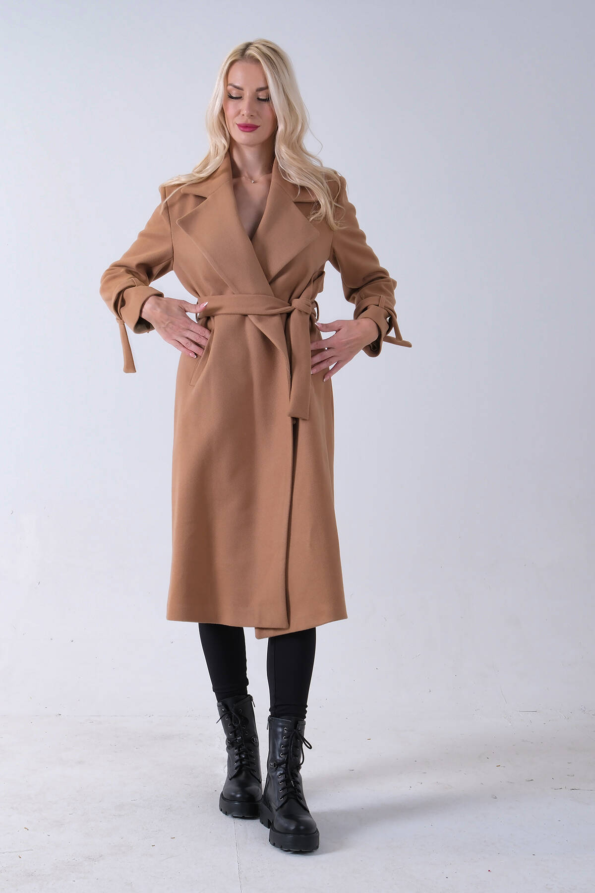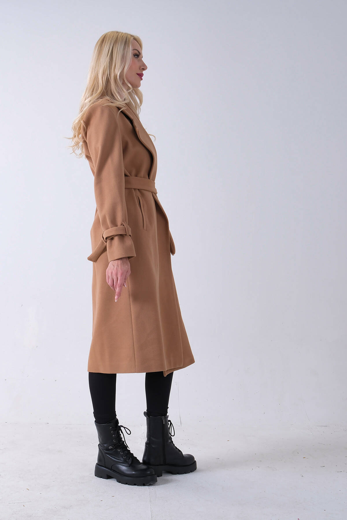 Sütlü Kahve Kol Bağlamalı Seyyar Kuşaklı Uzun Kaşe Kaban 41630051.374