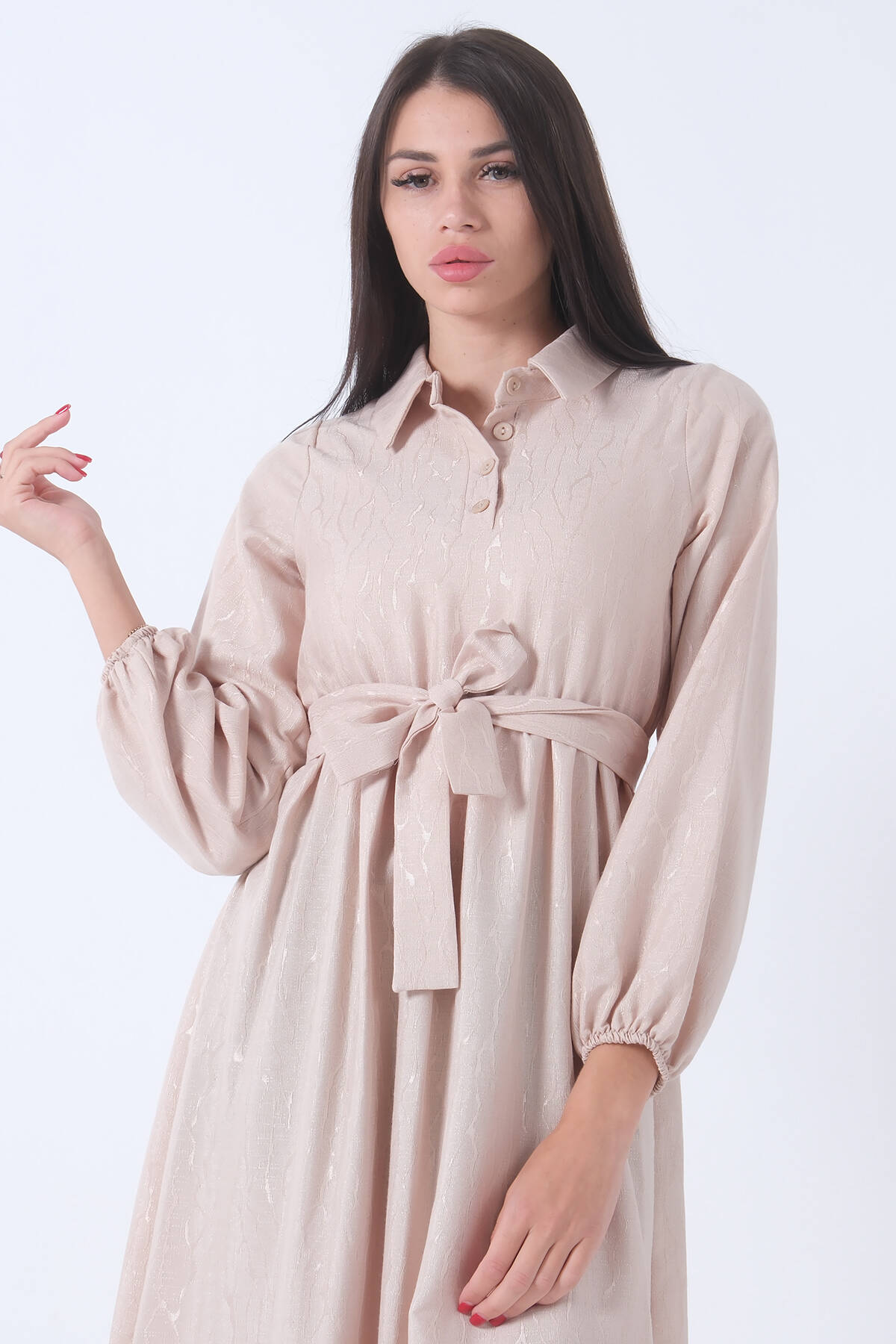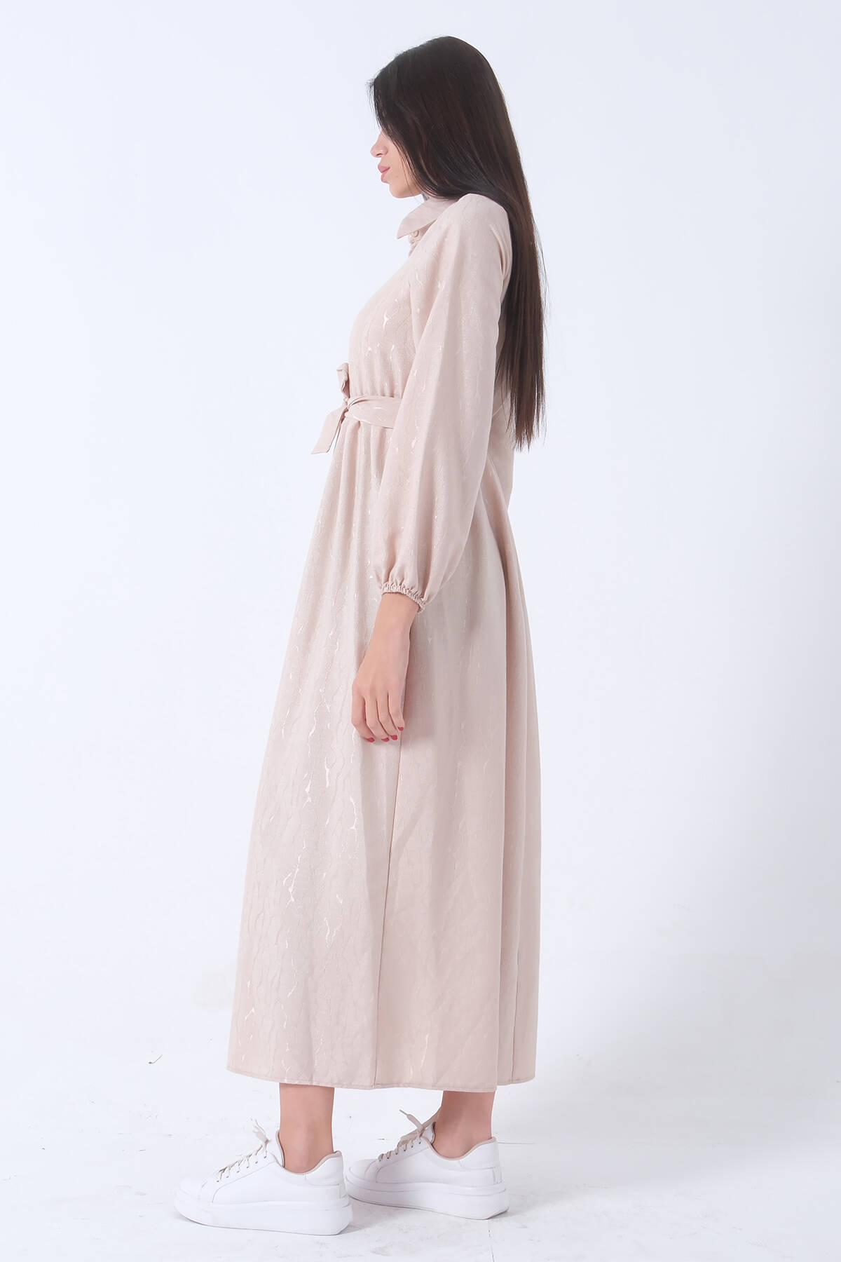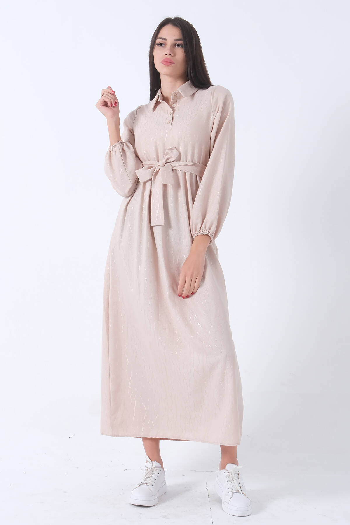 Taş Beli Lastikli Gömlek Yaka Kuşaklı Tesettür Elbise 4593296.50