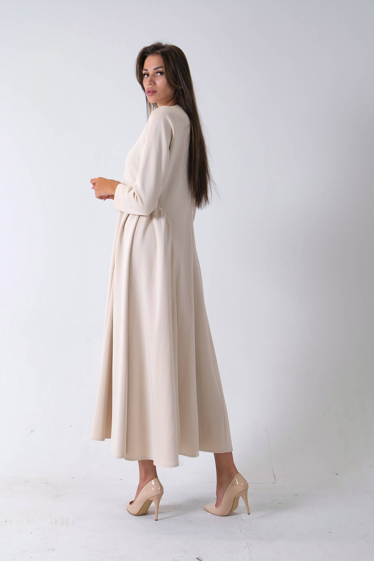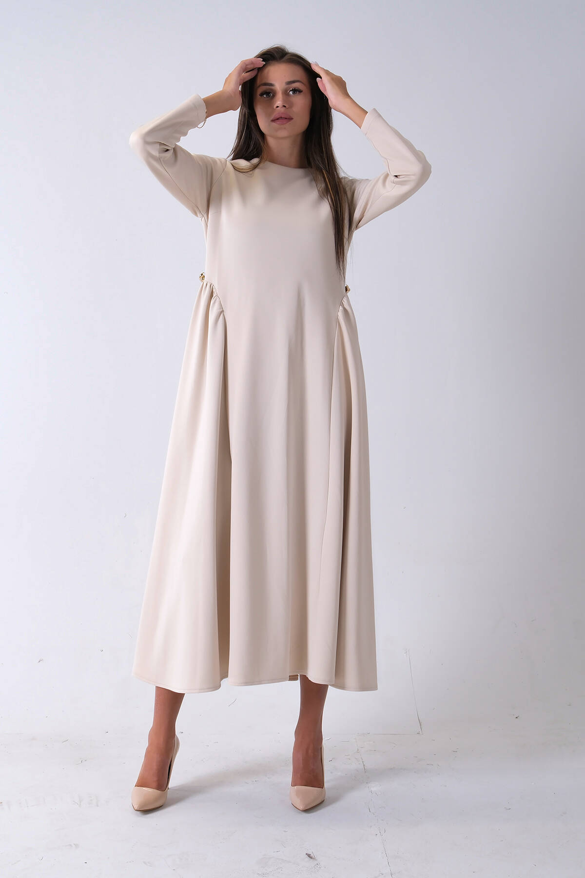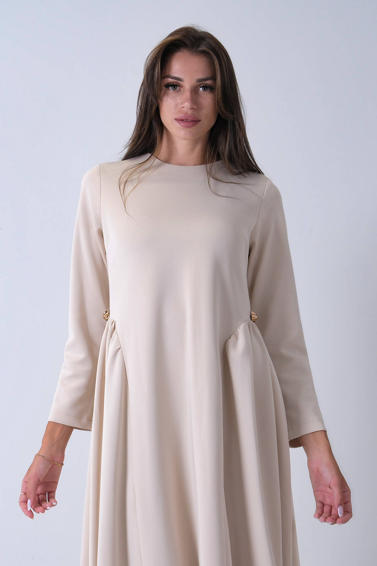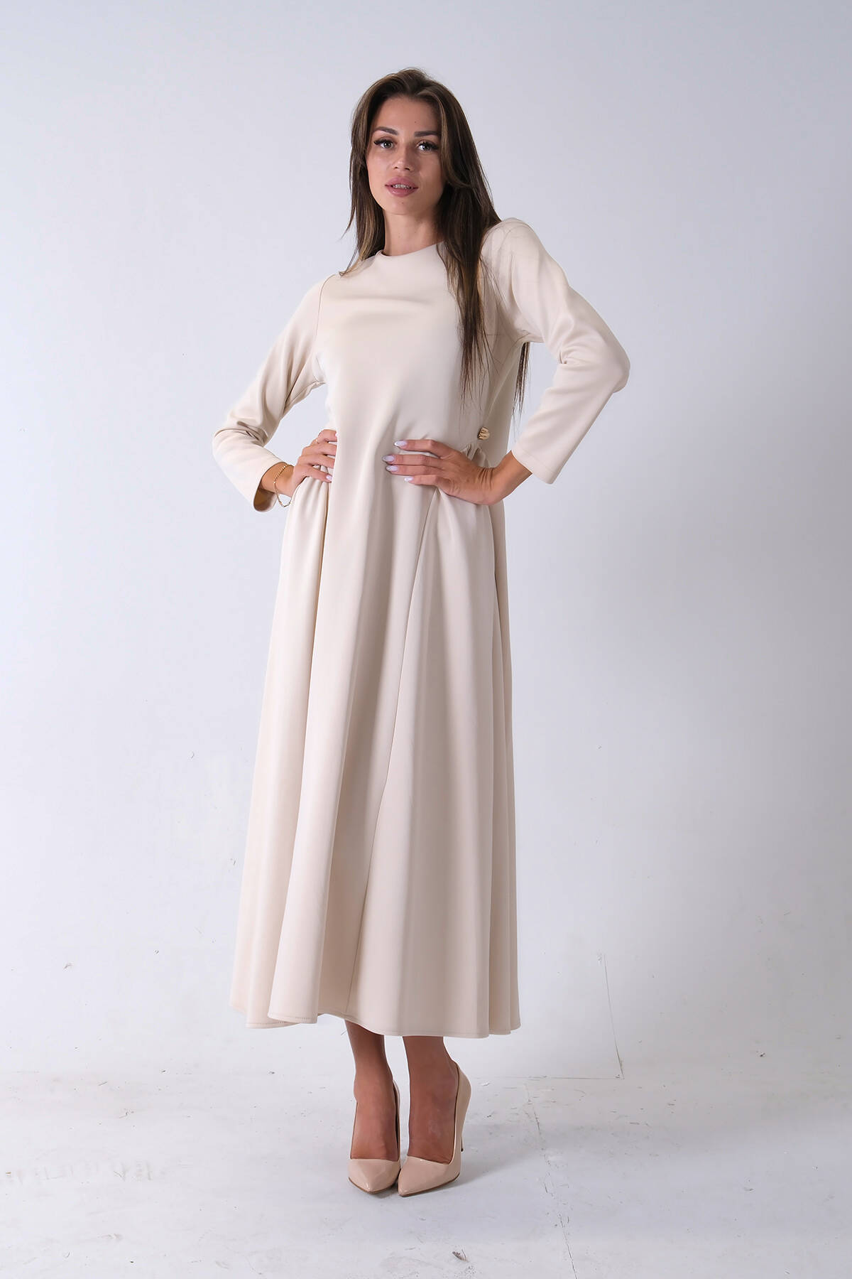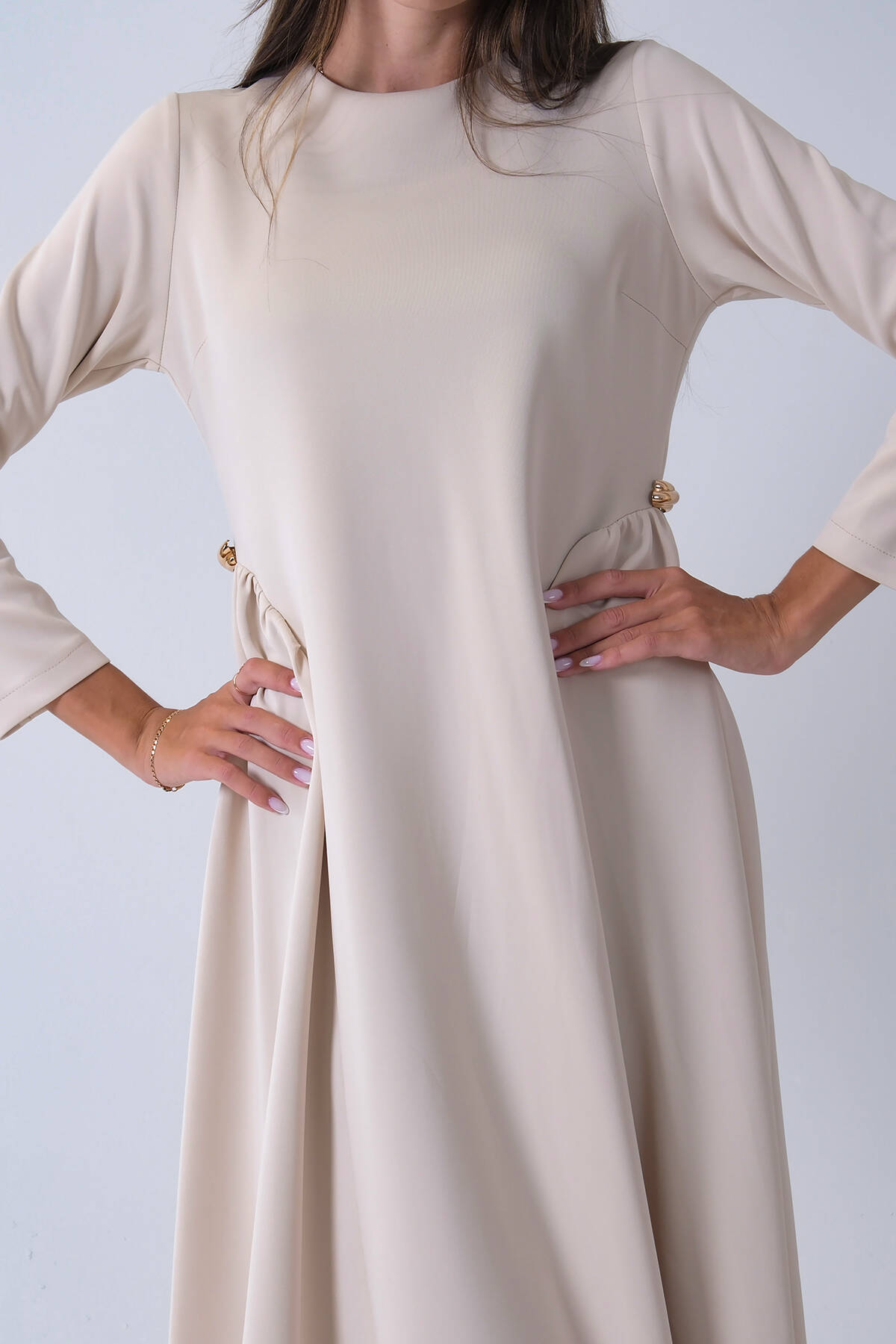Bej Bisiklet Yaka Kendinden Şal Detaylı Broşlu Bel Bağlamalı Elbise 4571580.55
