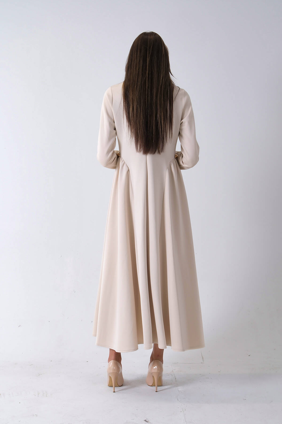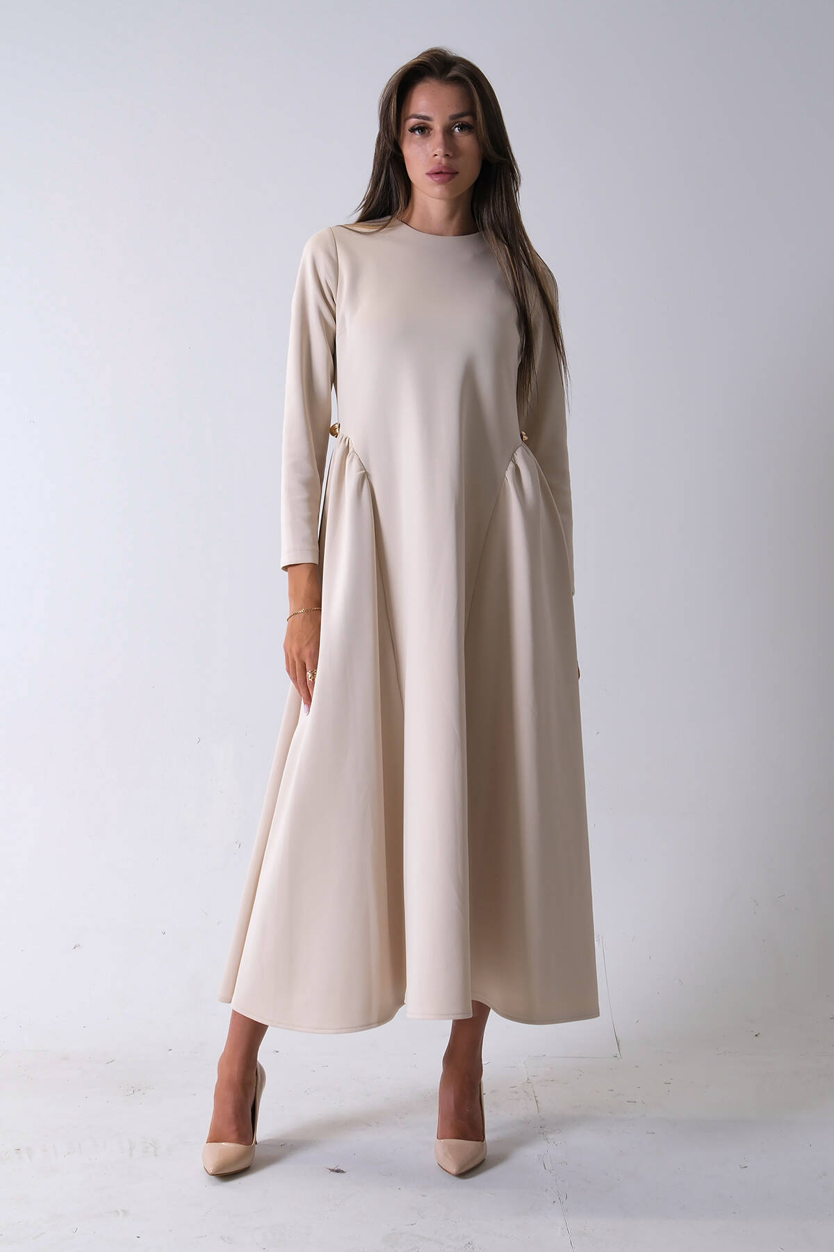 Bej Belden Bağlamalı Yaka Fırfır Detaylı Düğme Kapamalı Elbise 4571574.55