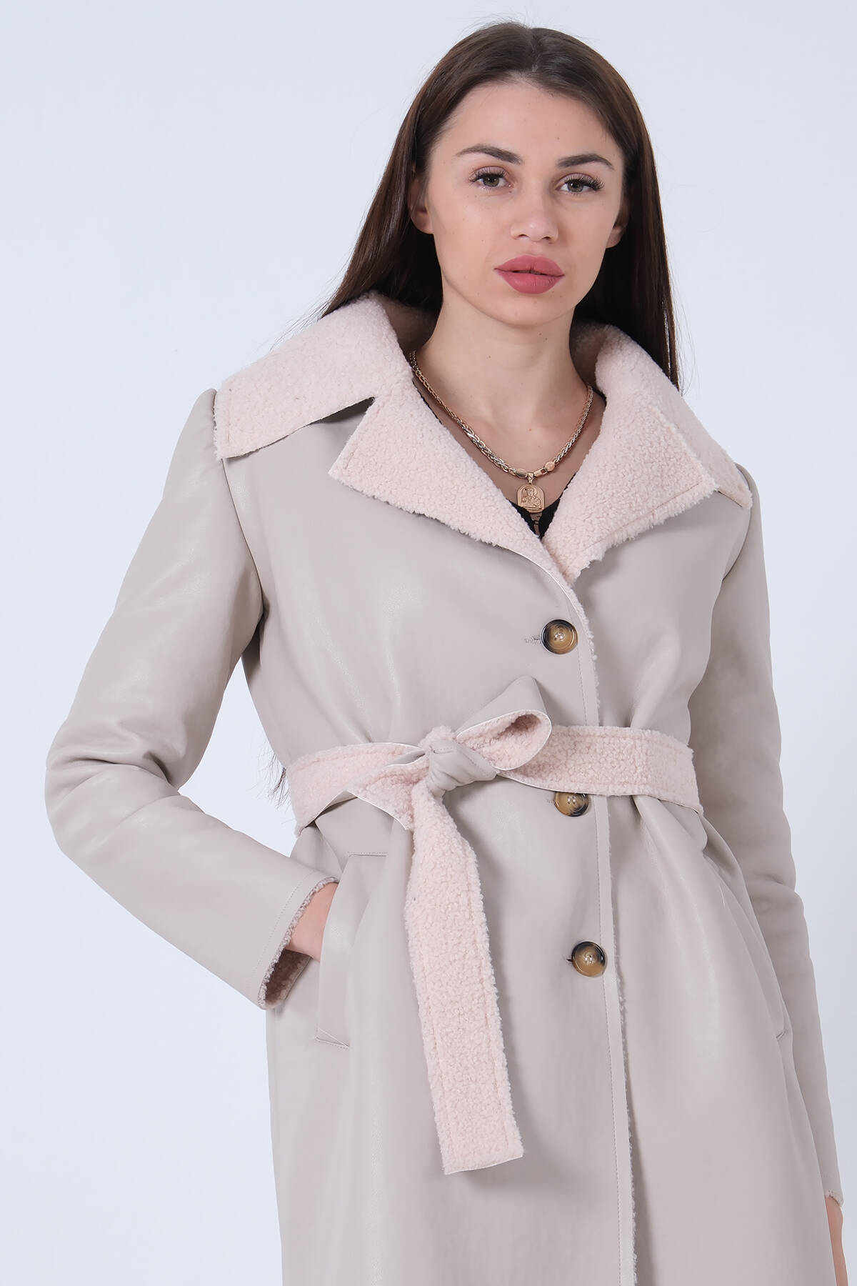 Taş Yandan Cepli Broş Detaylı Yaka Kürklü Peluş Kaban 44510847.50