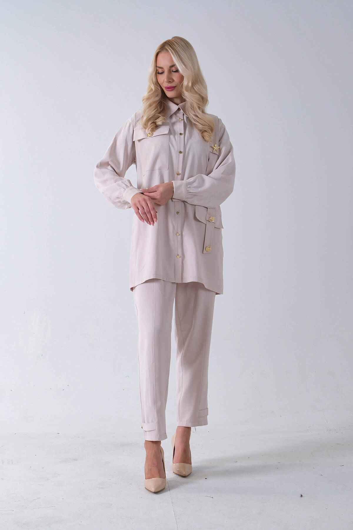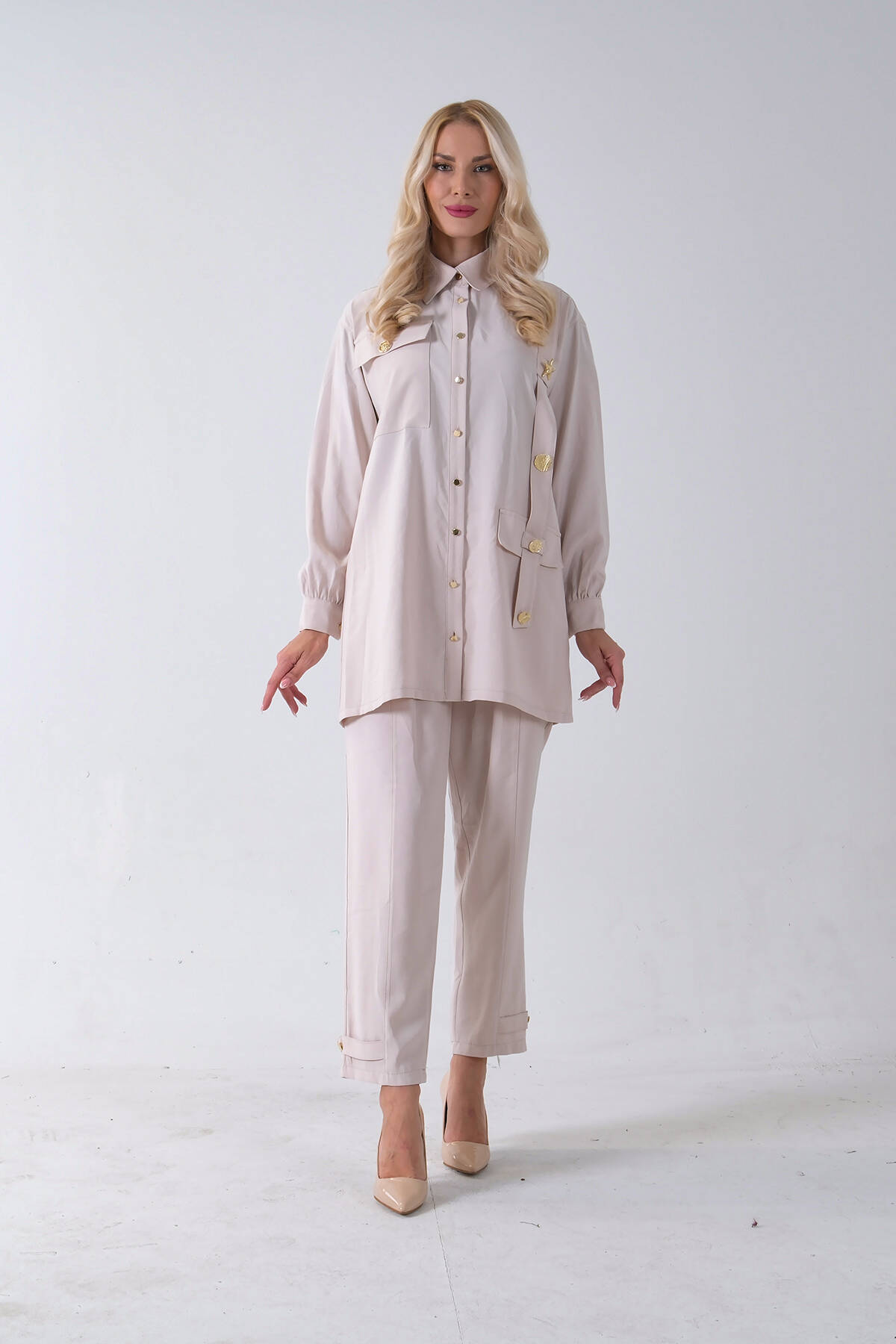 Haki Yaka ve Pantolon Paçası Taş Detaylı Tunikli Takım 4703048.23