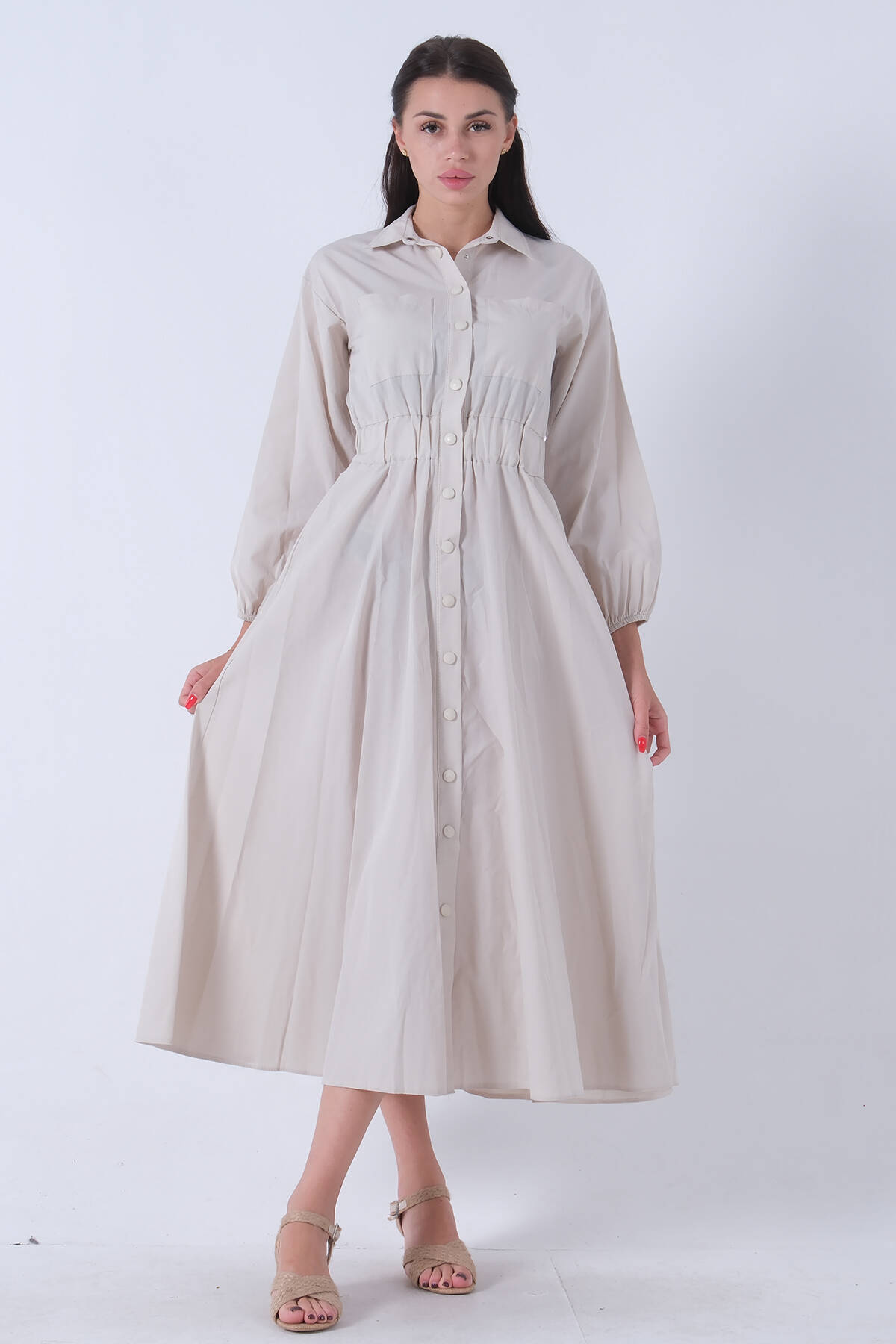 Bej Belden Bağlamalı Yaka Fırfır Detaylı Düğme Kapamalı Elbise 4571574.55