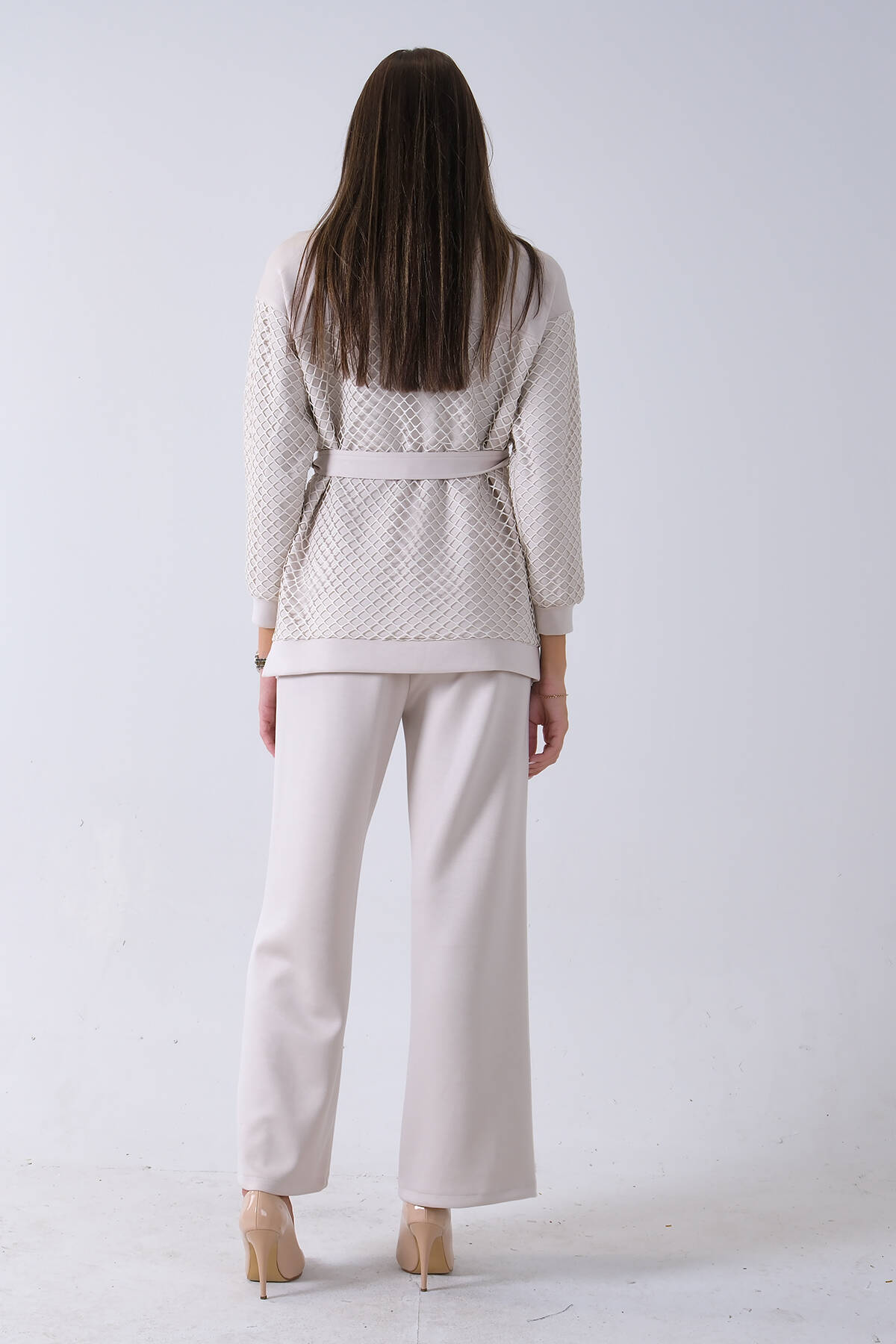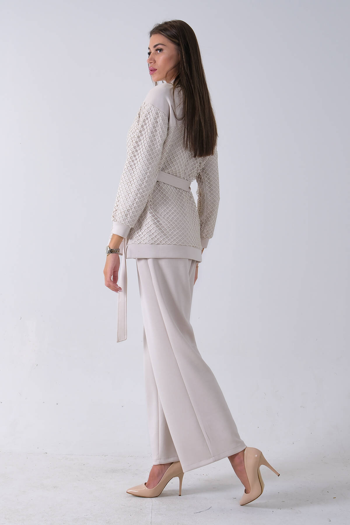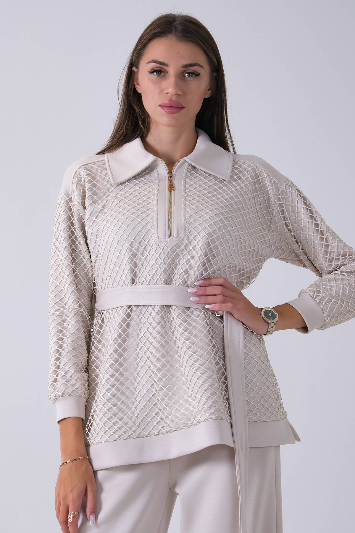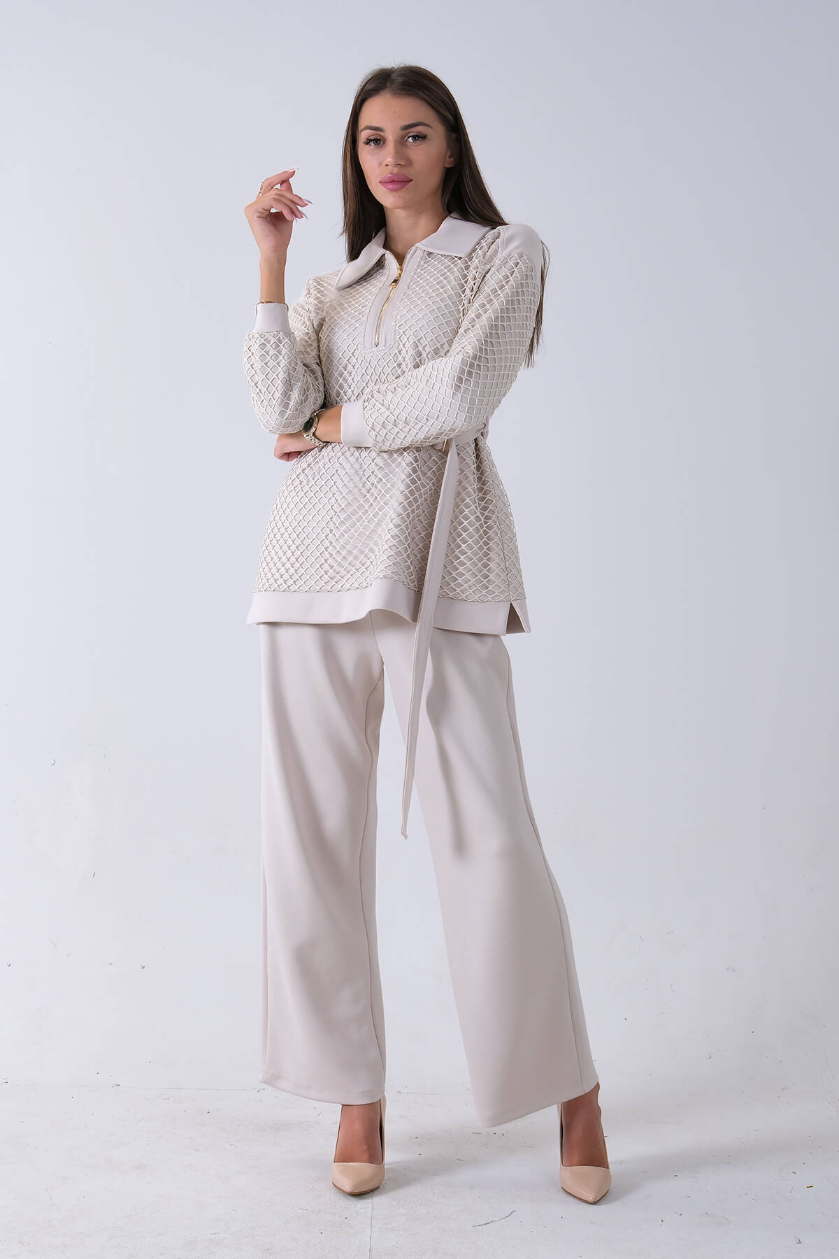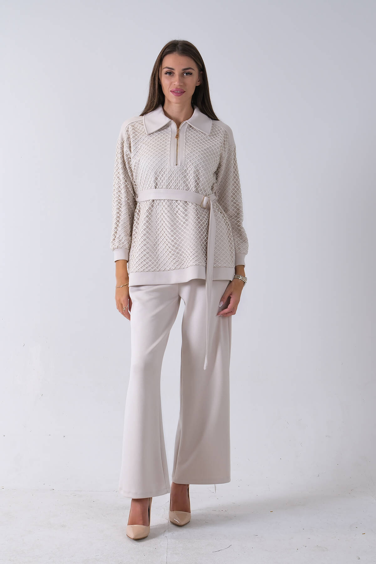 Taş Tunik Yaka Fermuar Kapamalı File Detaylı Pantolonlu Takım 4577283.50