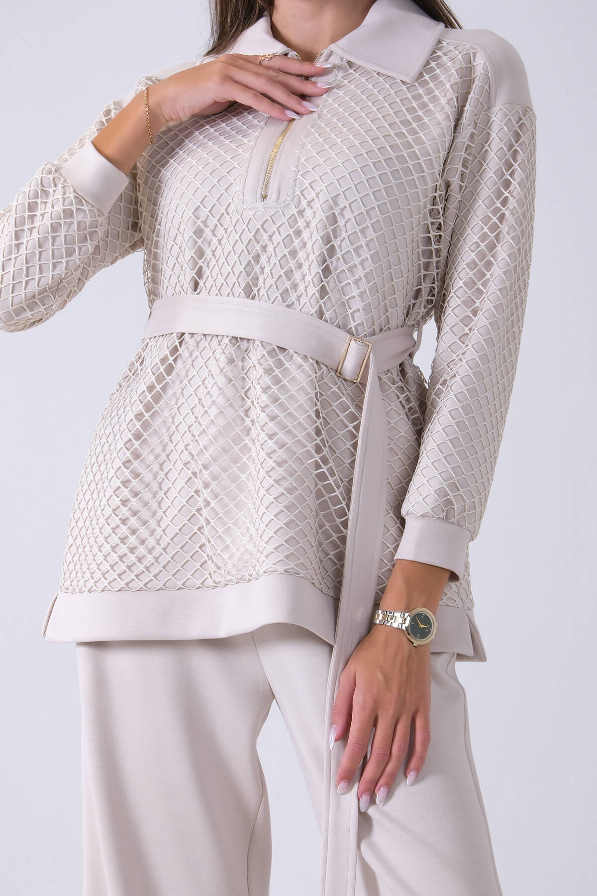 Gold Tunik Yaka Fermuar Kapamalı File Detaylı Pantolonlu Takım 4577283.122