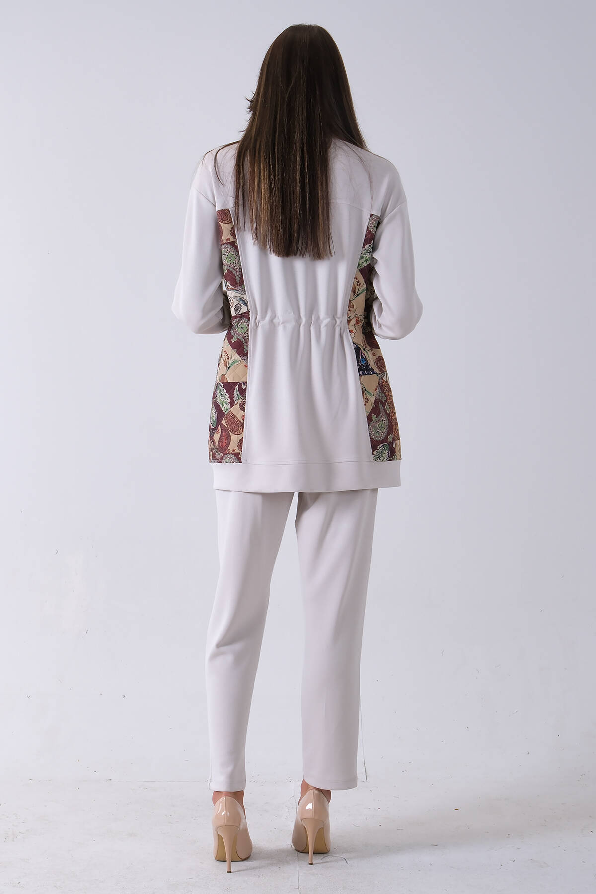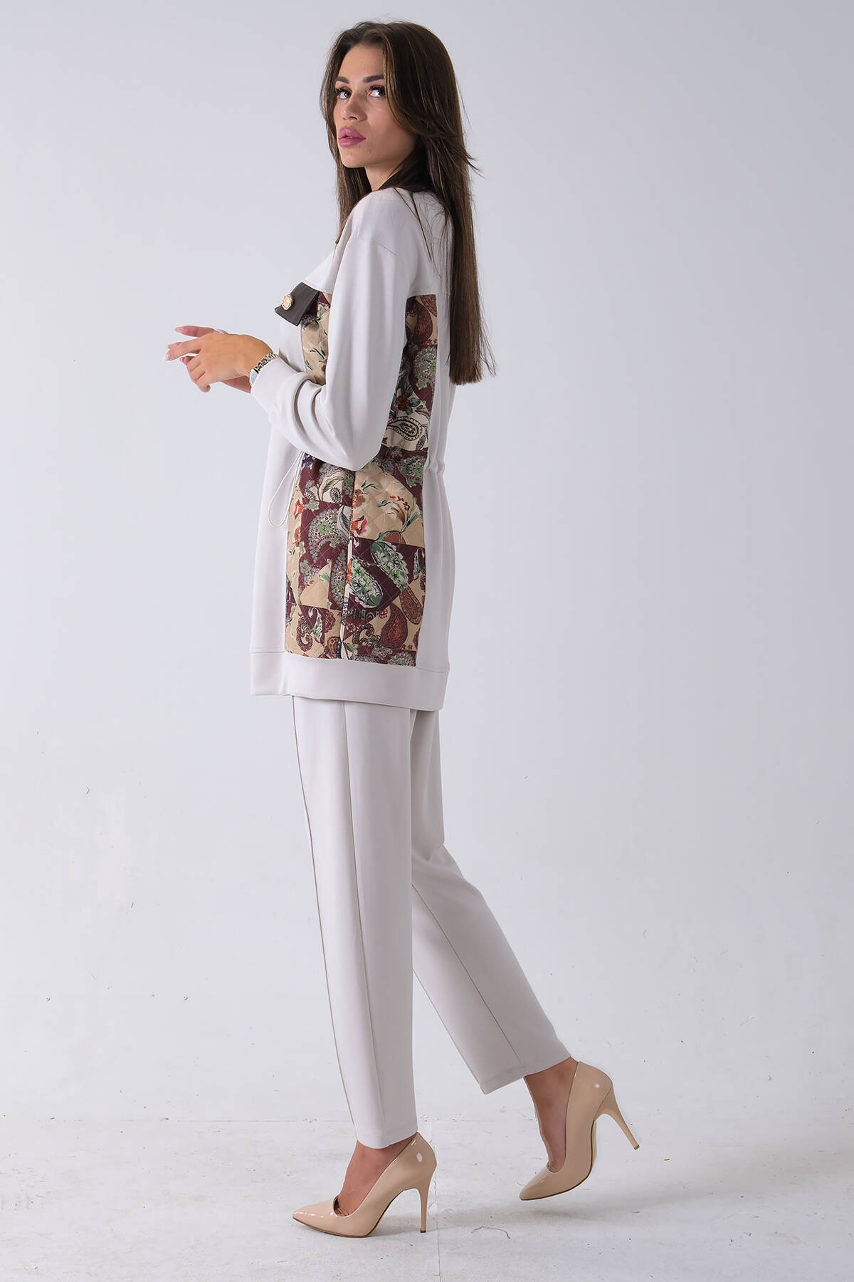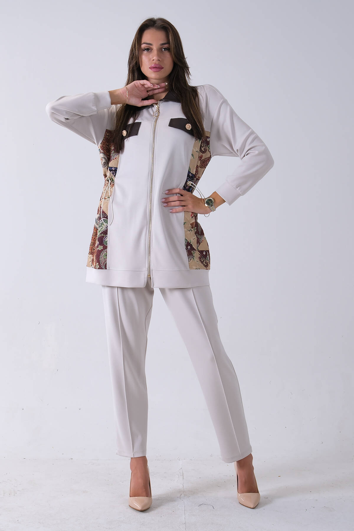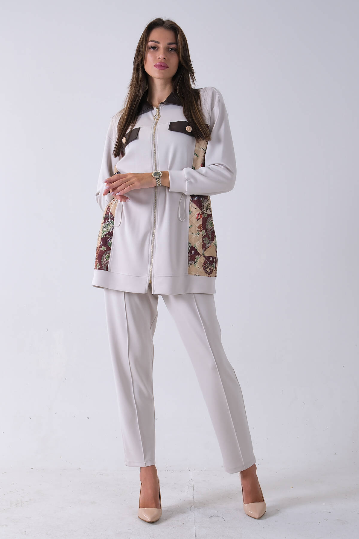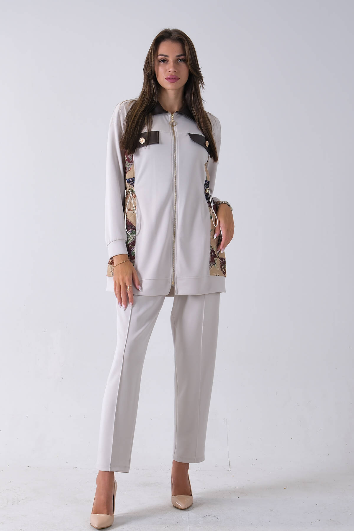 Taş Üzeri Desenli Yaka Deri Detaylı Fermuar Kapamalı Tunik Pantolonlu Takım 4703058.50